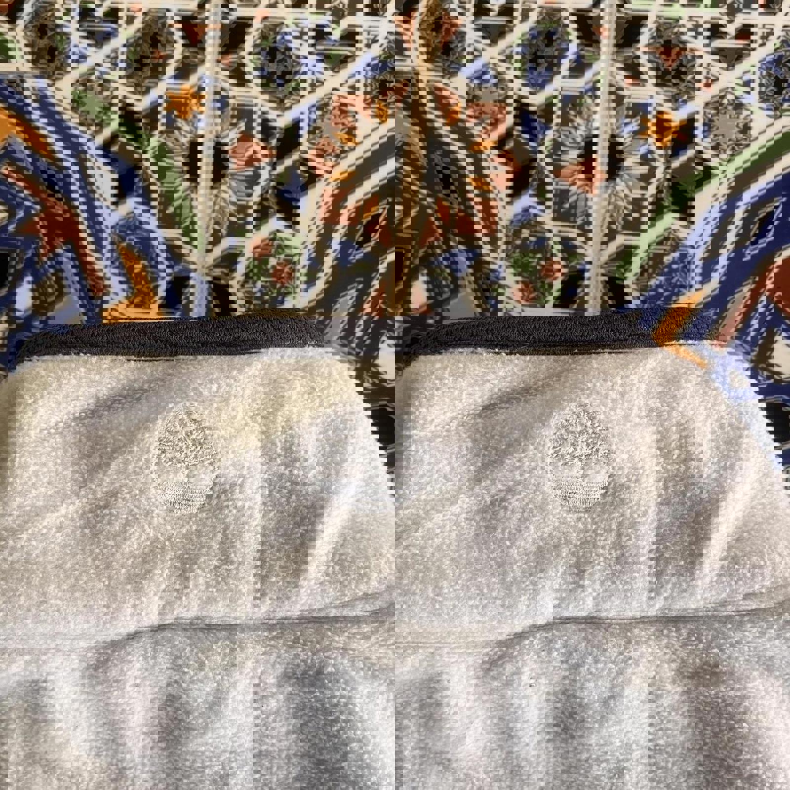 white timberland fleece sweater jacket with black piping accents, pockets on the sides, and white embroidered tree logos on the chest and back collar