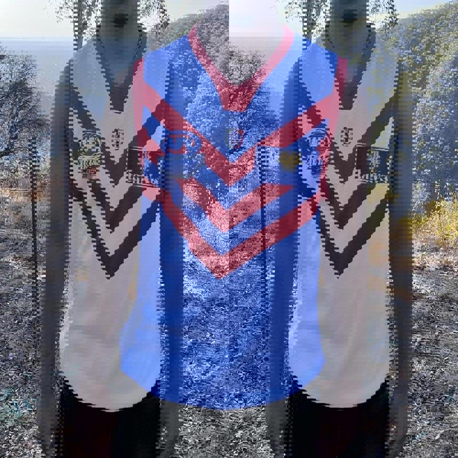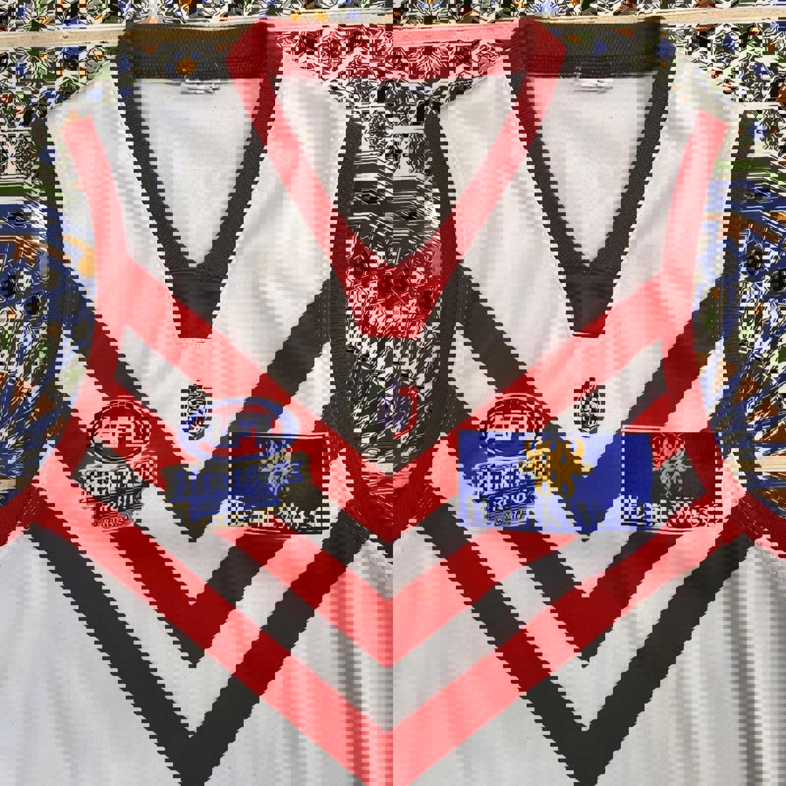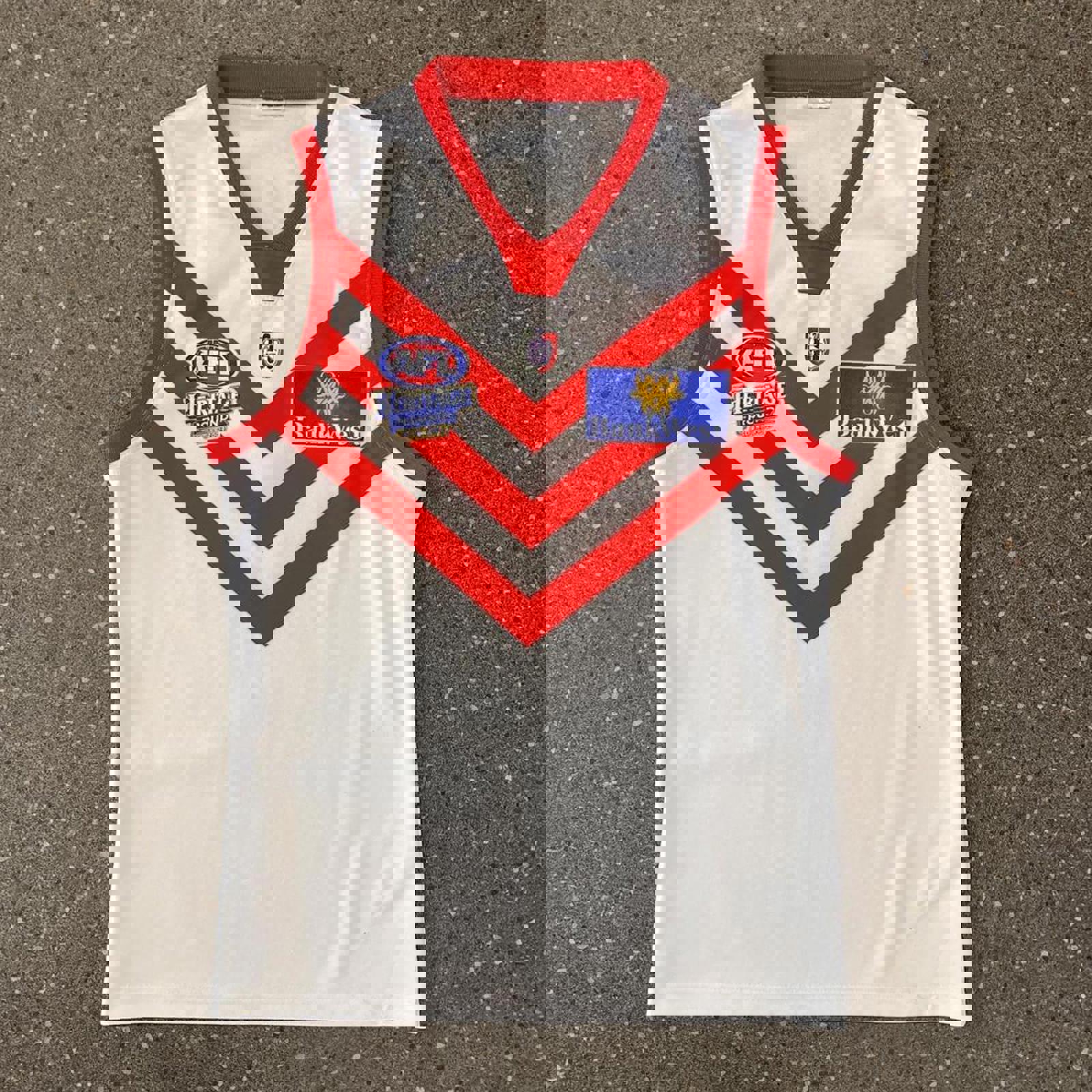 White and red 04 heritage round freo Guernsey based on south Fremantle football club which combined with east Fremantle football club to create the freo dockers