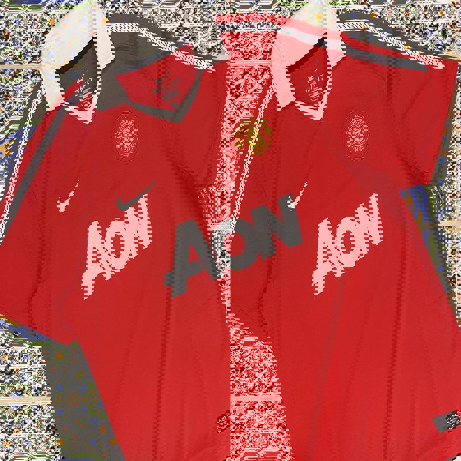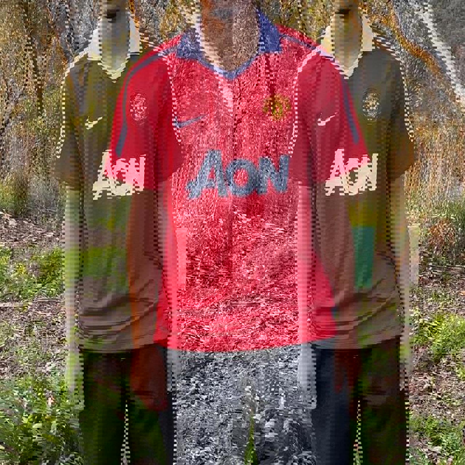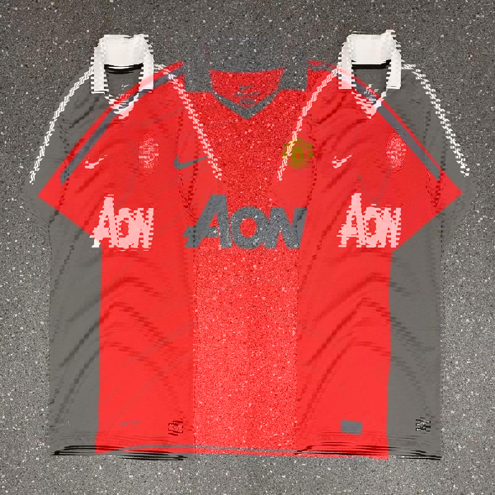 red nike 2010-2011 manchester united kit with AON nike and club logoing