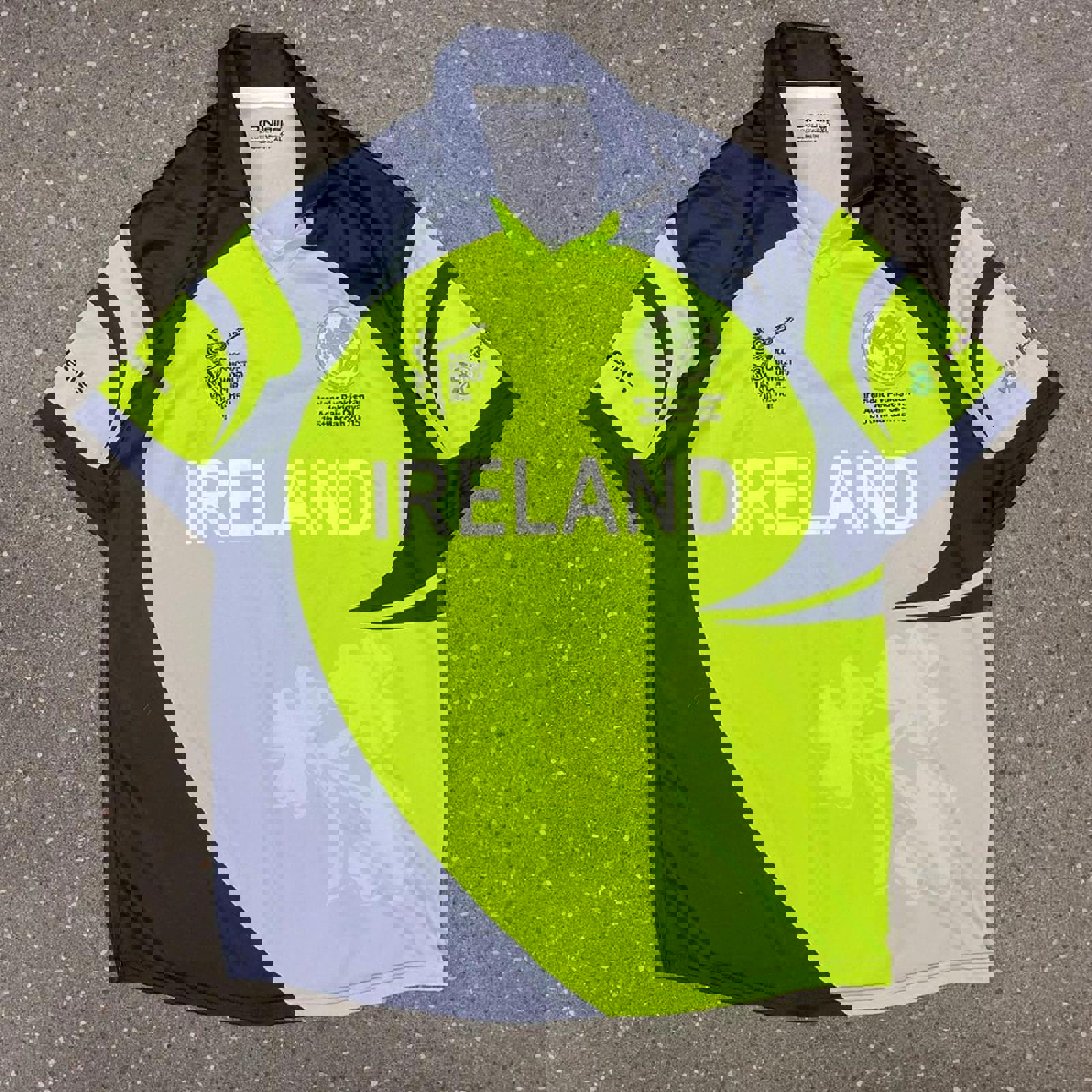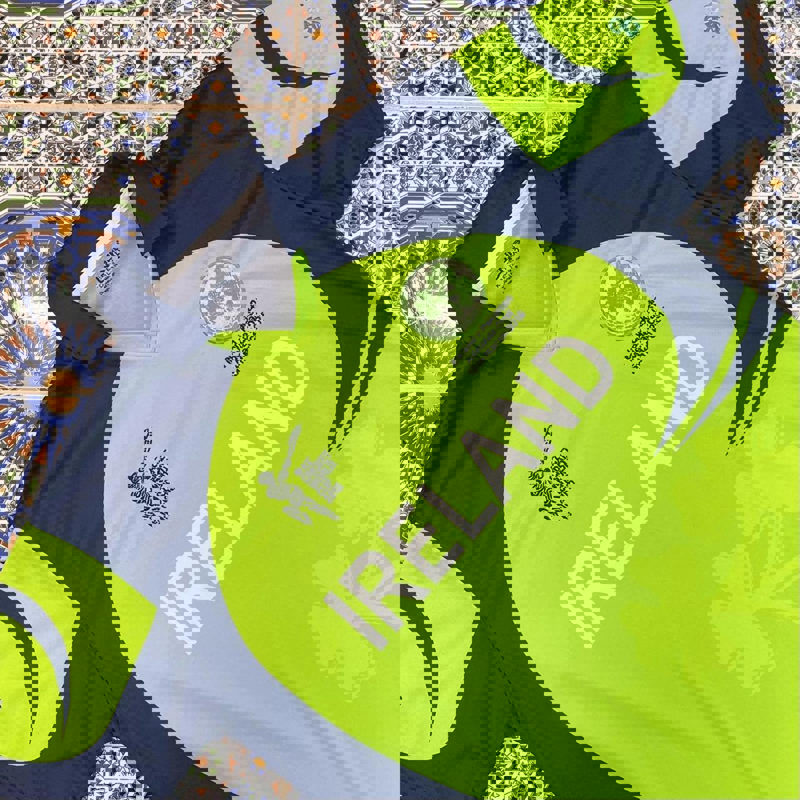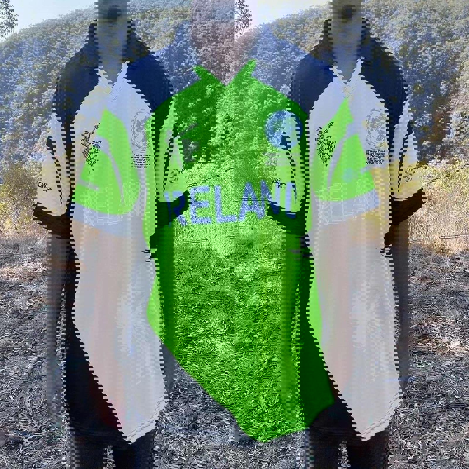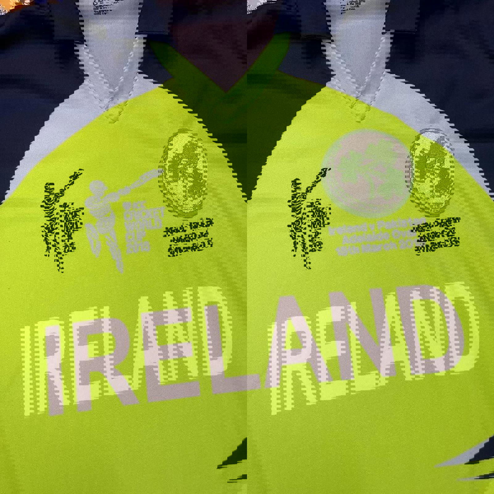 green and navy ireland world cup jersey vs Pakistan at ADL oval with embroidered logos on the sleeves and chest Ireland across chest is printed