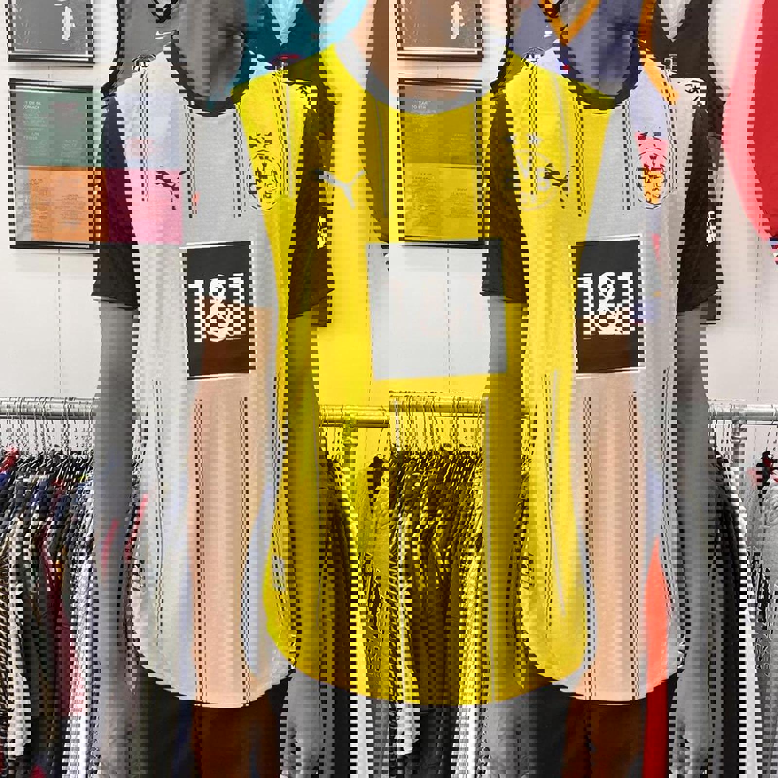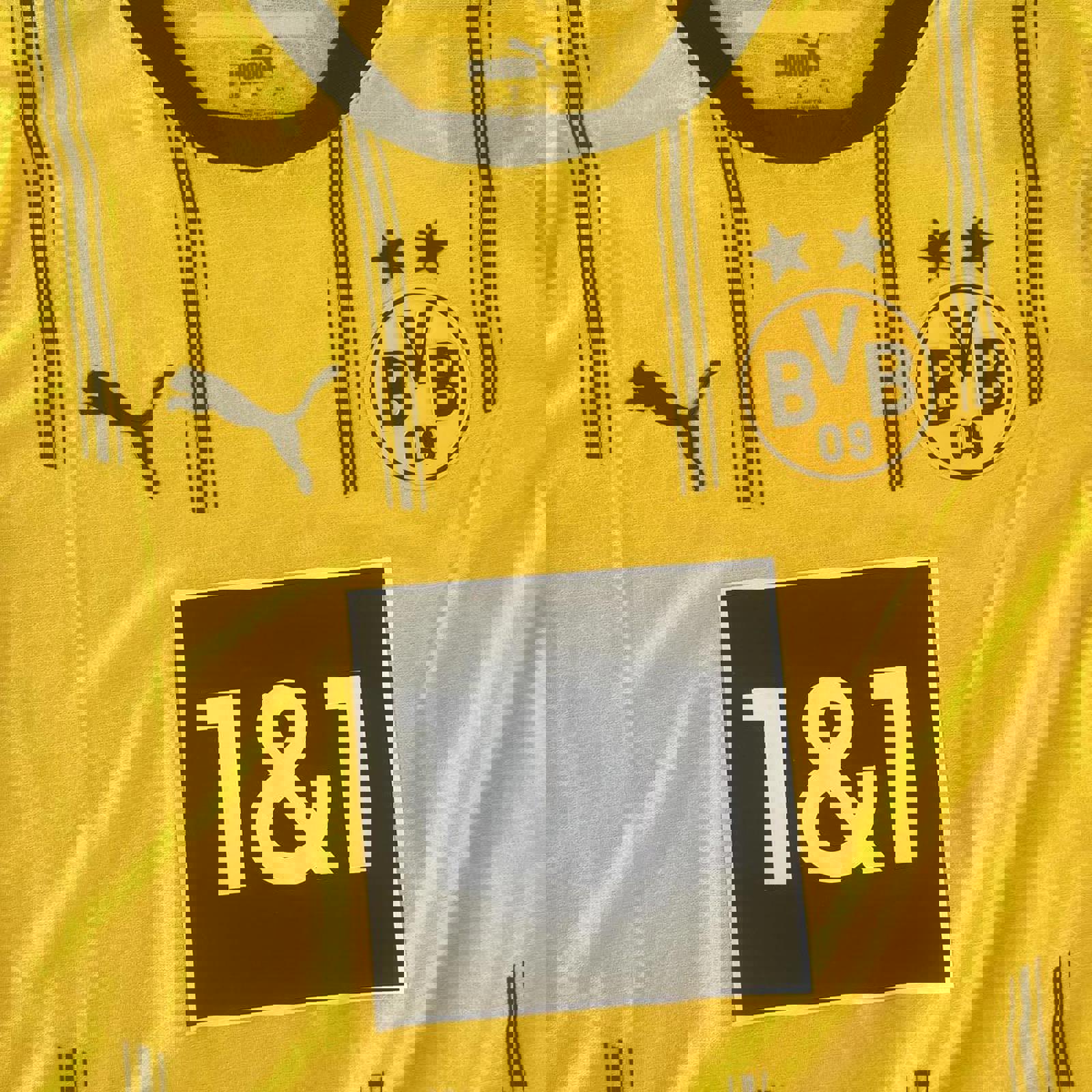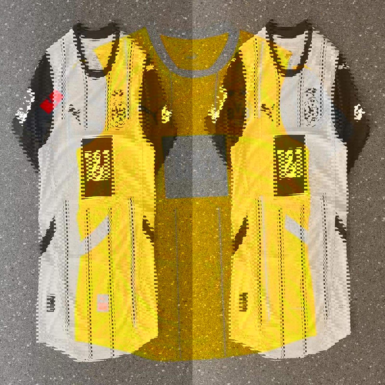 yellow and black puma dortmund jersey with all printed logos and a puma patch on the hip