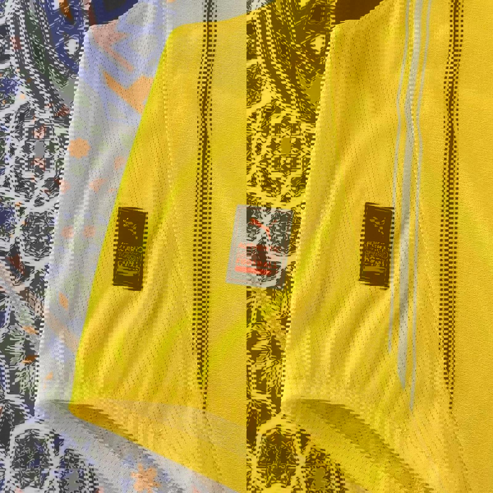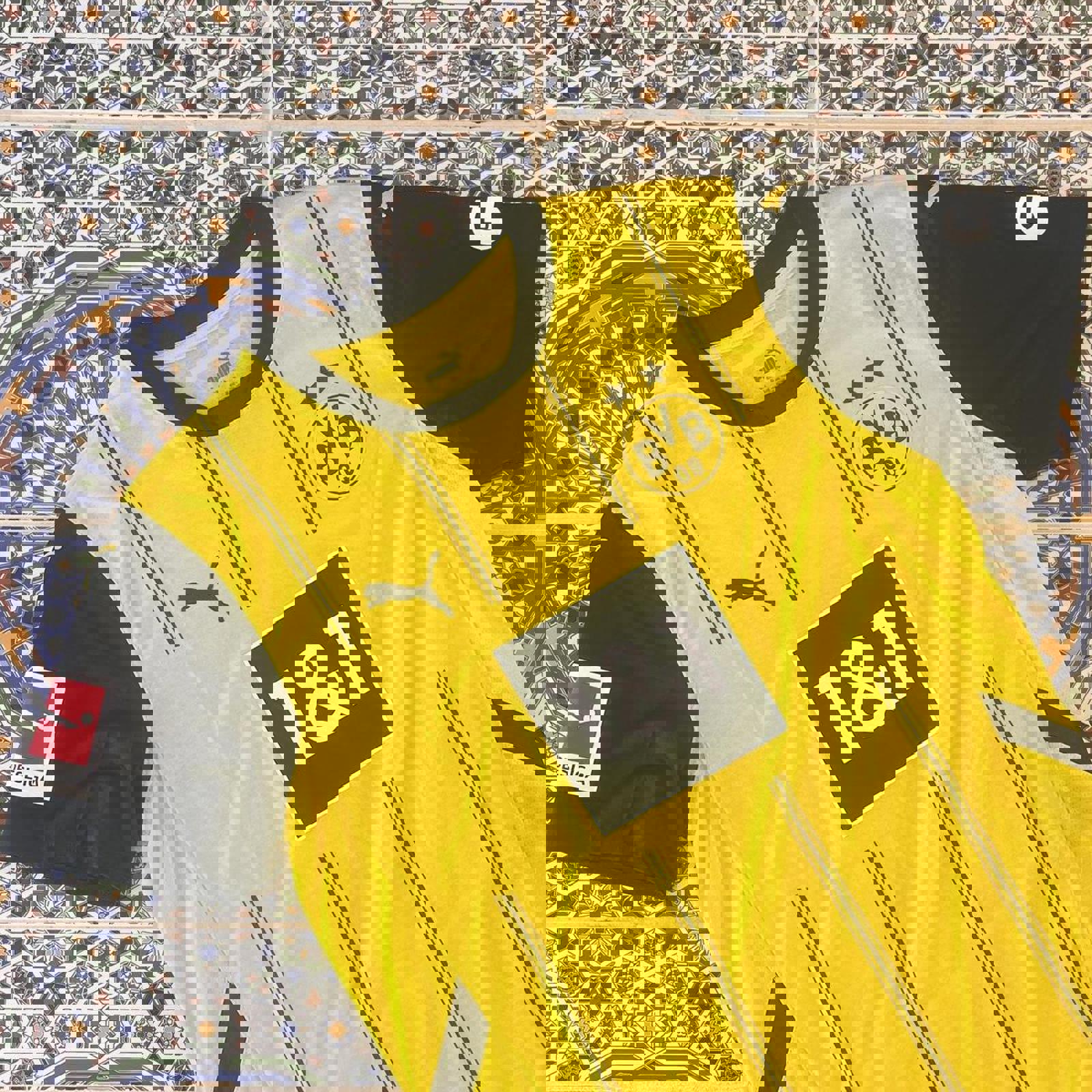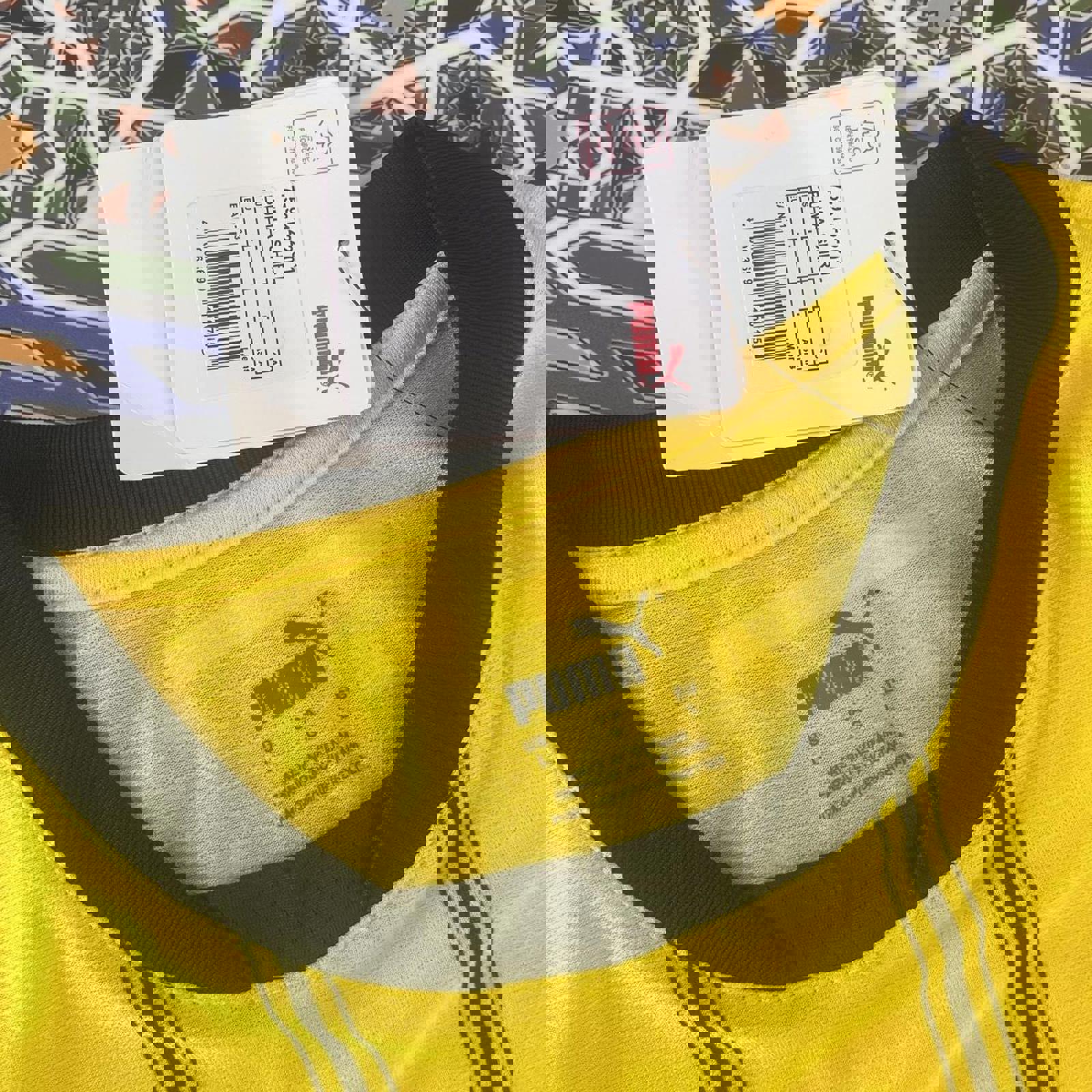yellow and black puma dortmund jersey with all printed logos and a puma patch on the hip