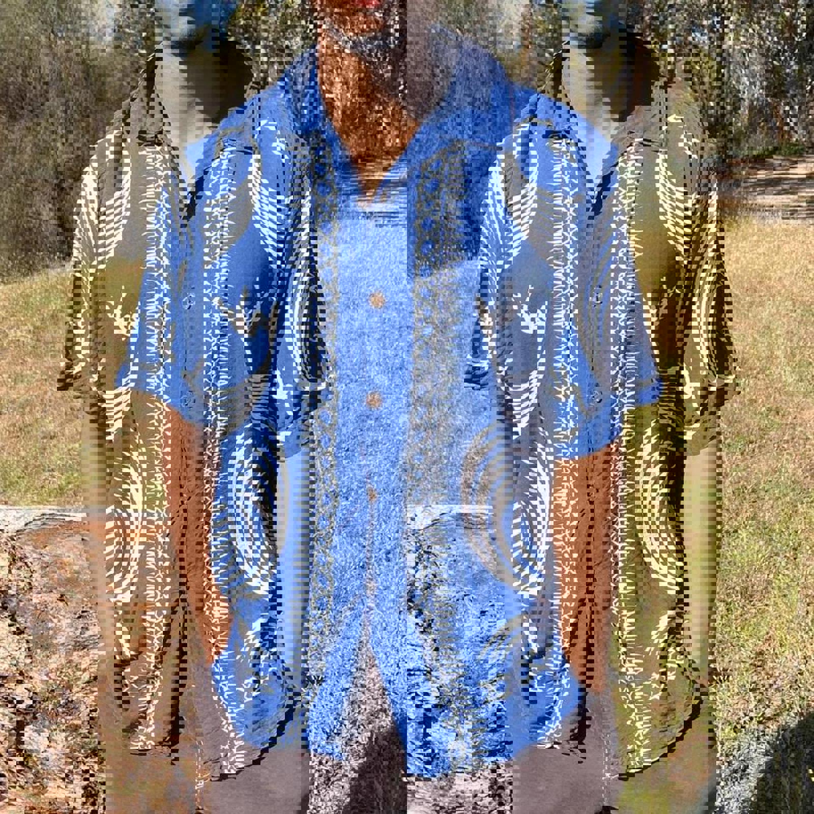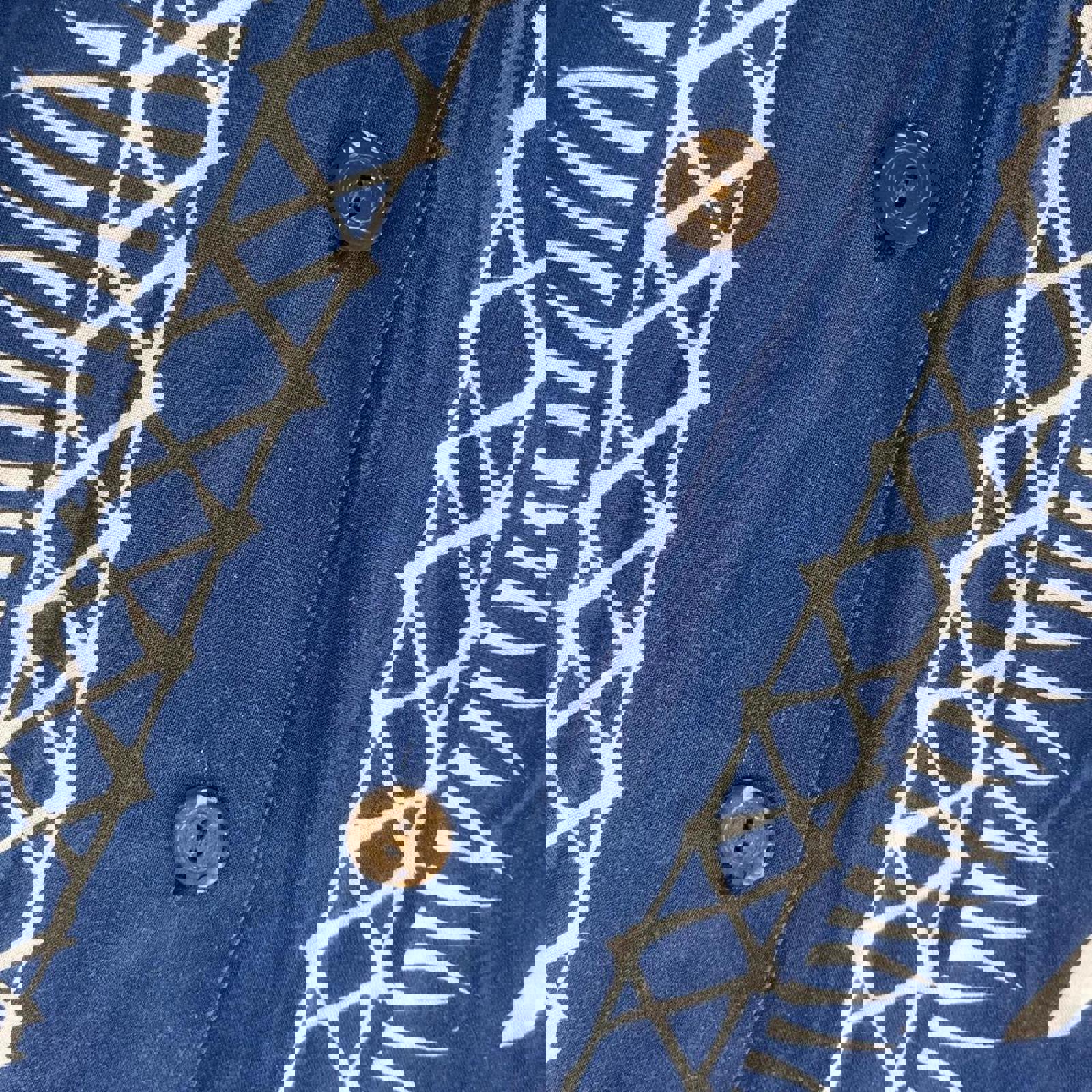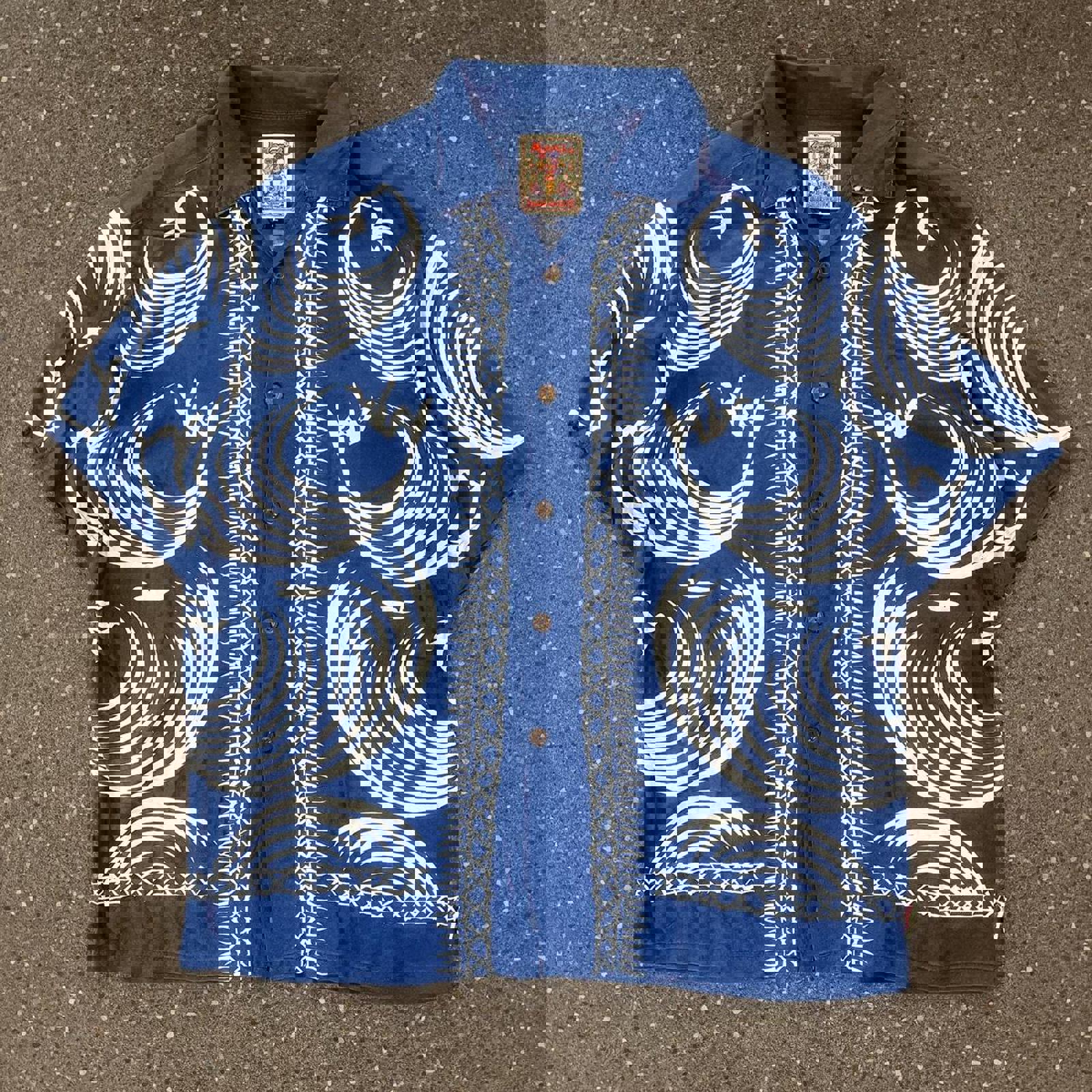 1990s Batik Surf blue and white Mambo short sleeved button up shirt with surfer graphics all over and wooden buttons