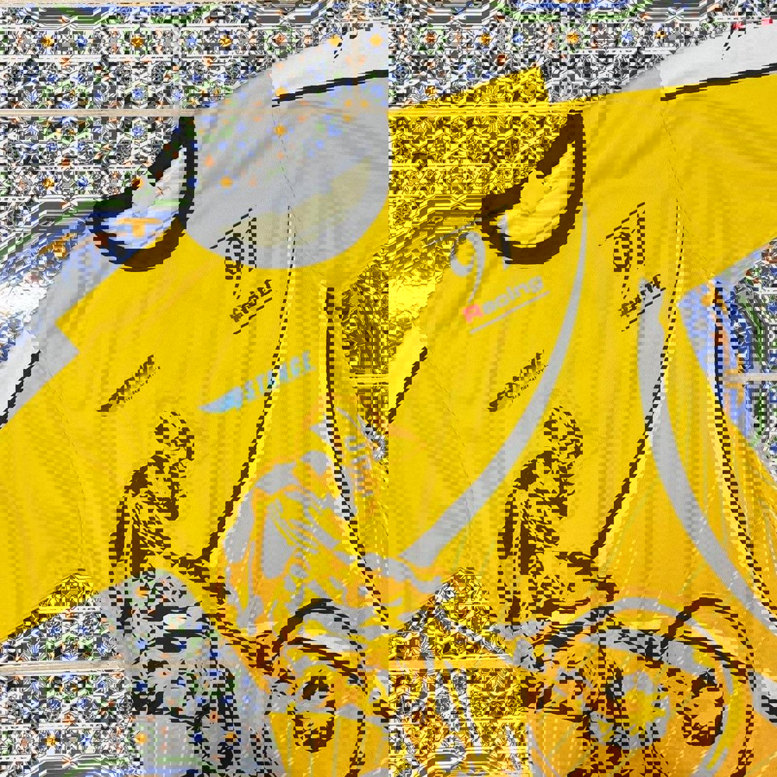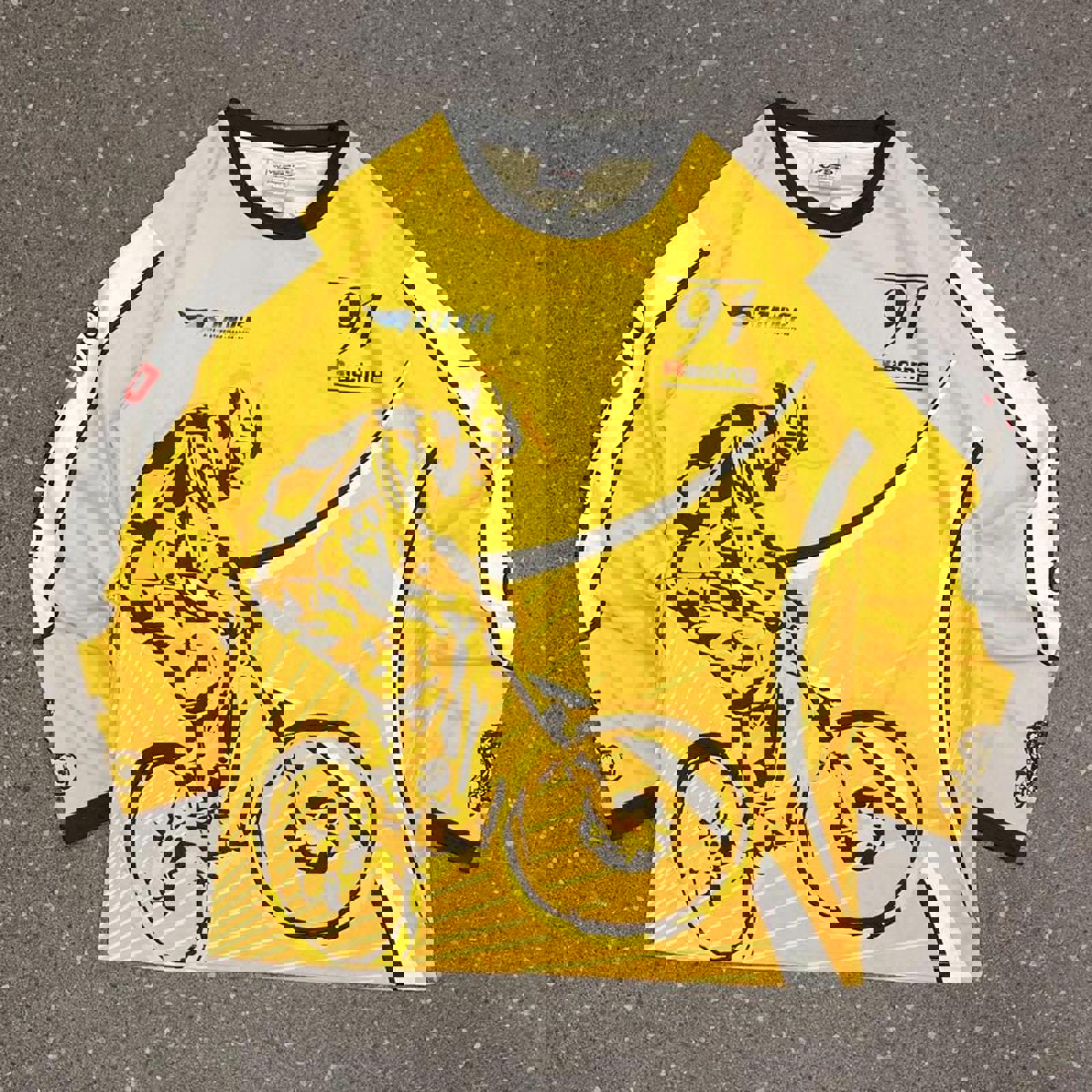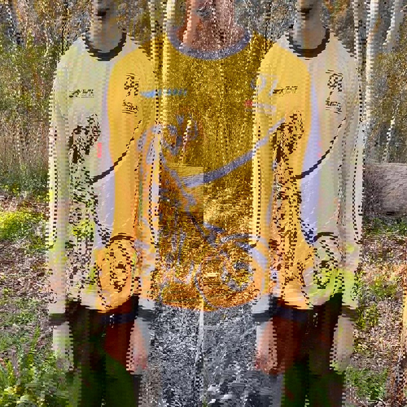 Yellow and black 91 racing bike jersey with a large mountain biking graphic on the front and various sponsoring