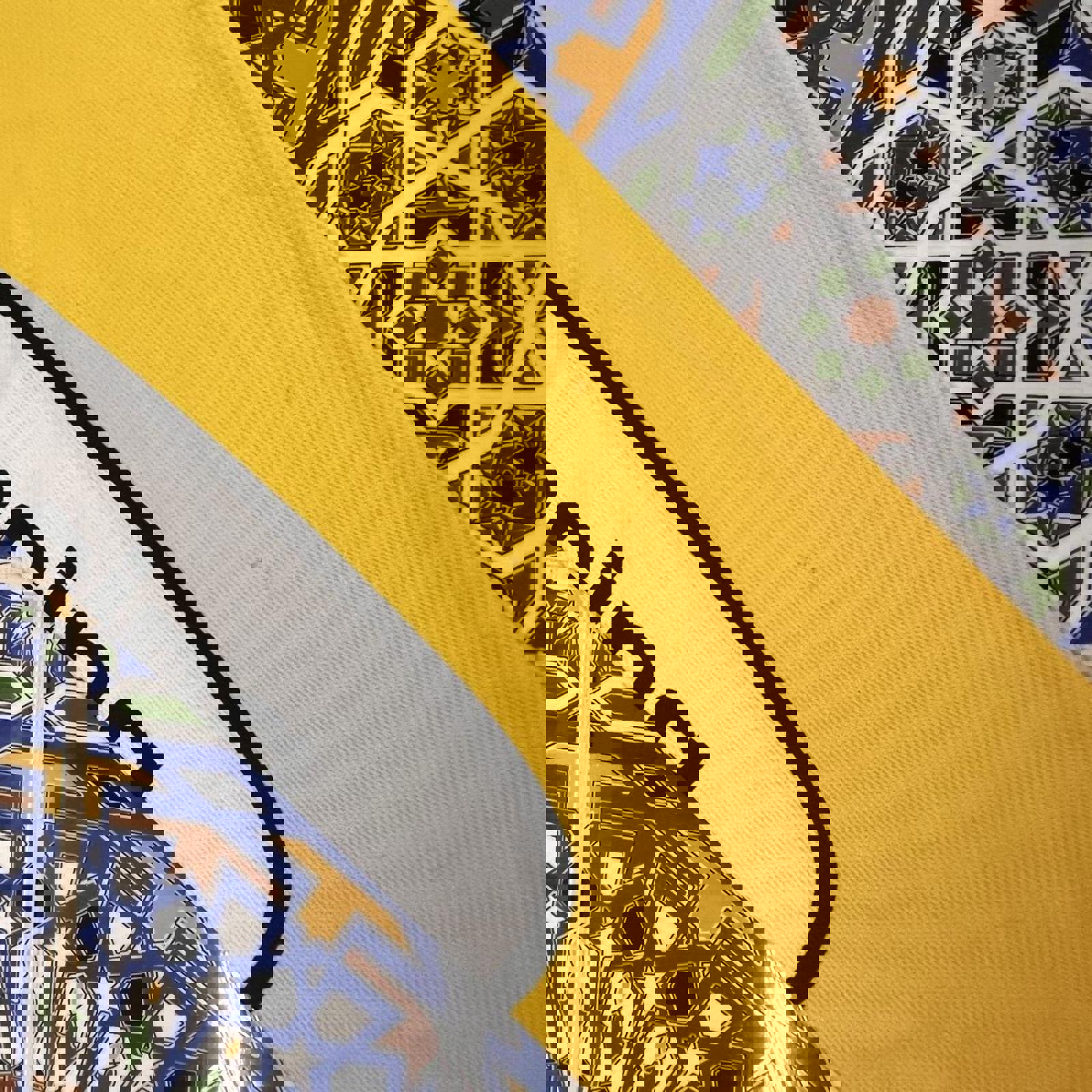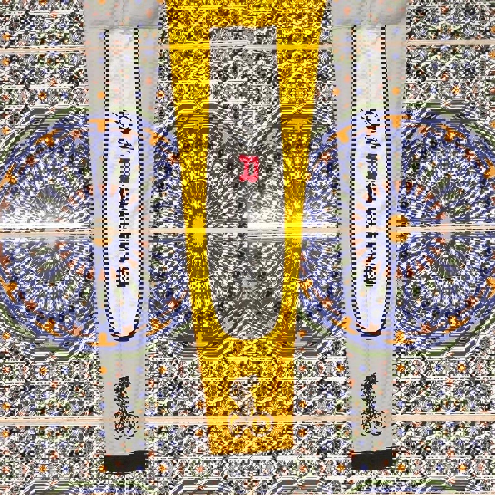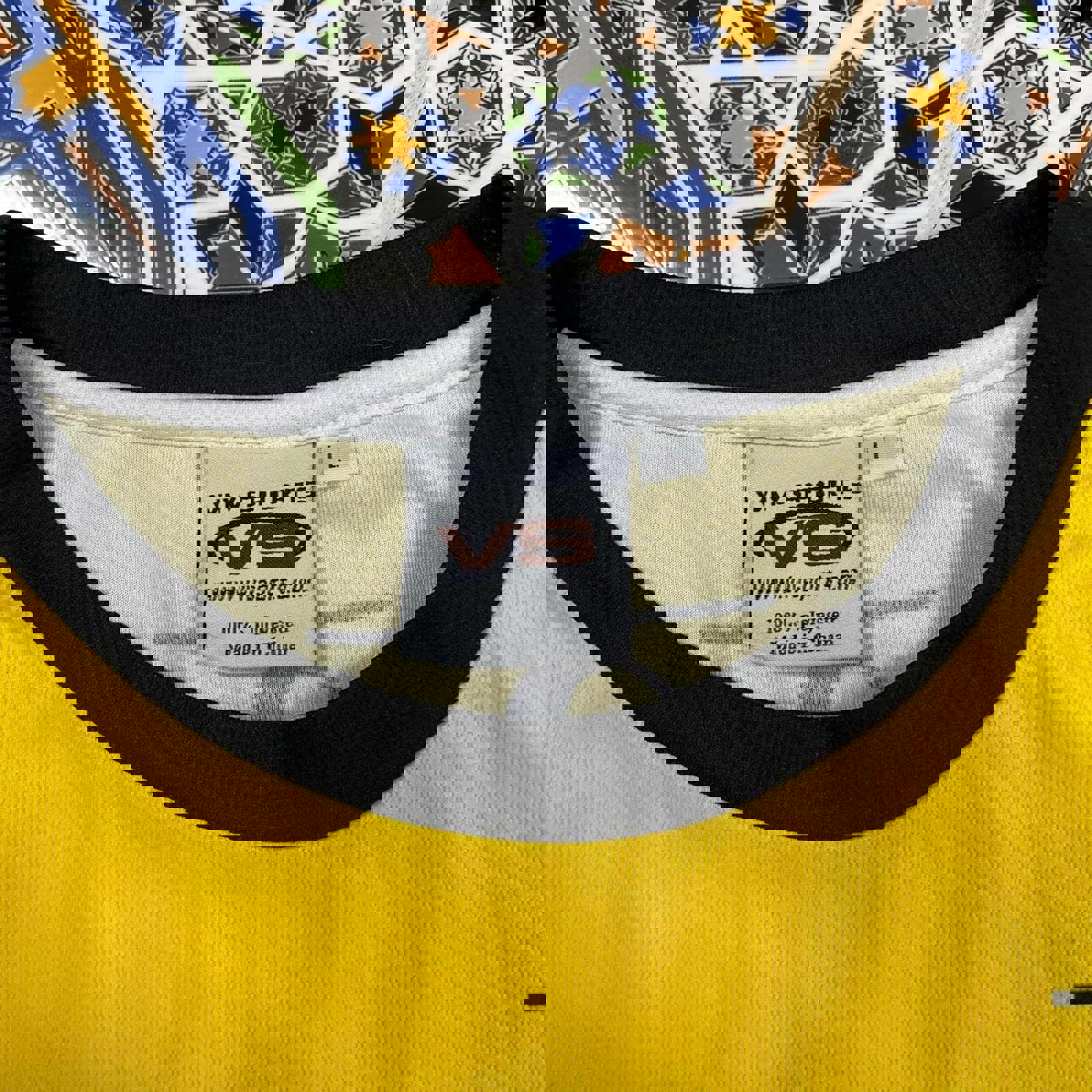 Yellow and black 91 racing bike jersey with a large mountain biking graphic on the front and various sponsoring