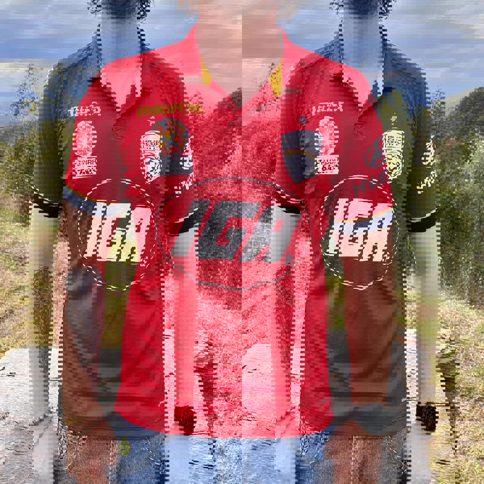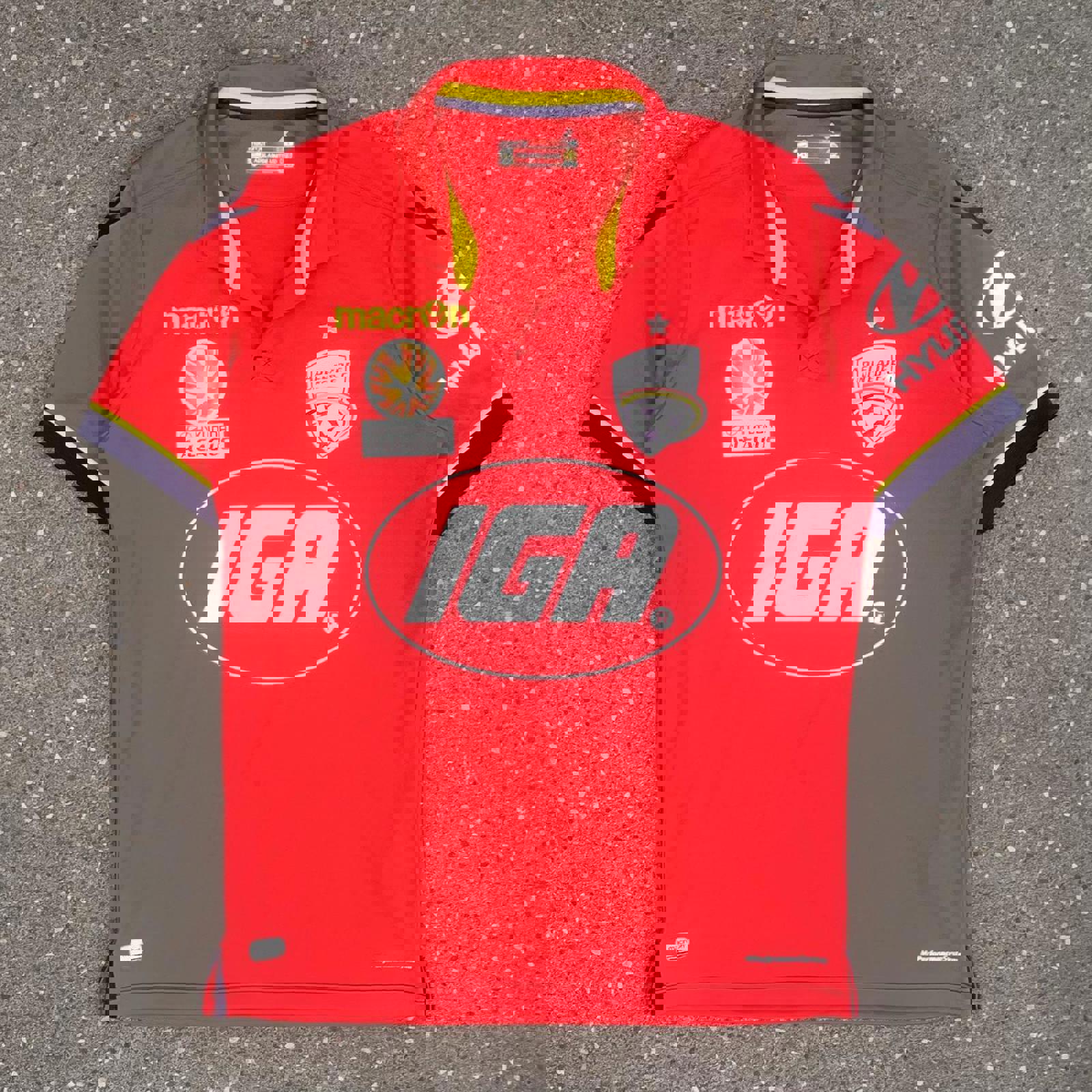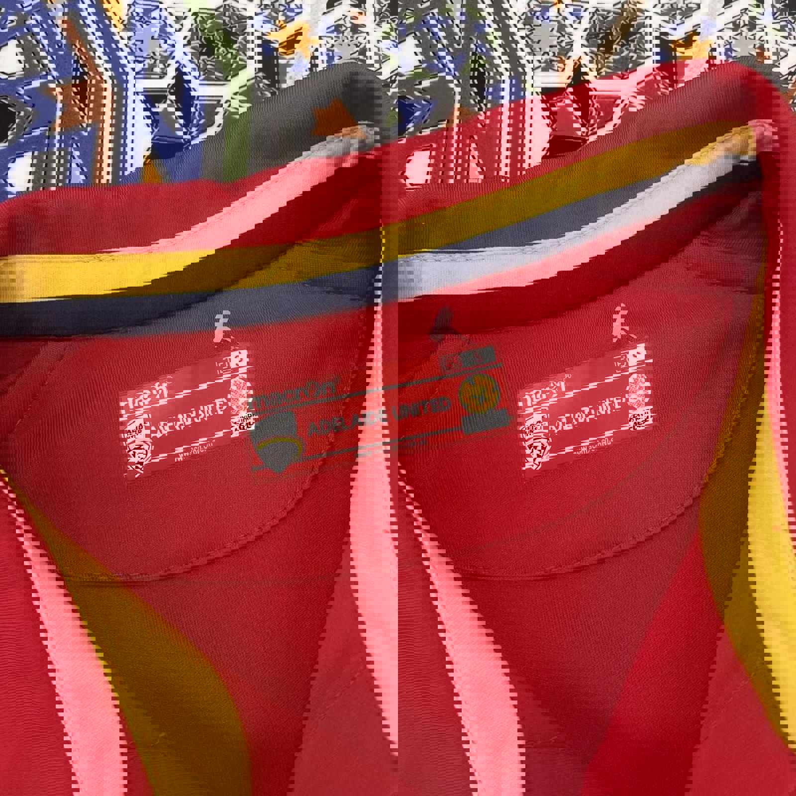 2016-17 Adelaide united red football jersey with embroidered and screen printed logos on the front and sleeves