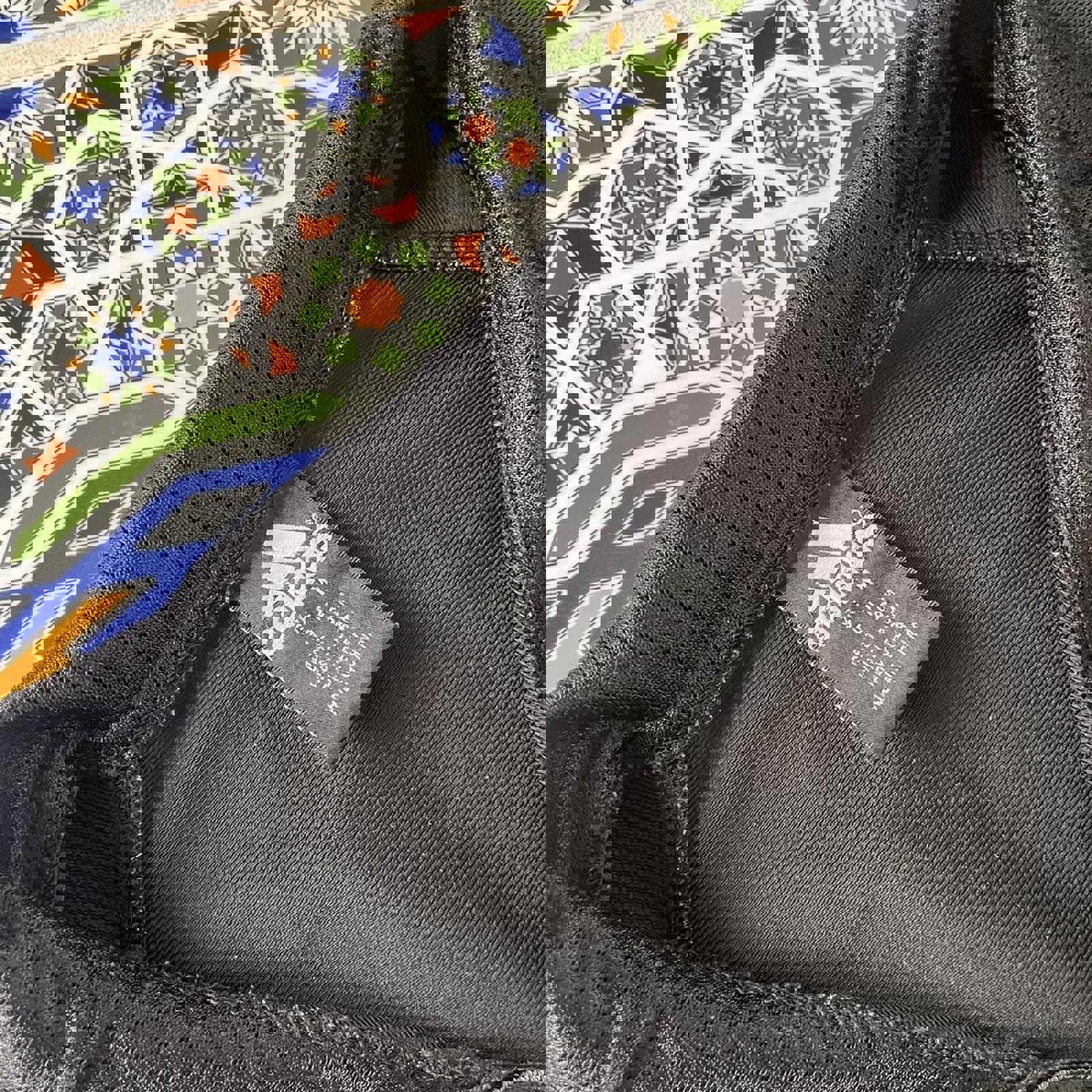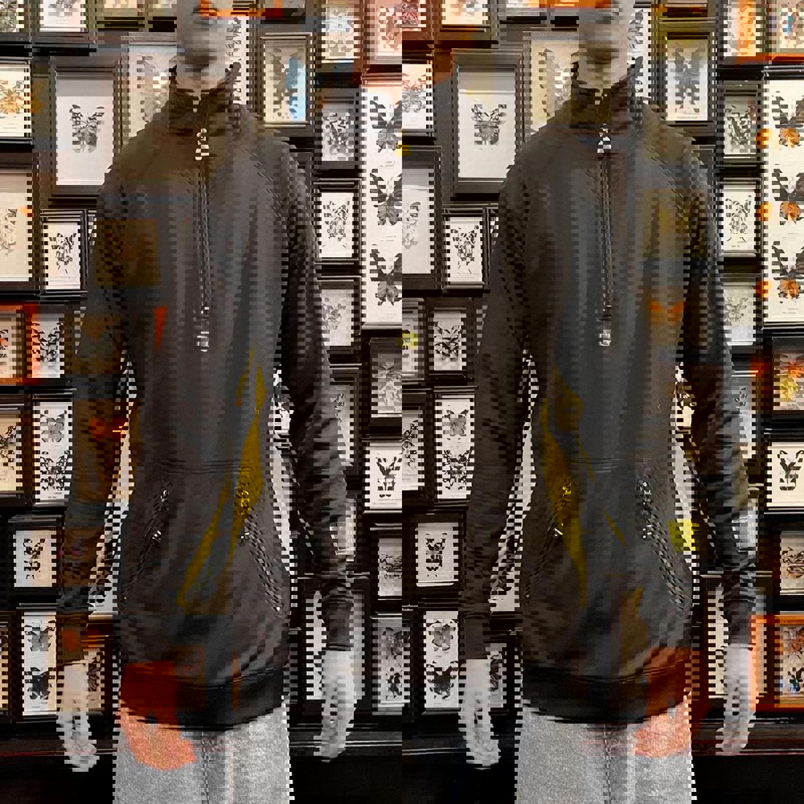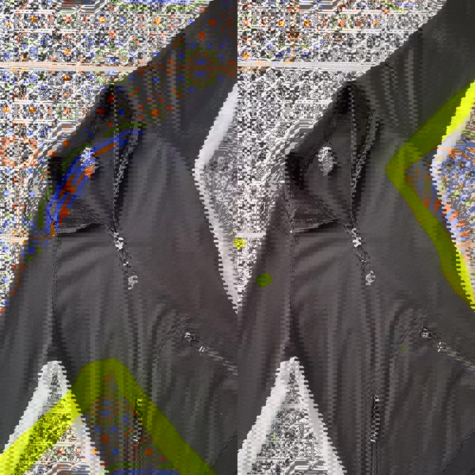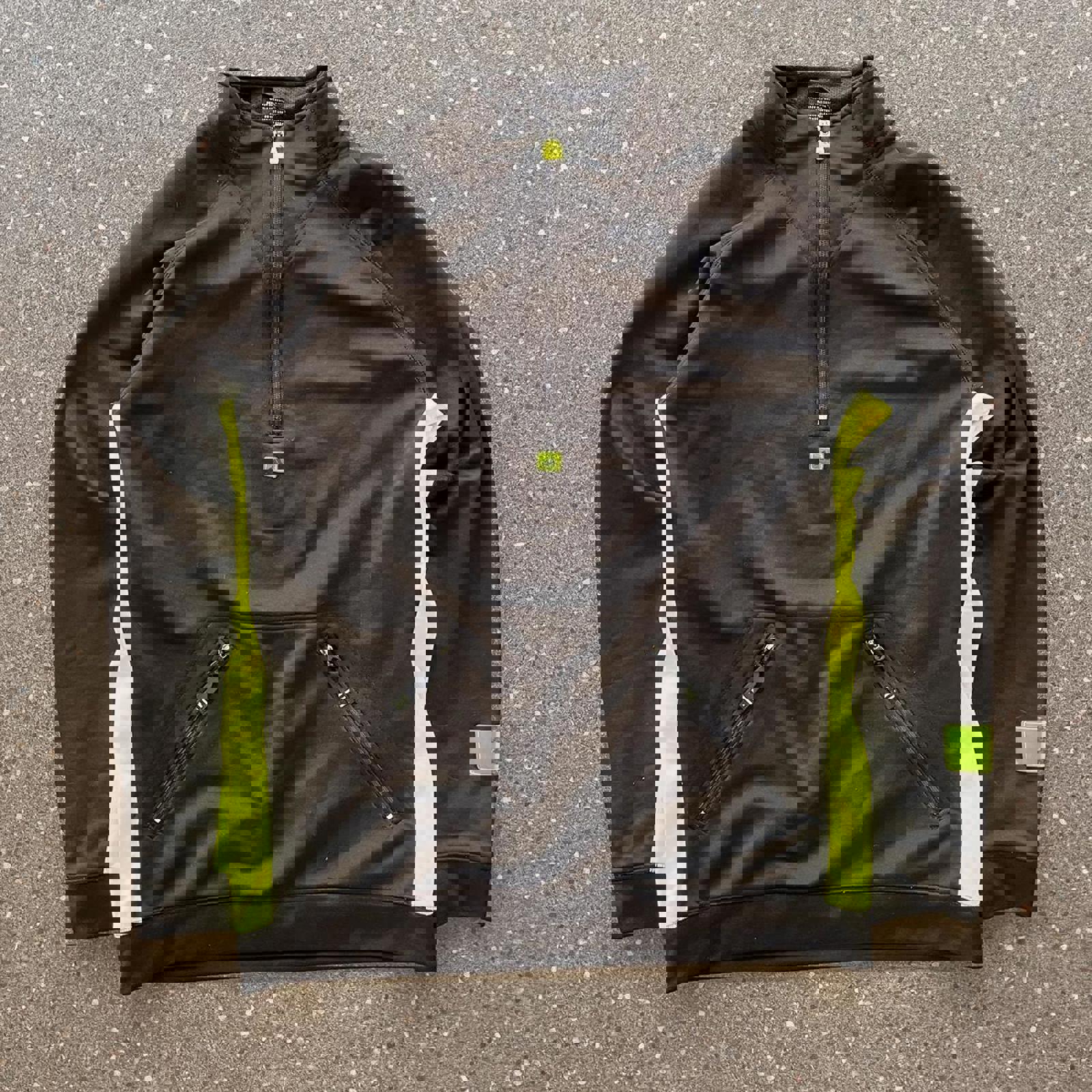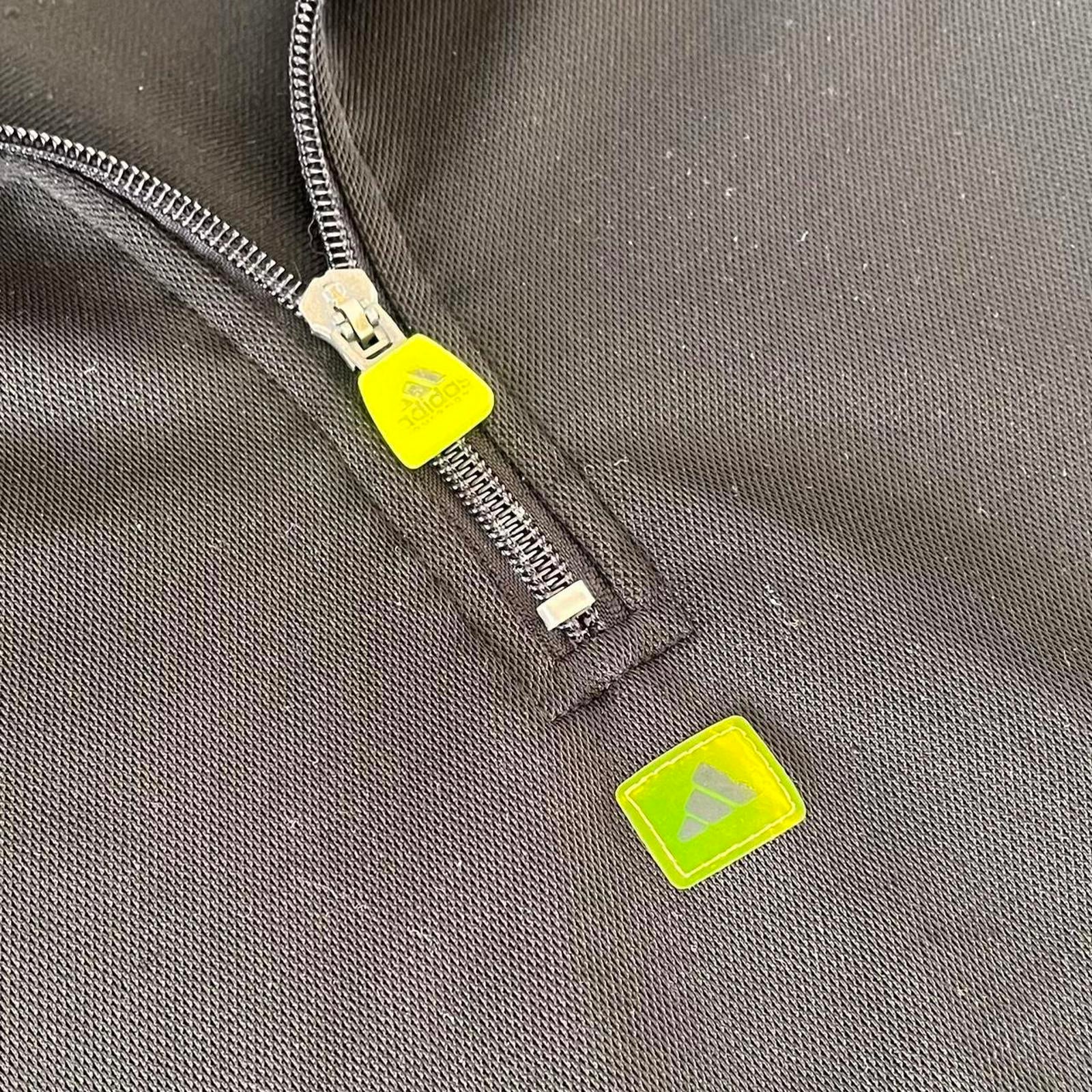 black and fluorescent yellow /.green adidas 1/4 zip with patches under the zip and on the sleeve as well as a detailed zipper