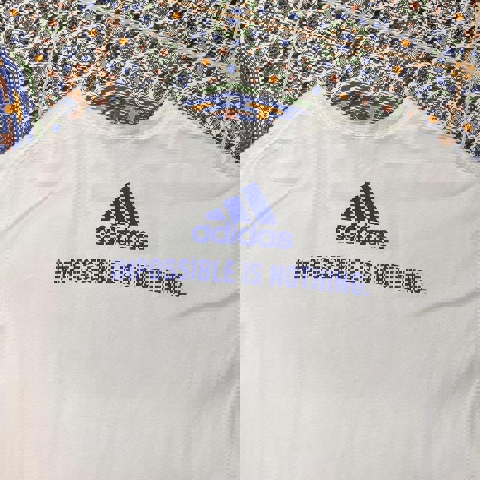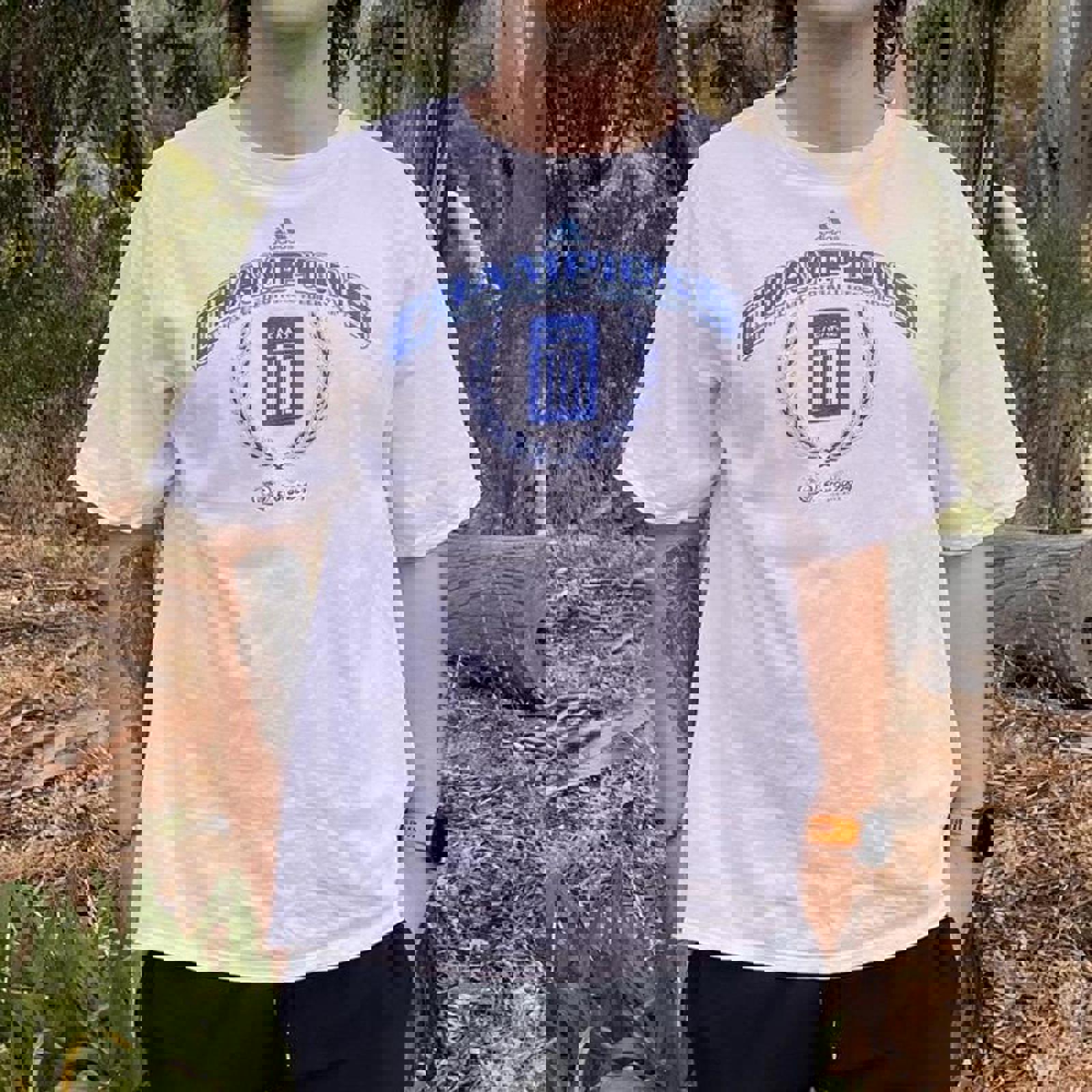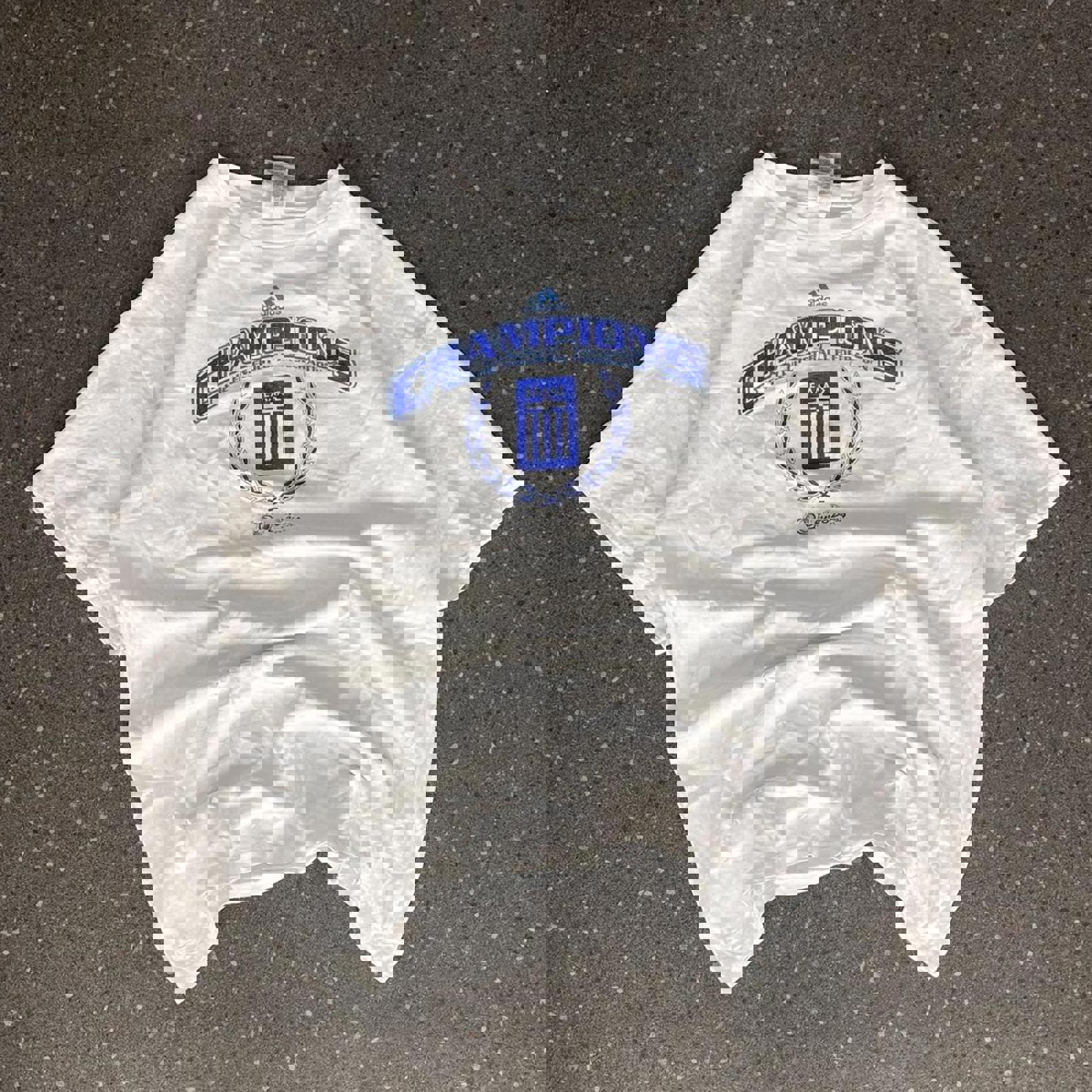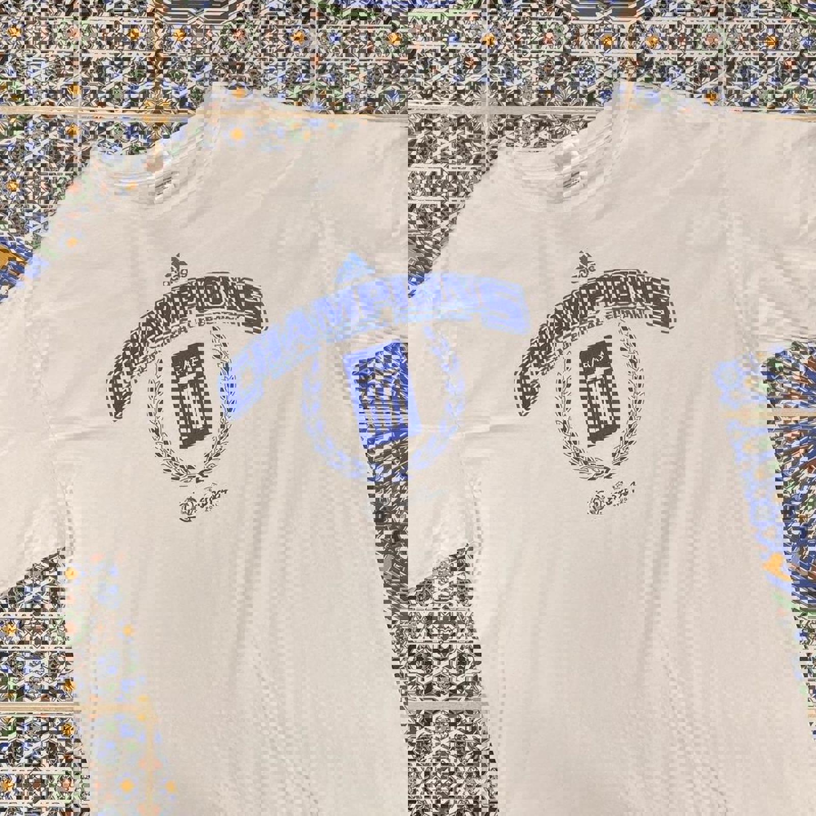 white adidas tshirt with a large two tone blue Greece uefa 2004 champions t-shirt tagged Size L