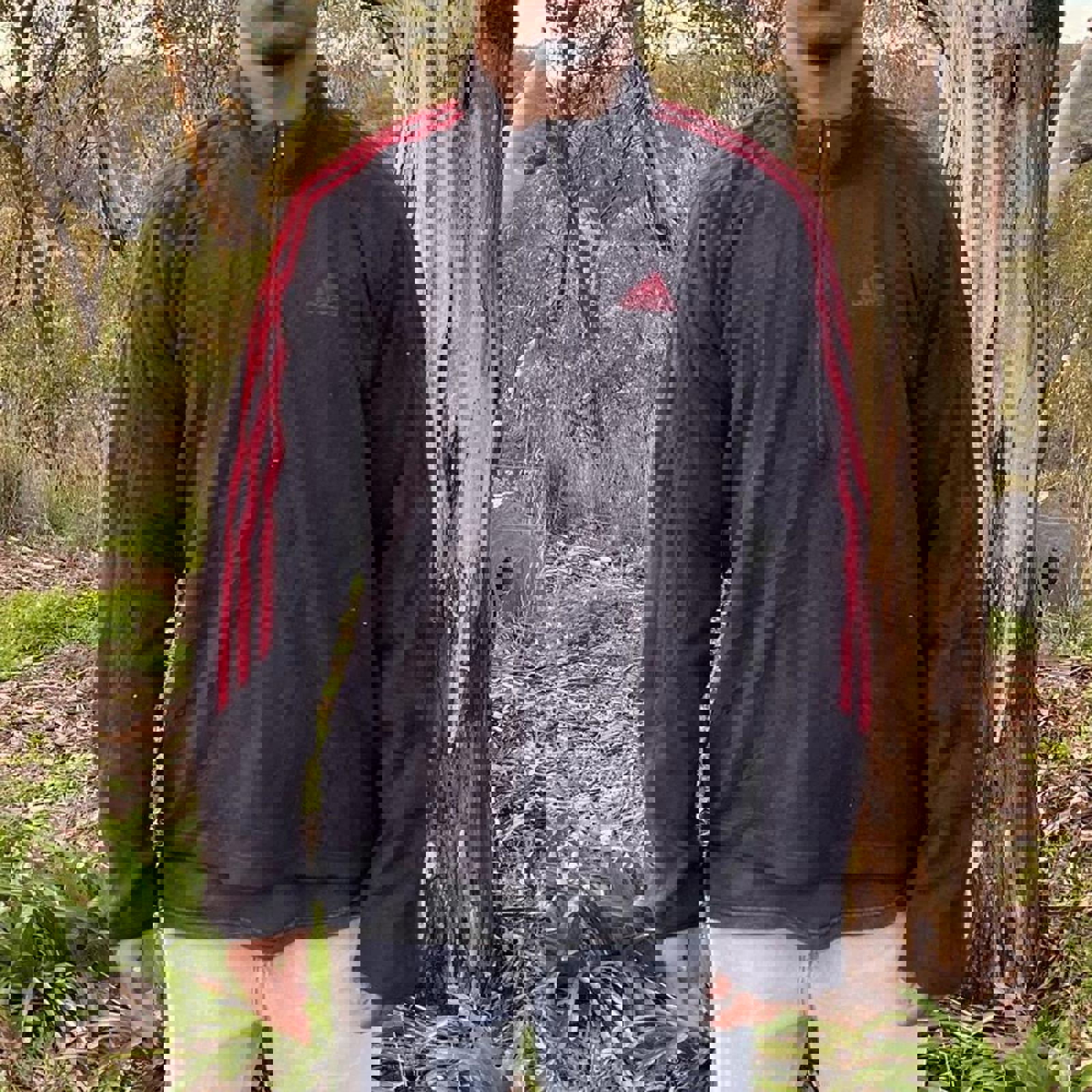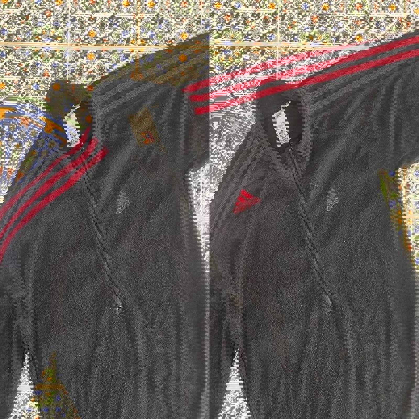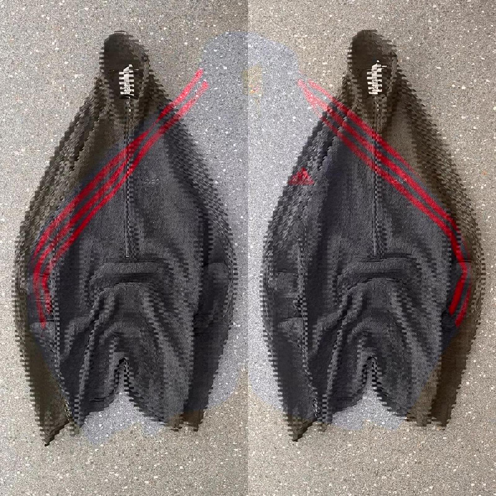 Black and red adidas fleece 1/4 zip jumper with an embroidered logo on the chest and 3 stripes down the sleeves