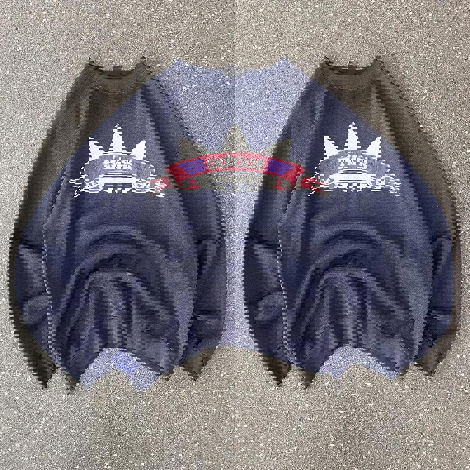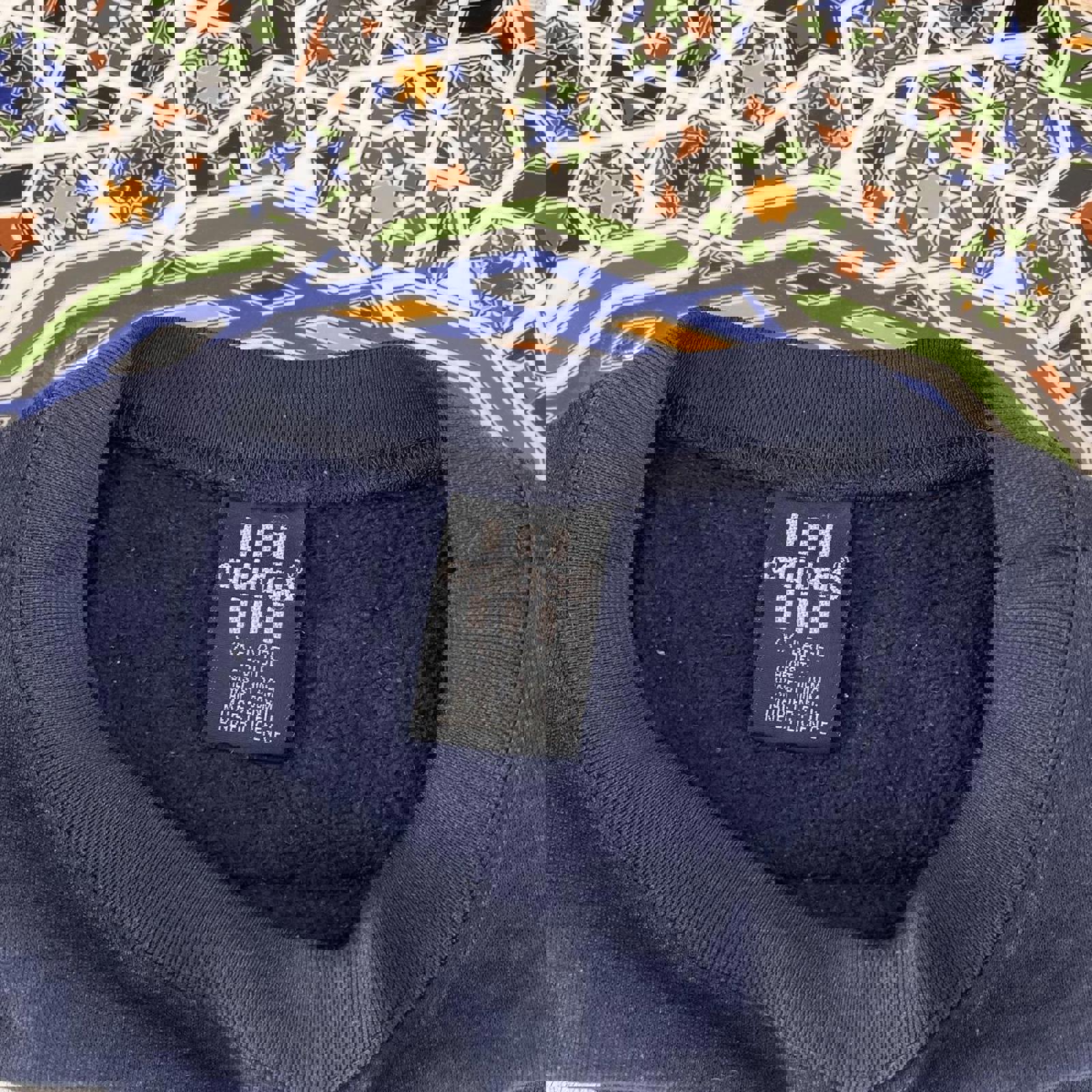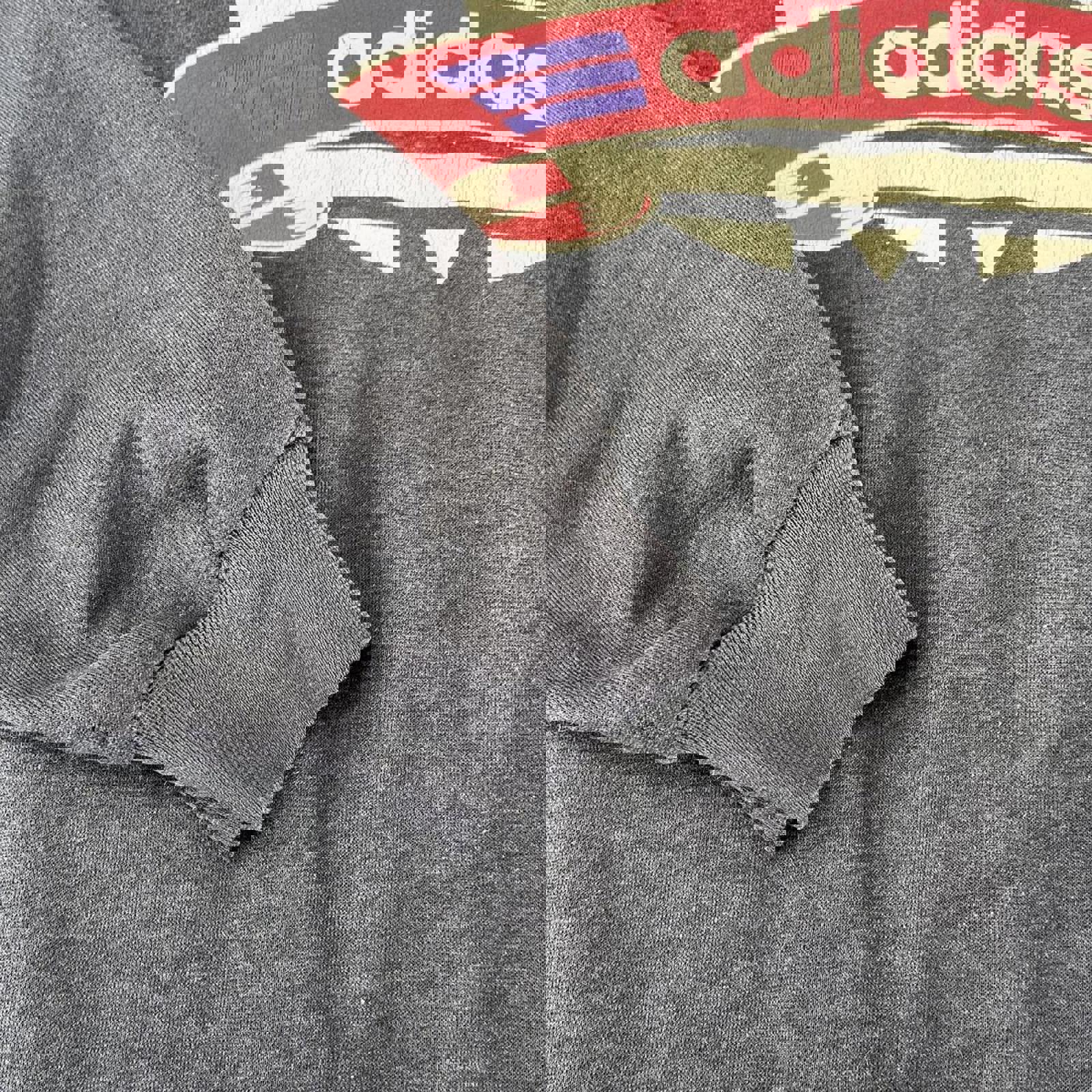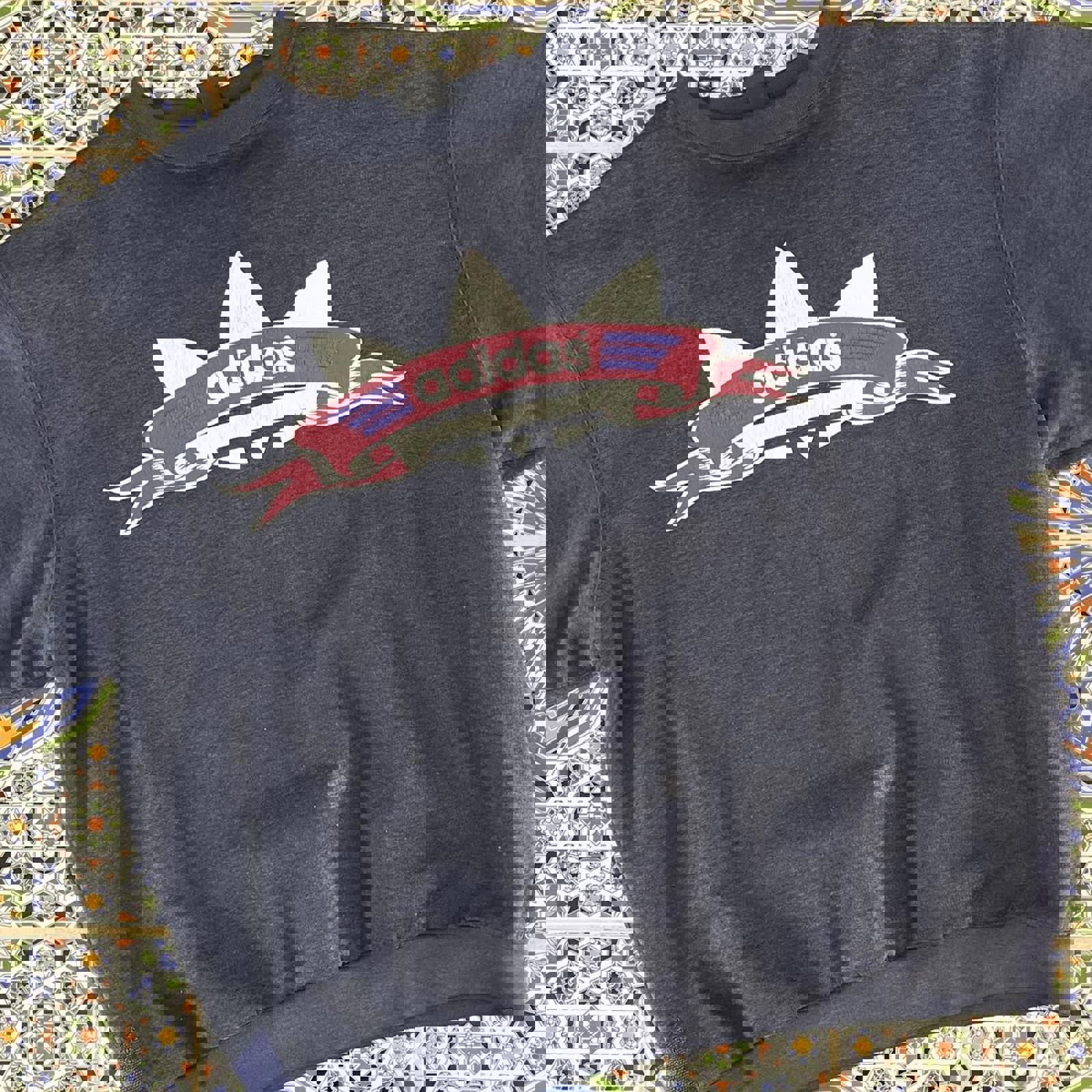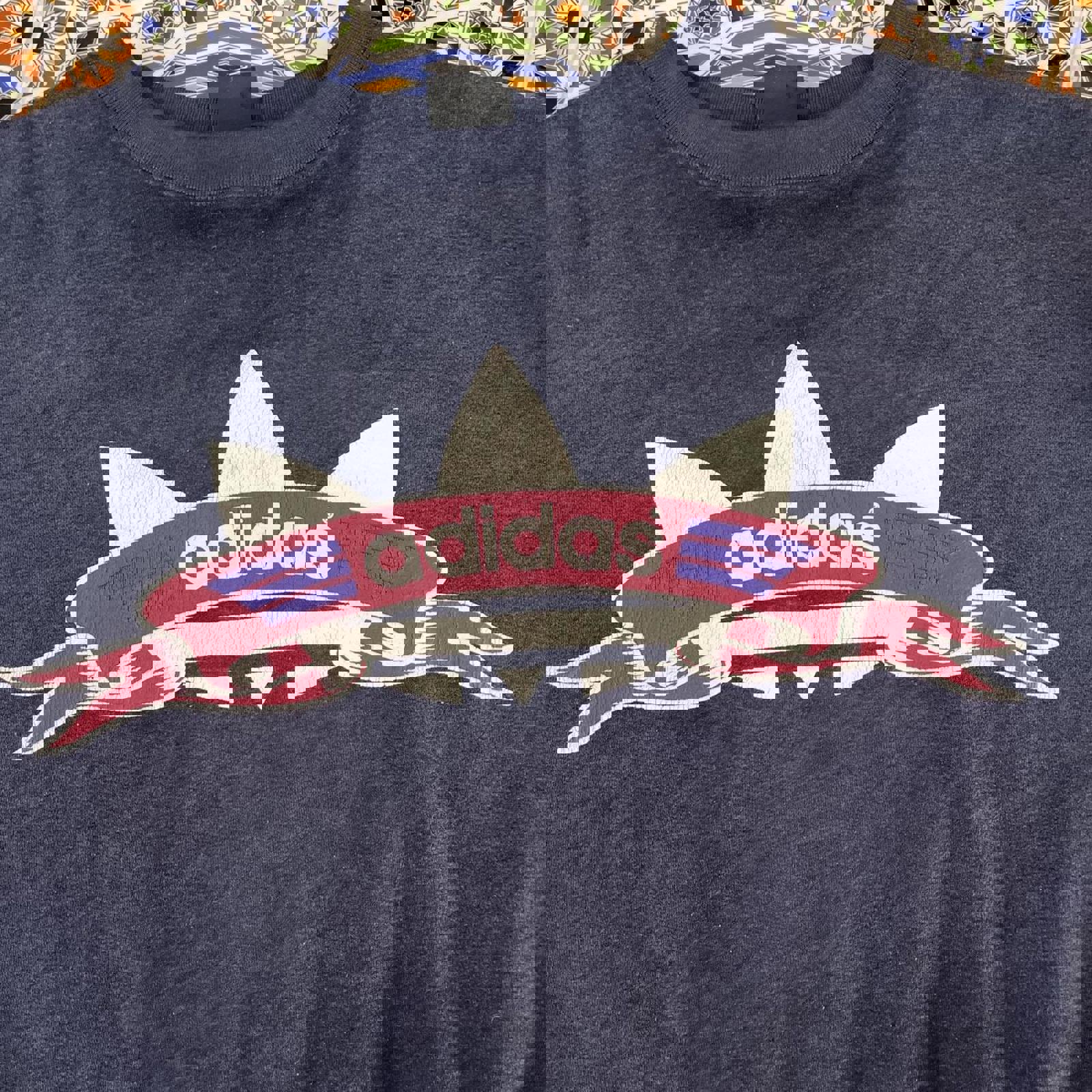 navy adidas sweatshirt with a large white, blue and maroon adidas printed graphic on the front