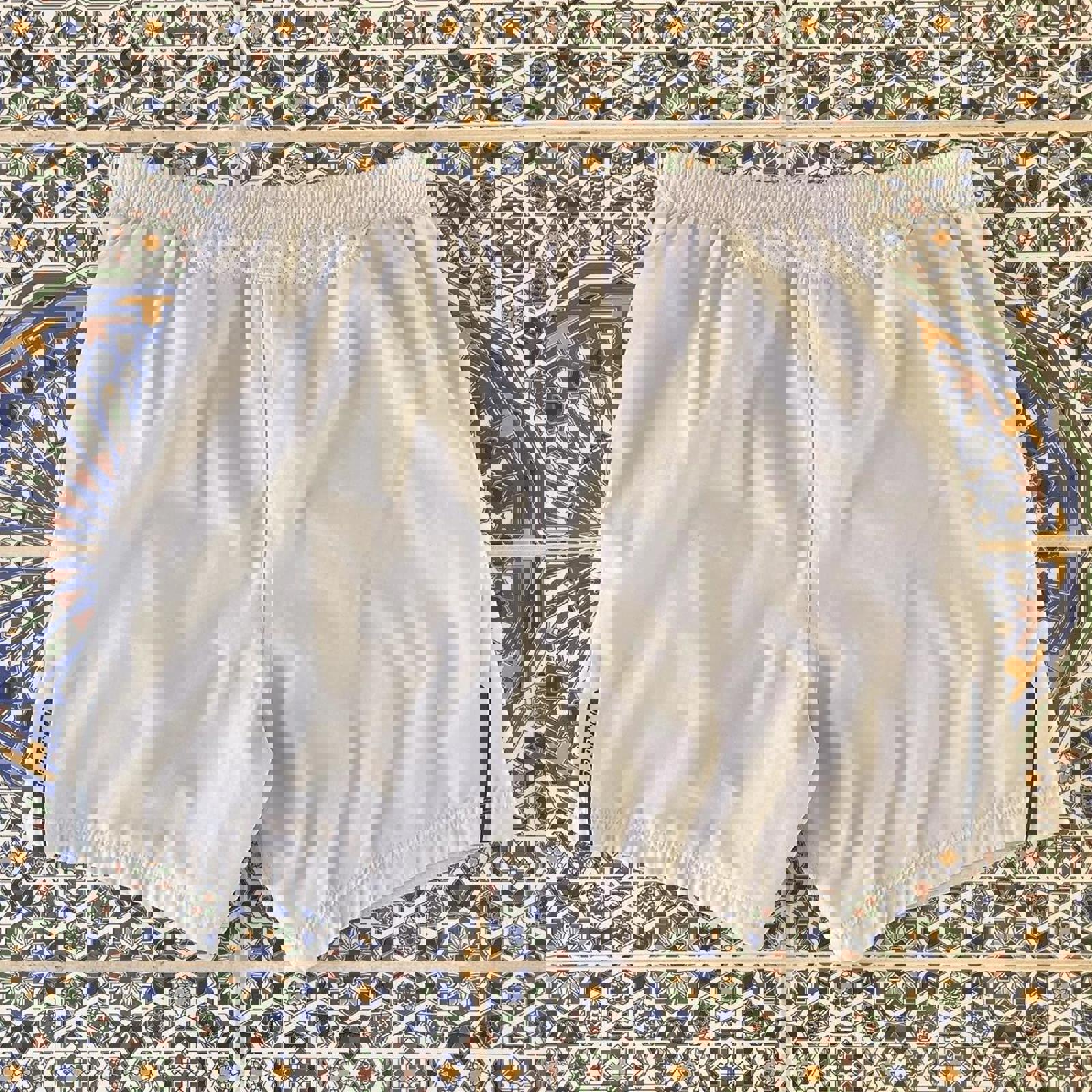cream adidas shorts with a black adidas logo on the front leg and formotion spellout on the side