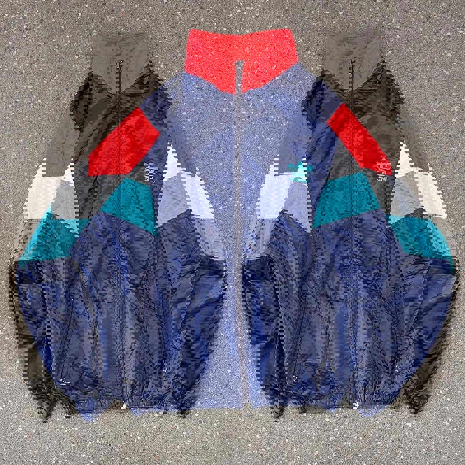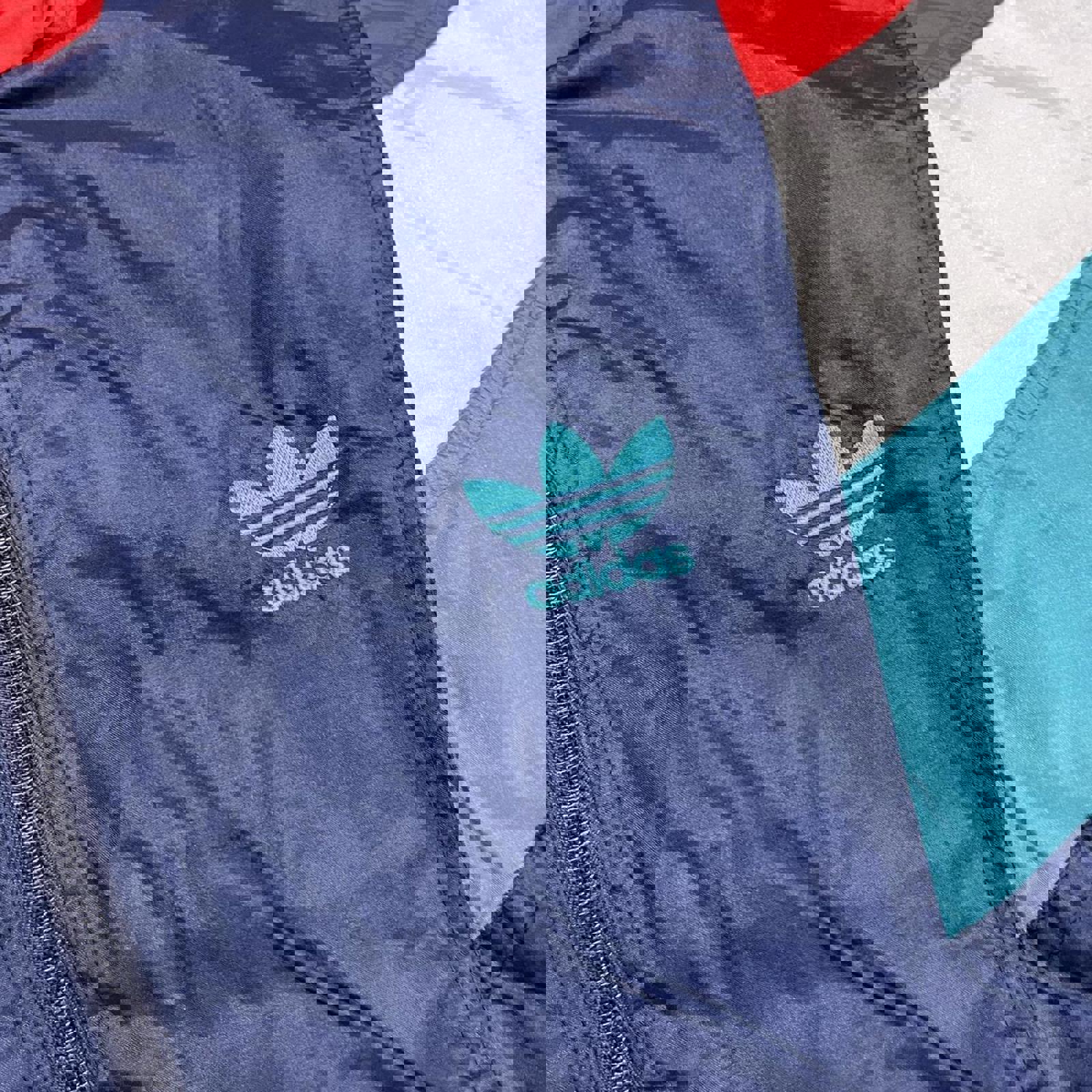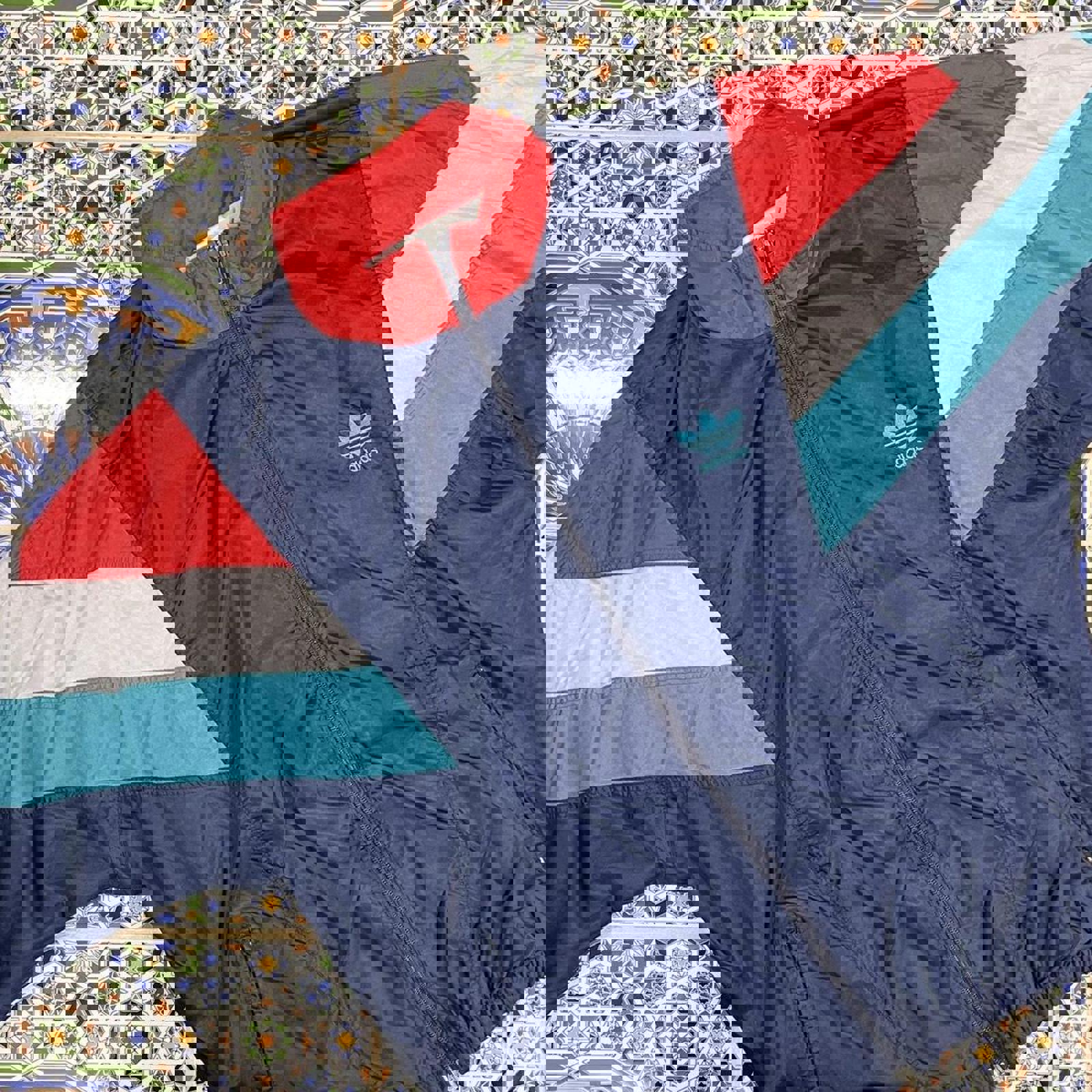 Navy, red, white and green block colour adidas windbreaker with an embroidered green adidas logo on the chest and large red osswald graphic on the back