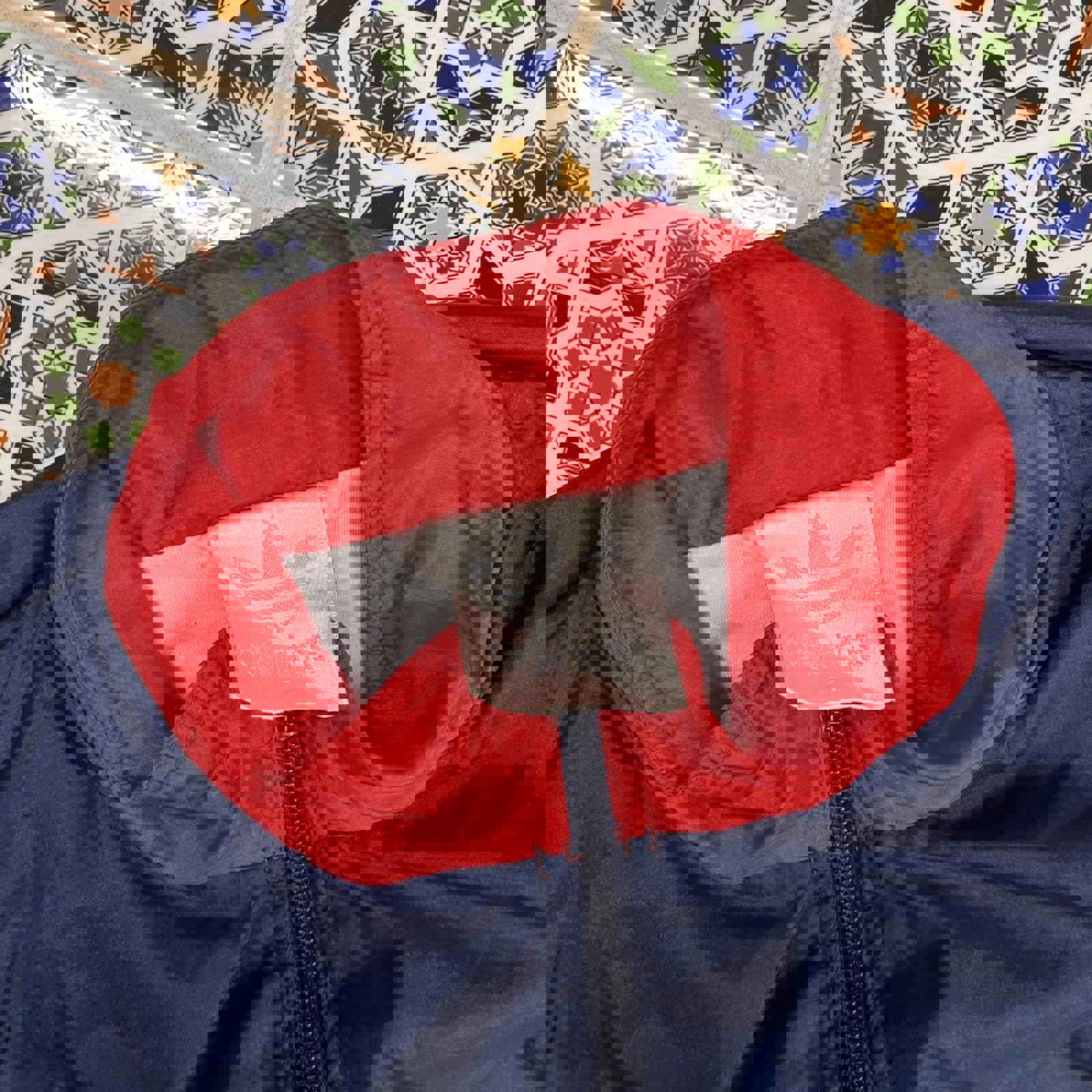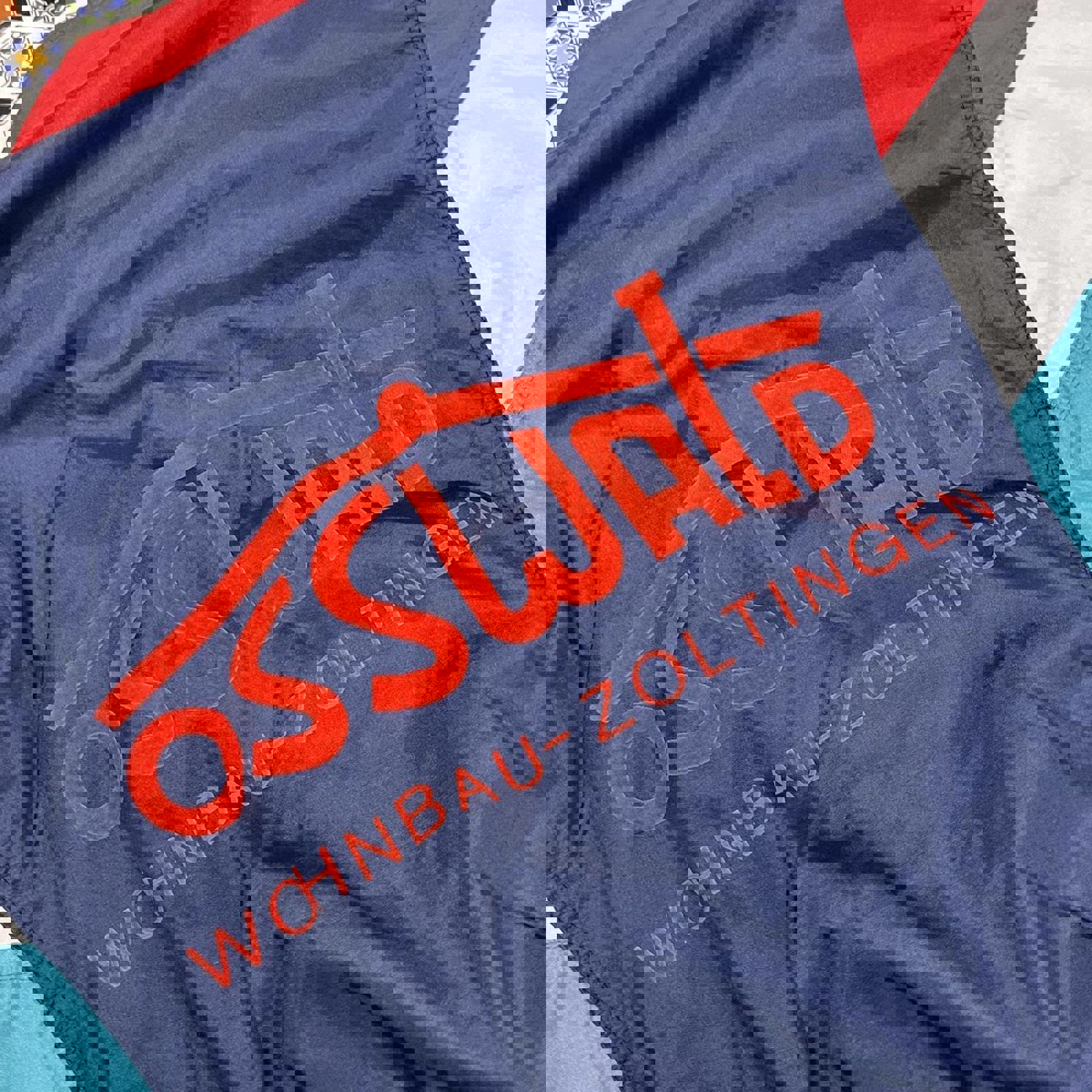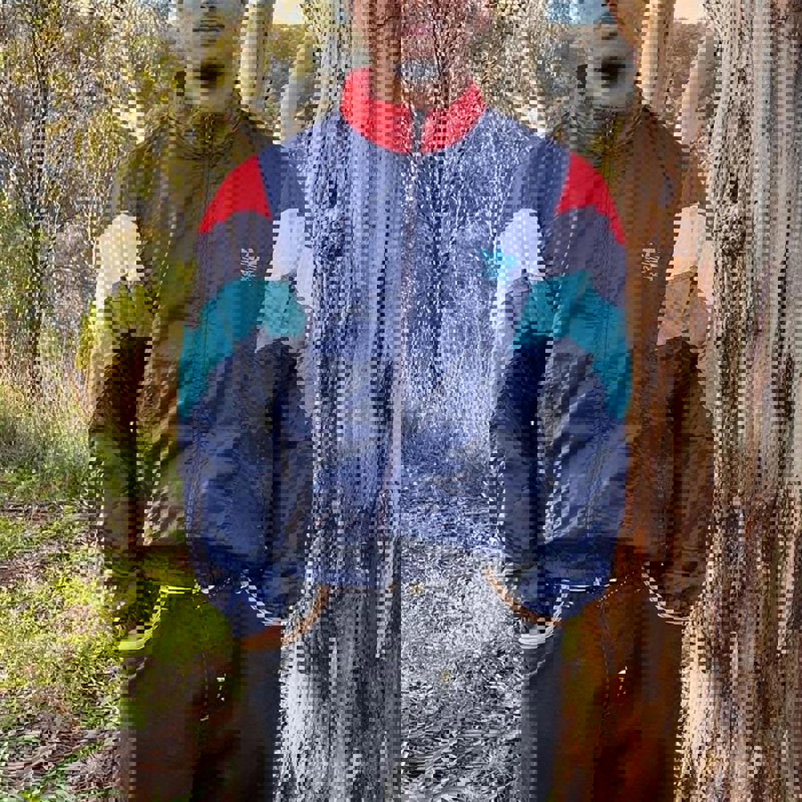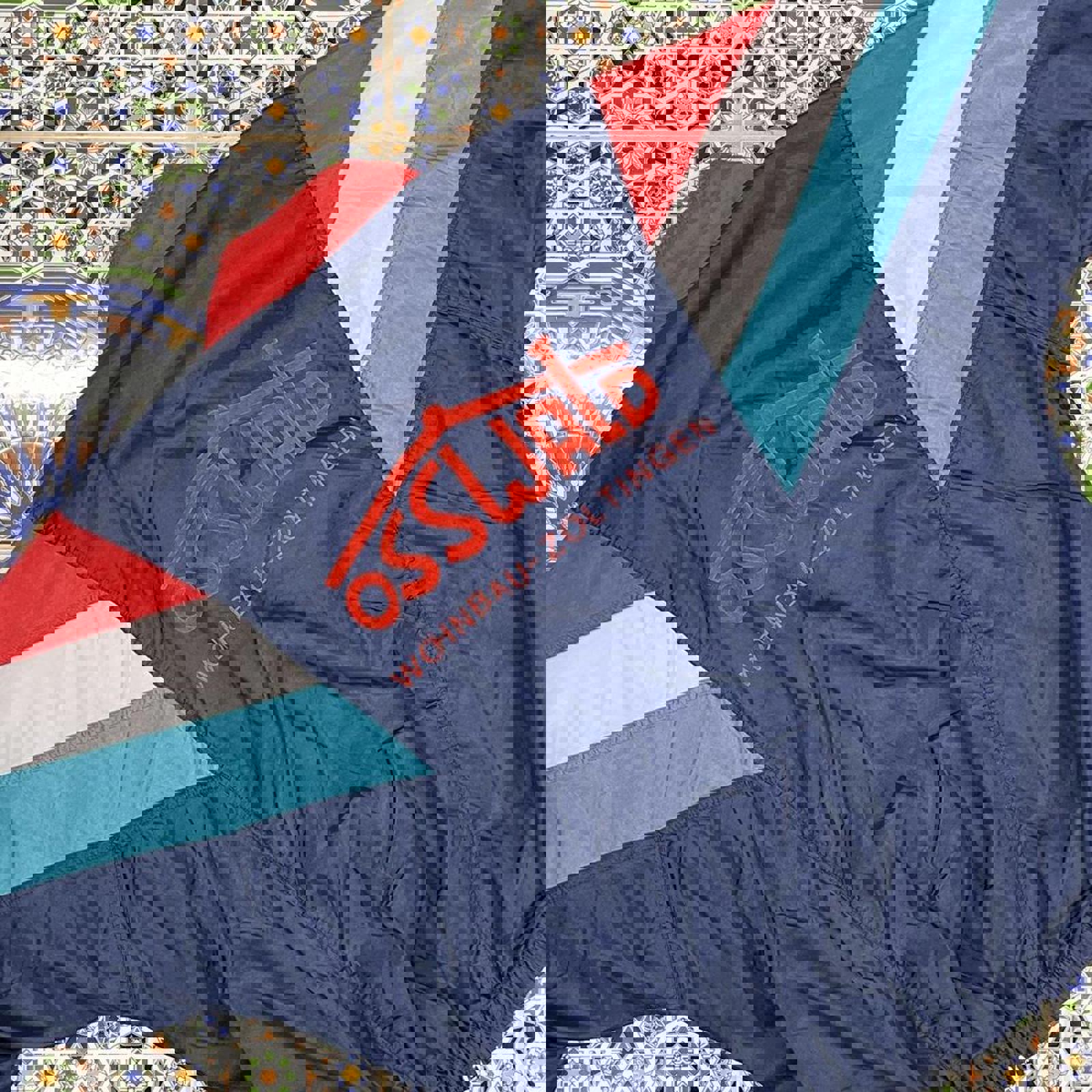 Navy, red, white and green block colour adidas windbreaker with an embroidered green adidas logo on the chest and large red osswald graphic on the back