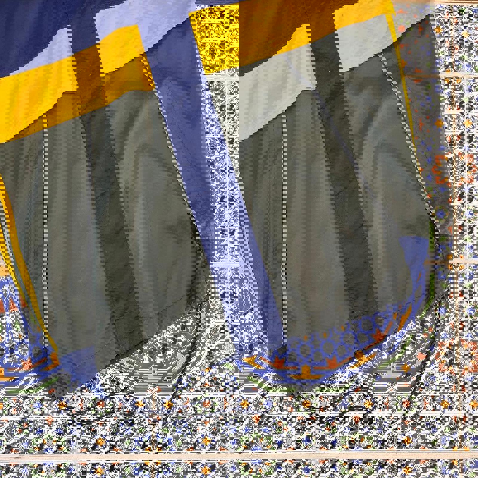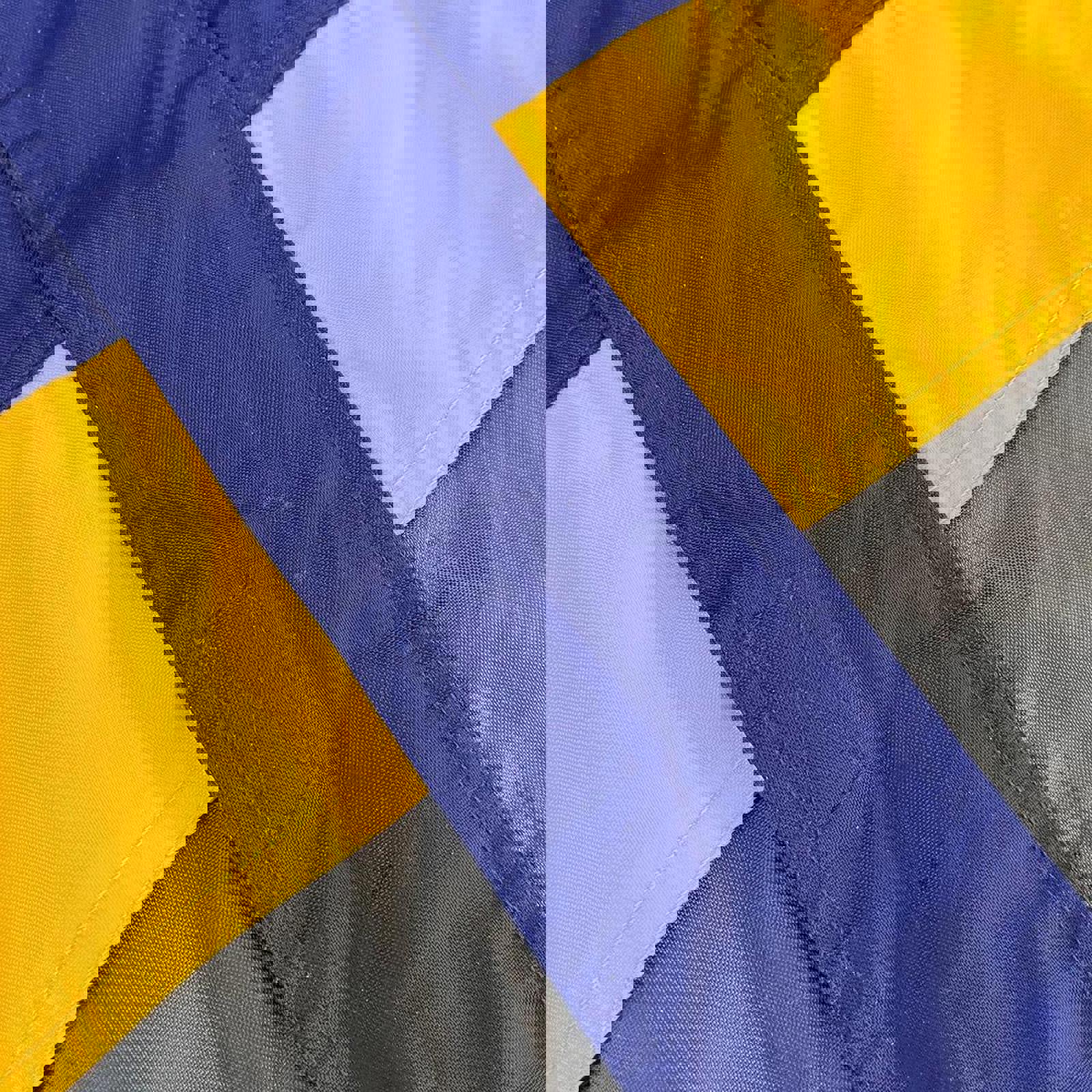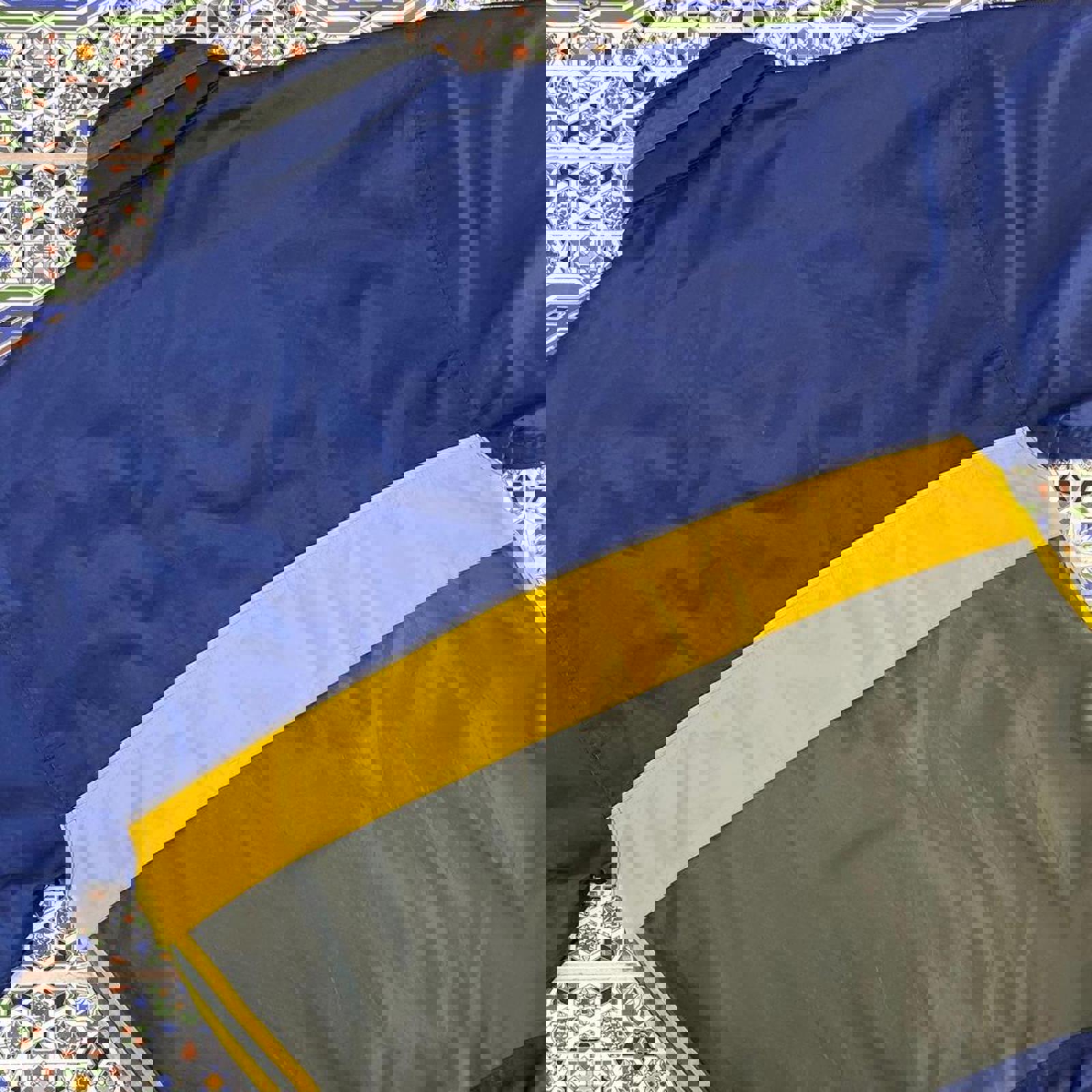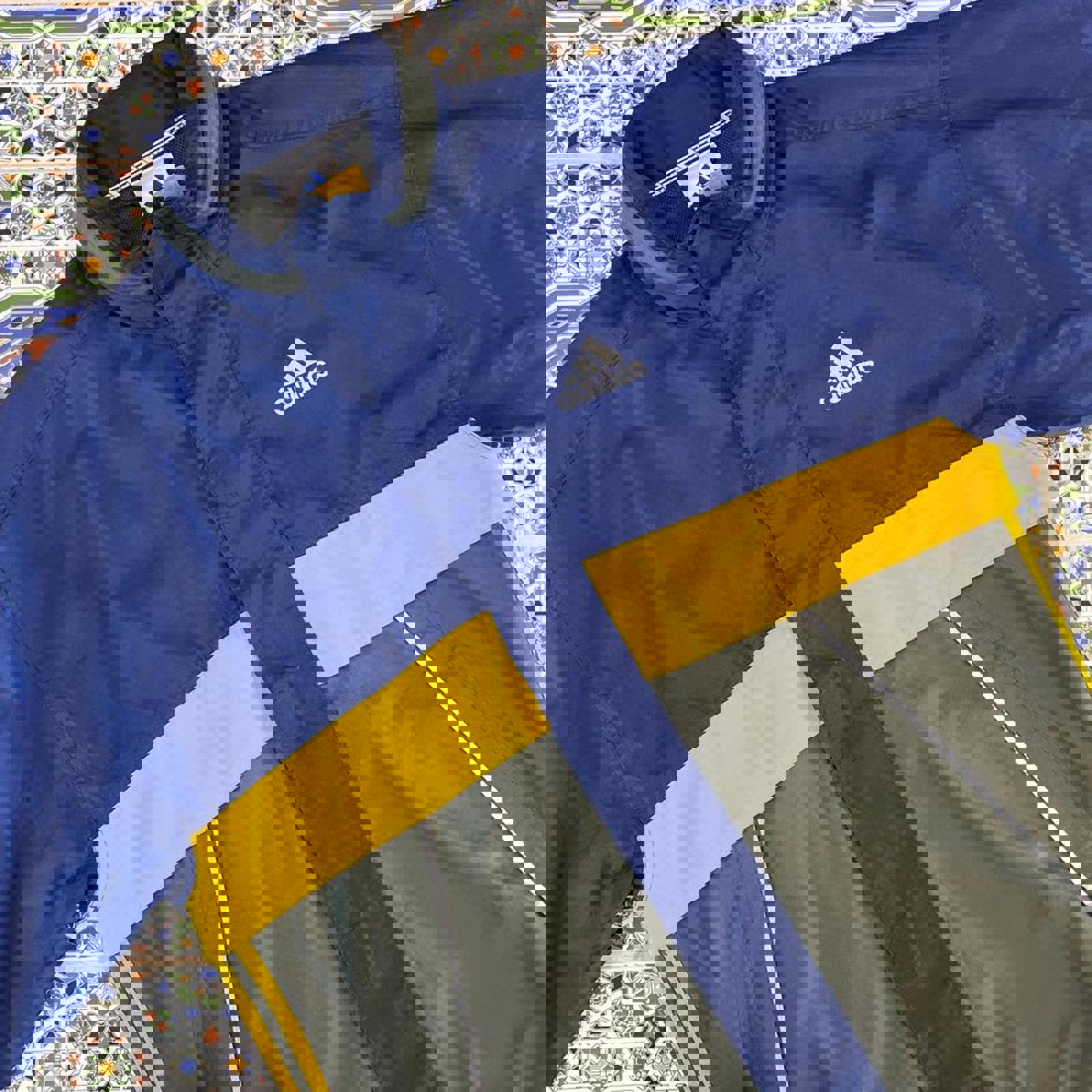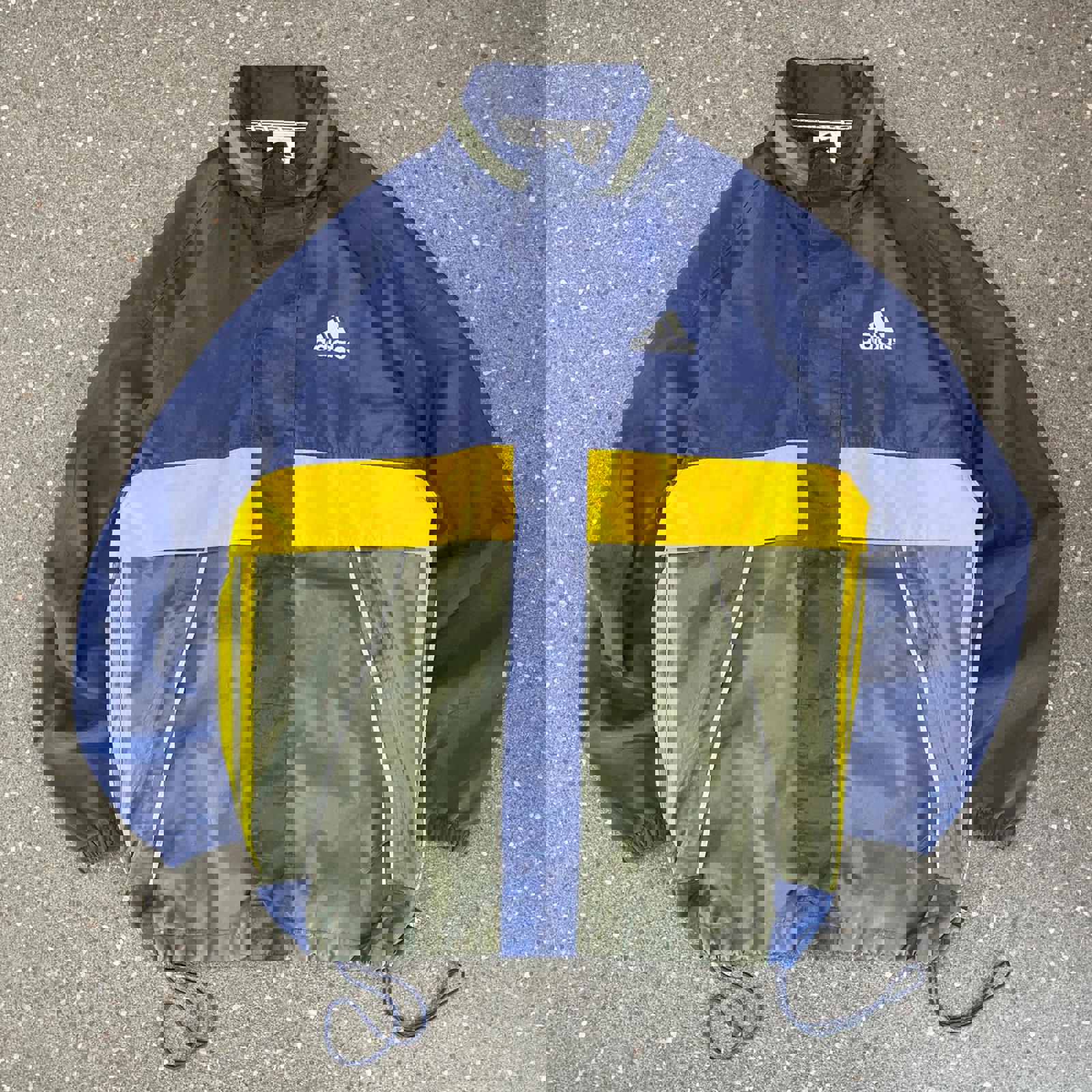 Navy, green and yellow adidas windbreaker jacket with waist adjustability, and tab on the hip, hidden hood and grey printed adidas logo on the chest