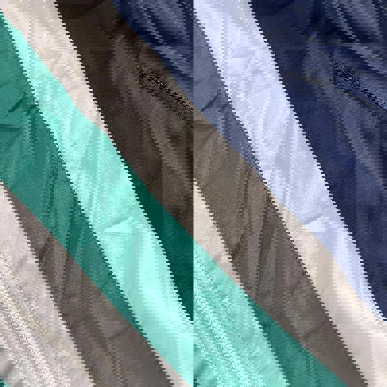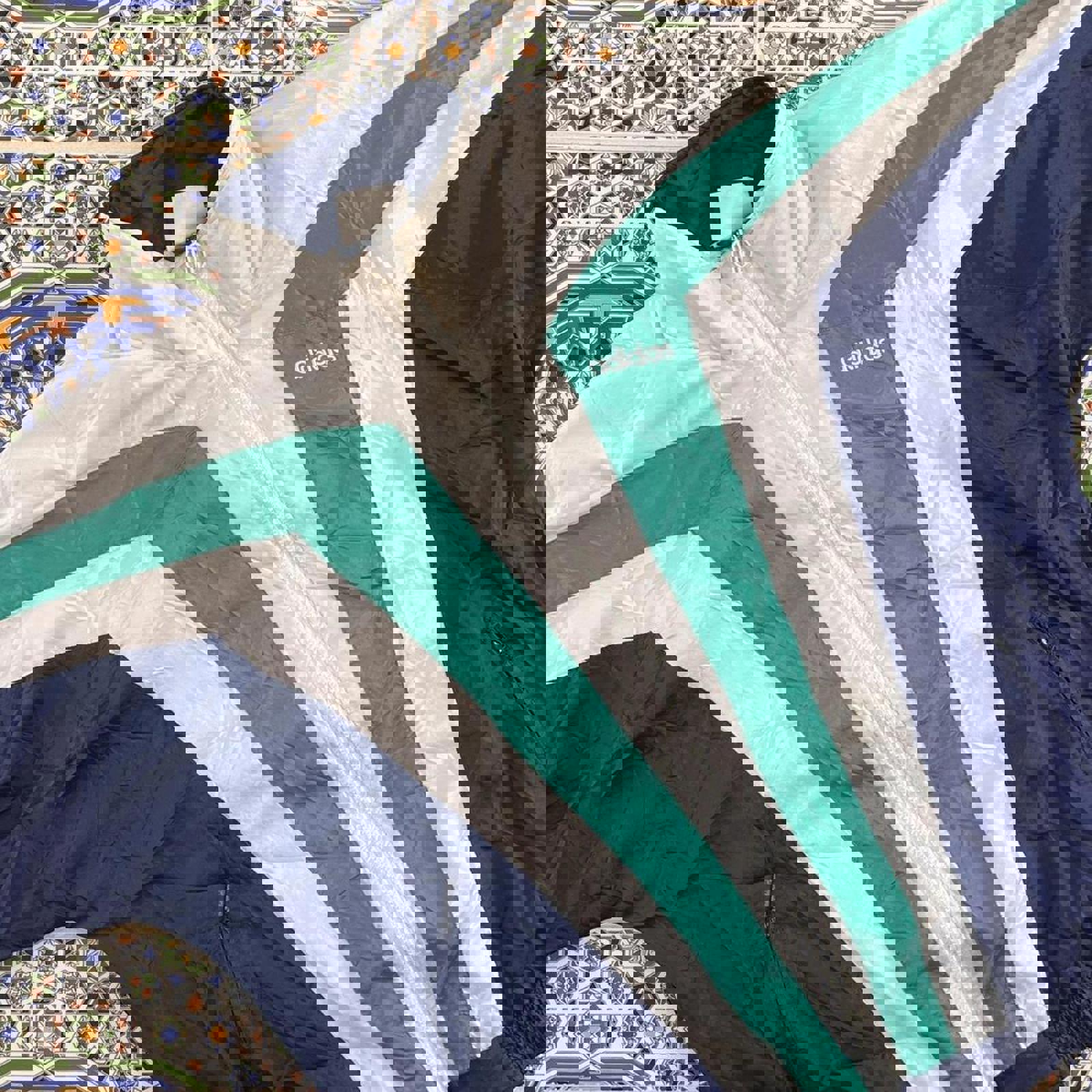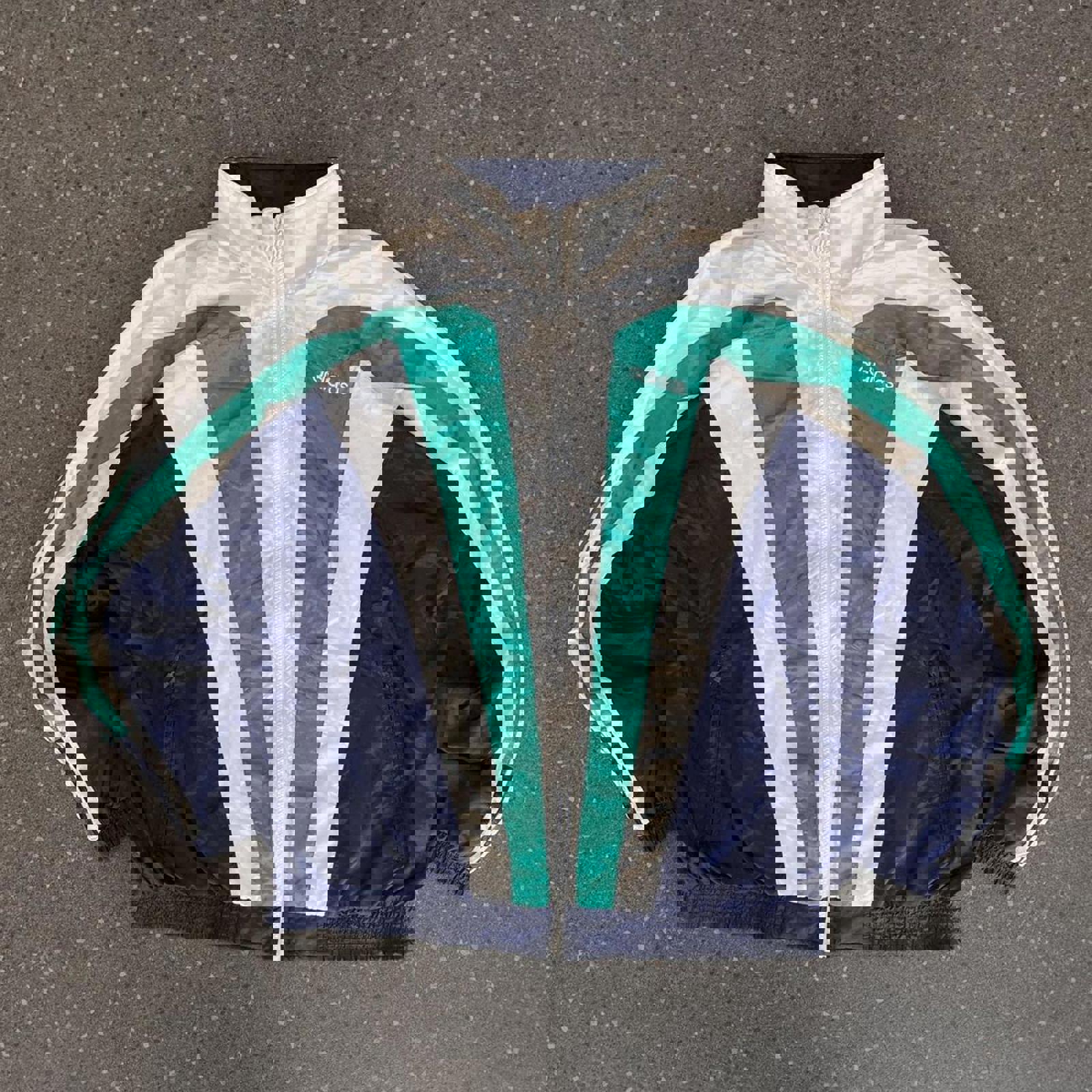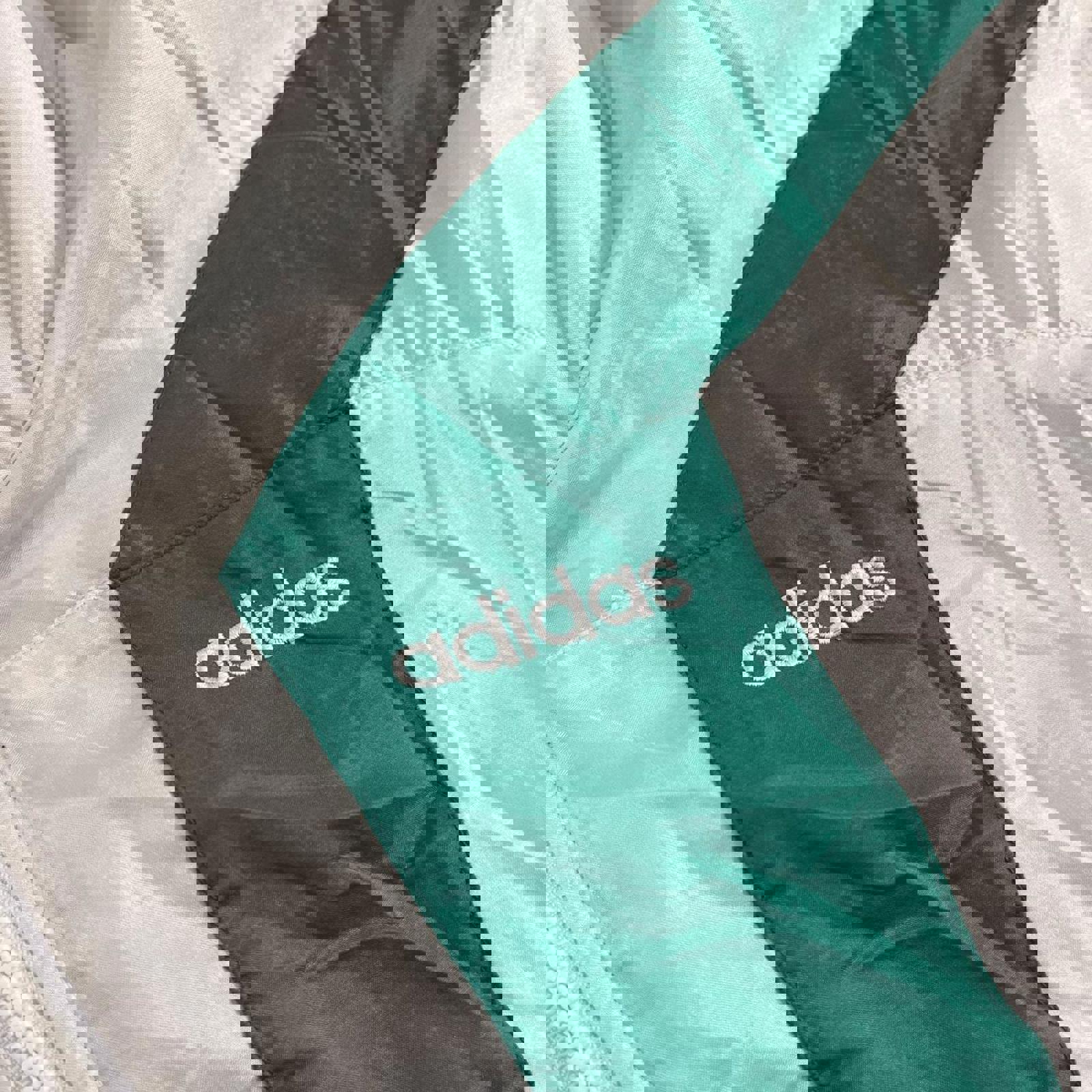 Navy, green and white adidas windbreaker jacket with a white embroidered adidas spell out on the chest, green spell out in the back of the collar and a 3 stripe zip attachment