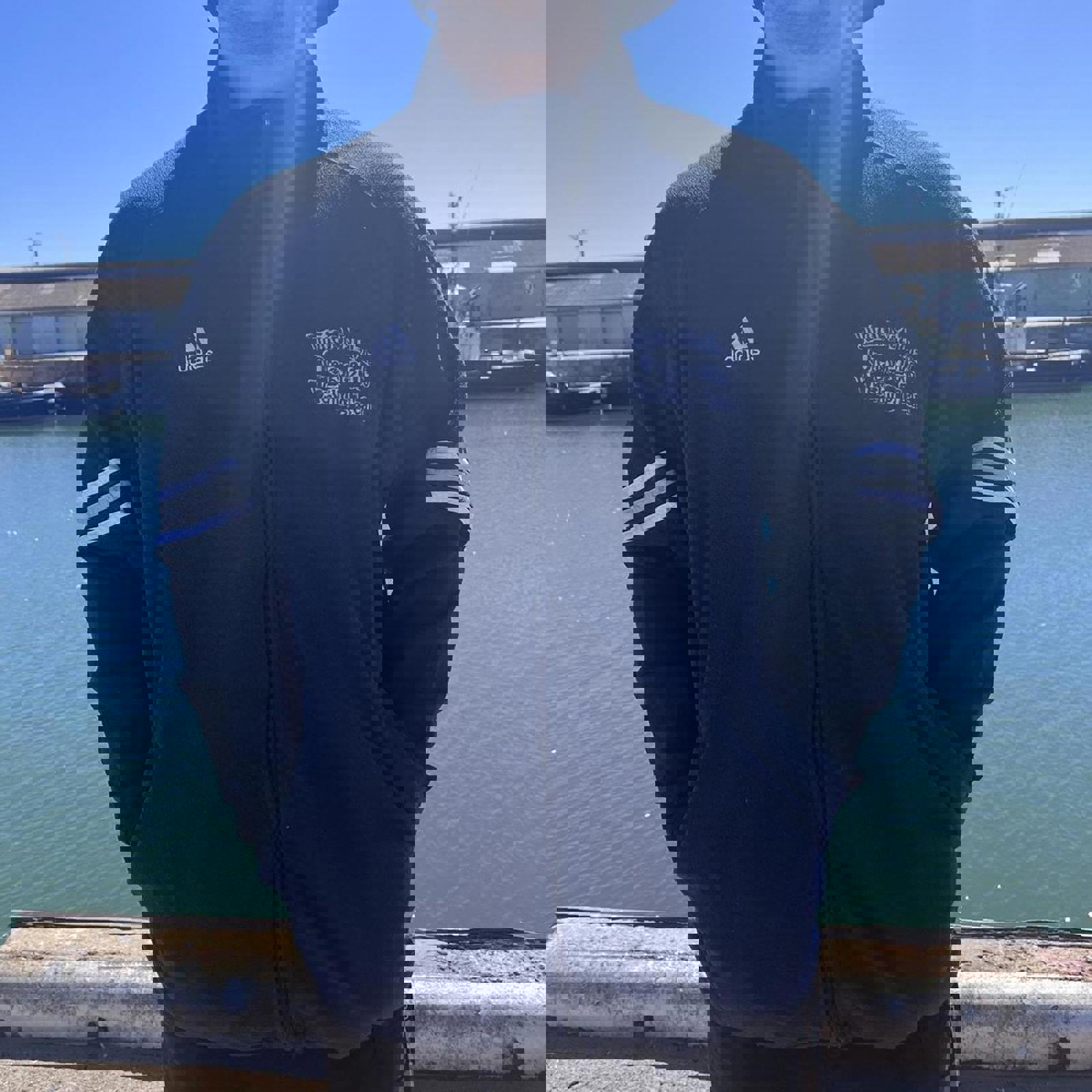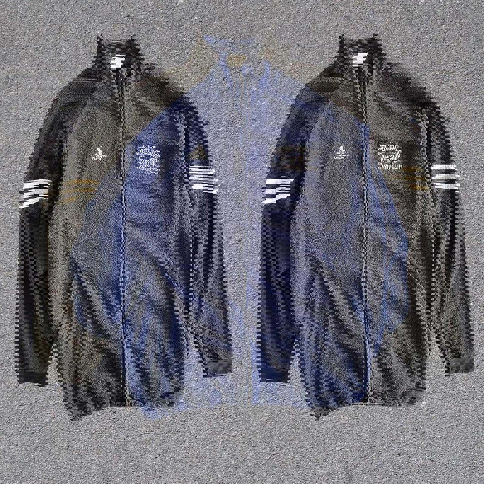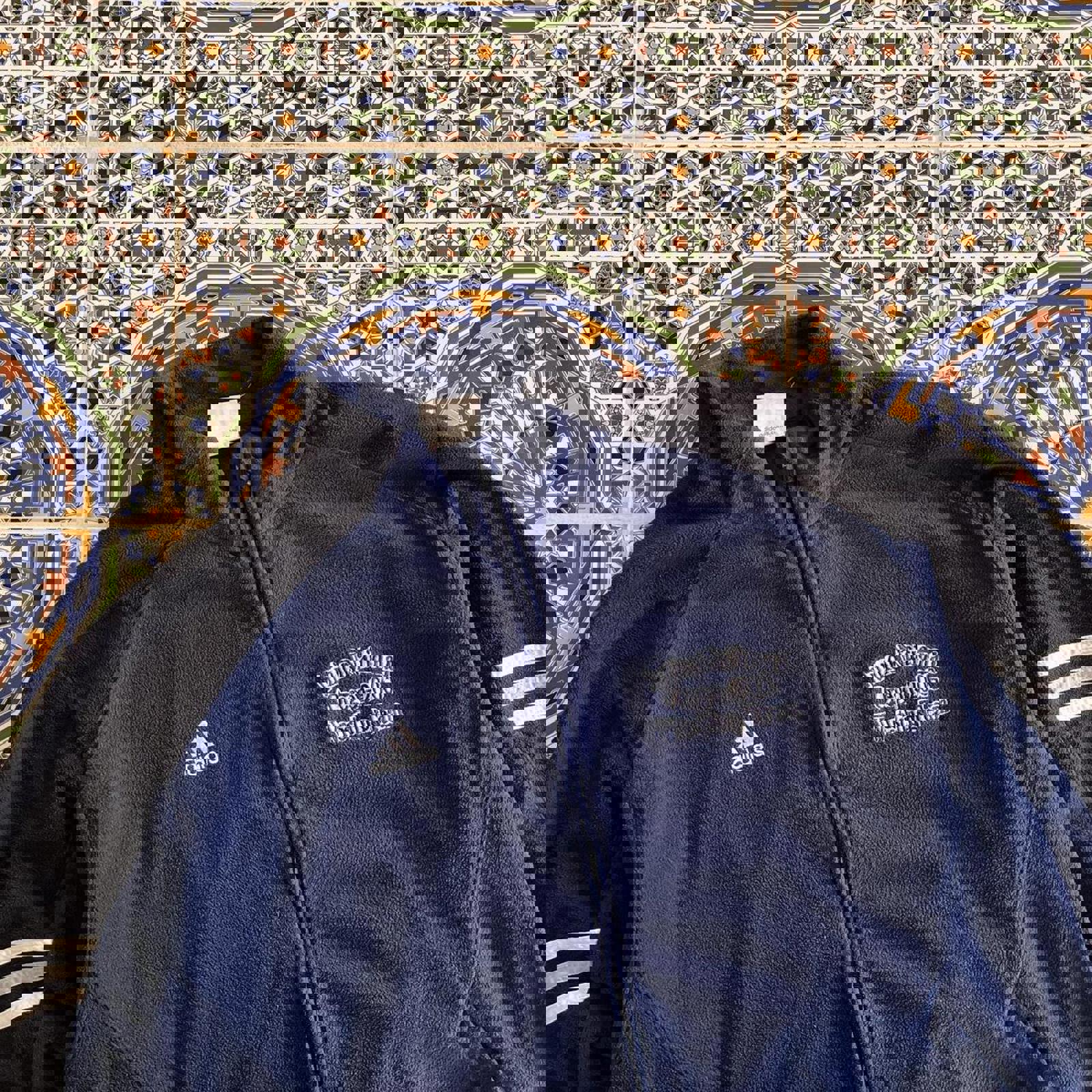 Black and navy adidas sweater jacket with embroidered adidas logo on the chest, embroidered “junior national Oregon 2006 wrestling team” on the chest, side pockets and white adidas tree strips on the sleeves Measurements Pit to pit 62cm Top to bottom 70cm