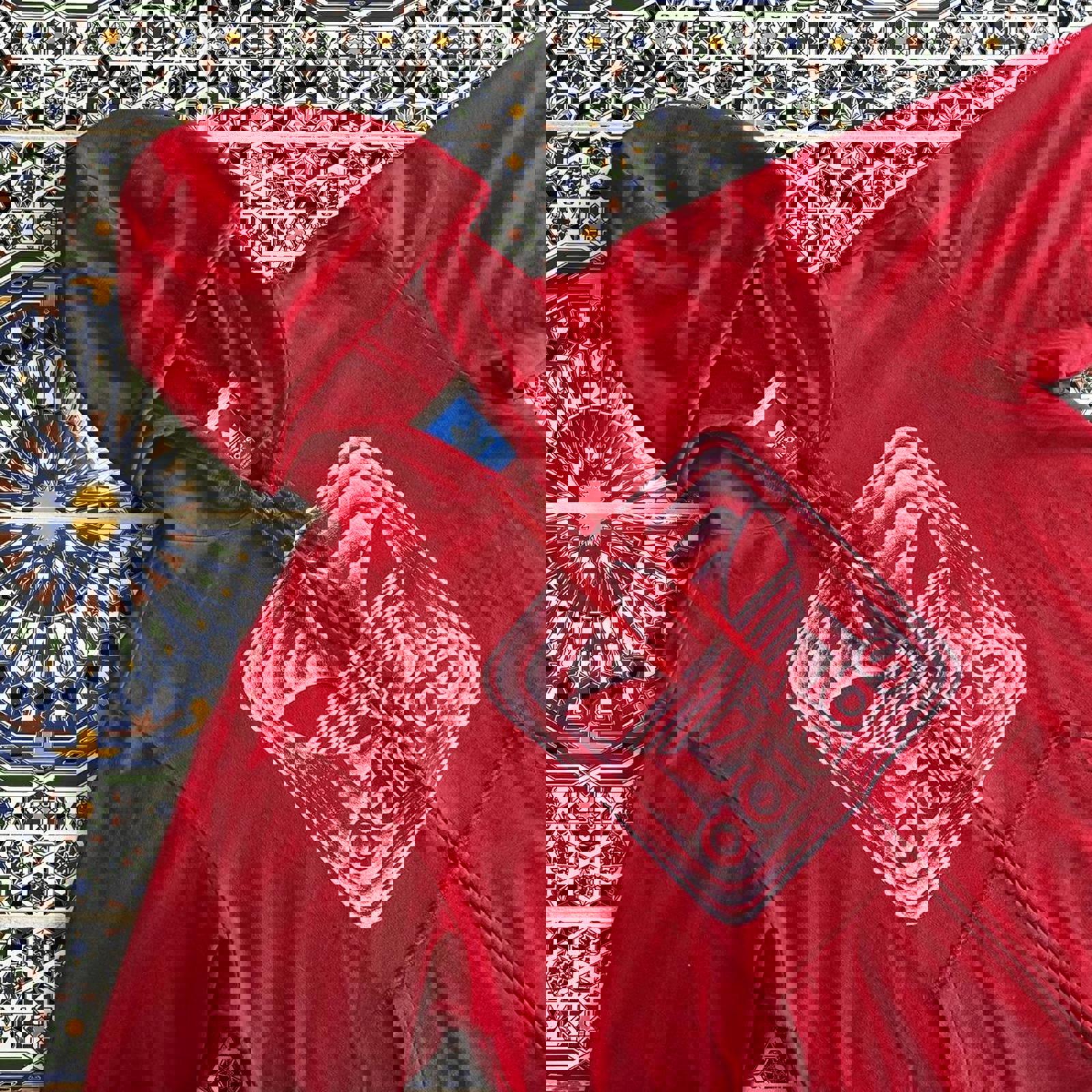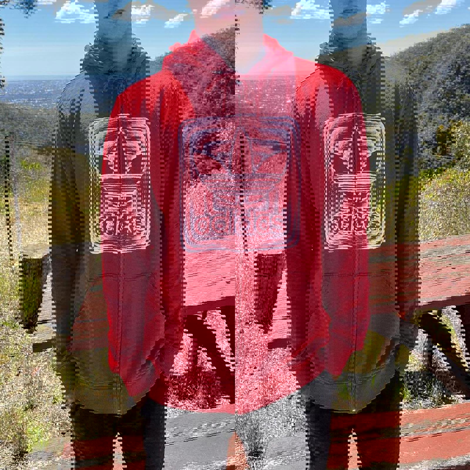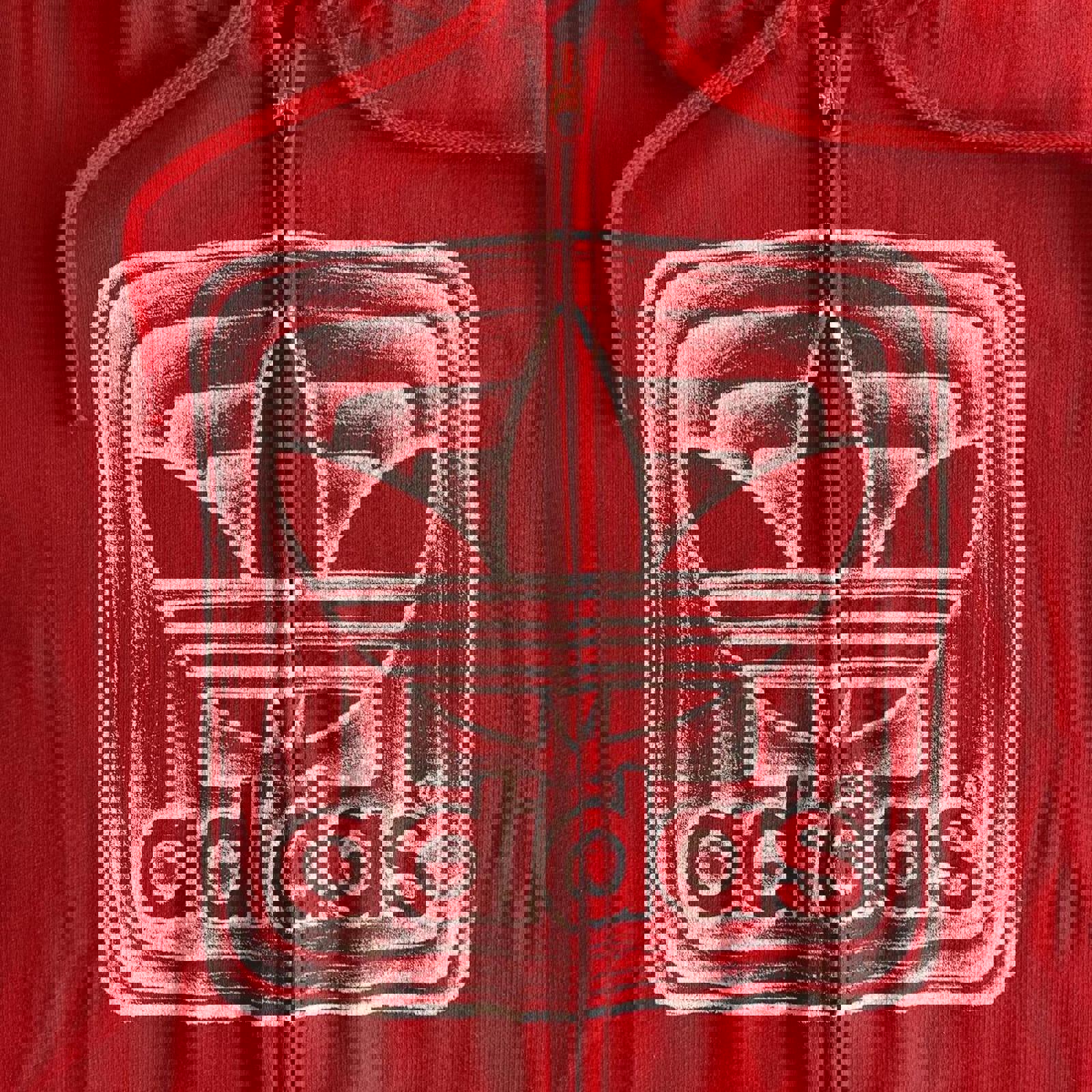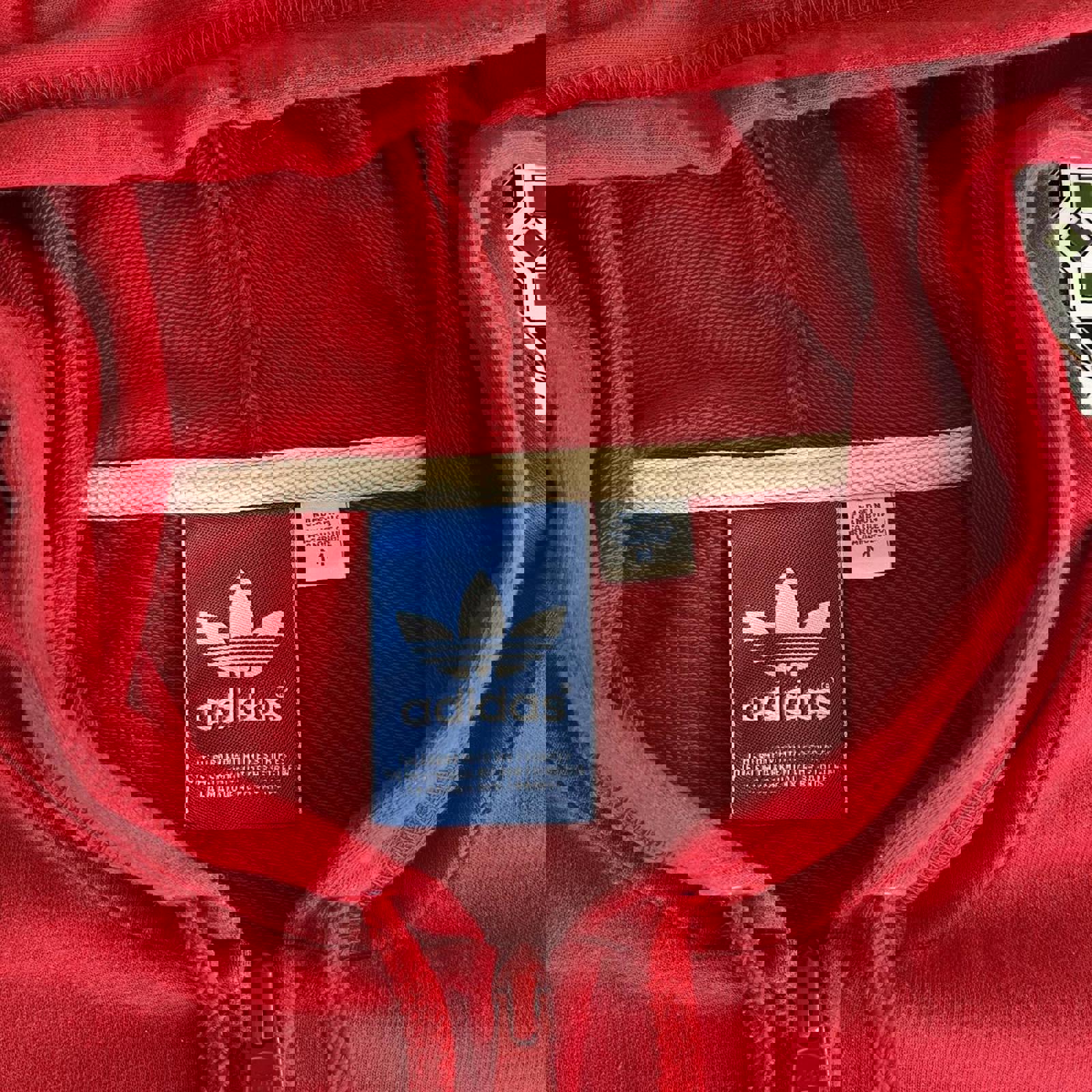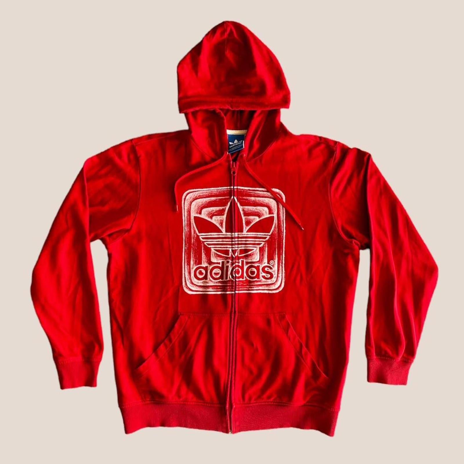 red adidas zip up hoodie with white graphic on the centre of the chest