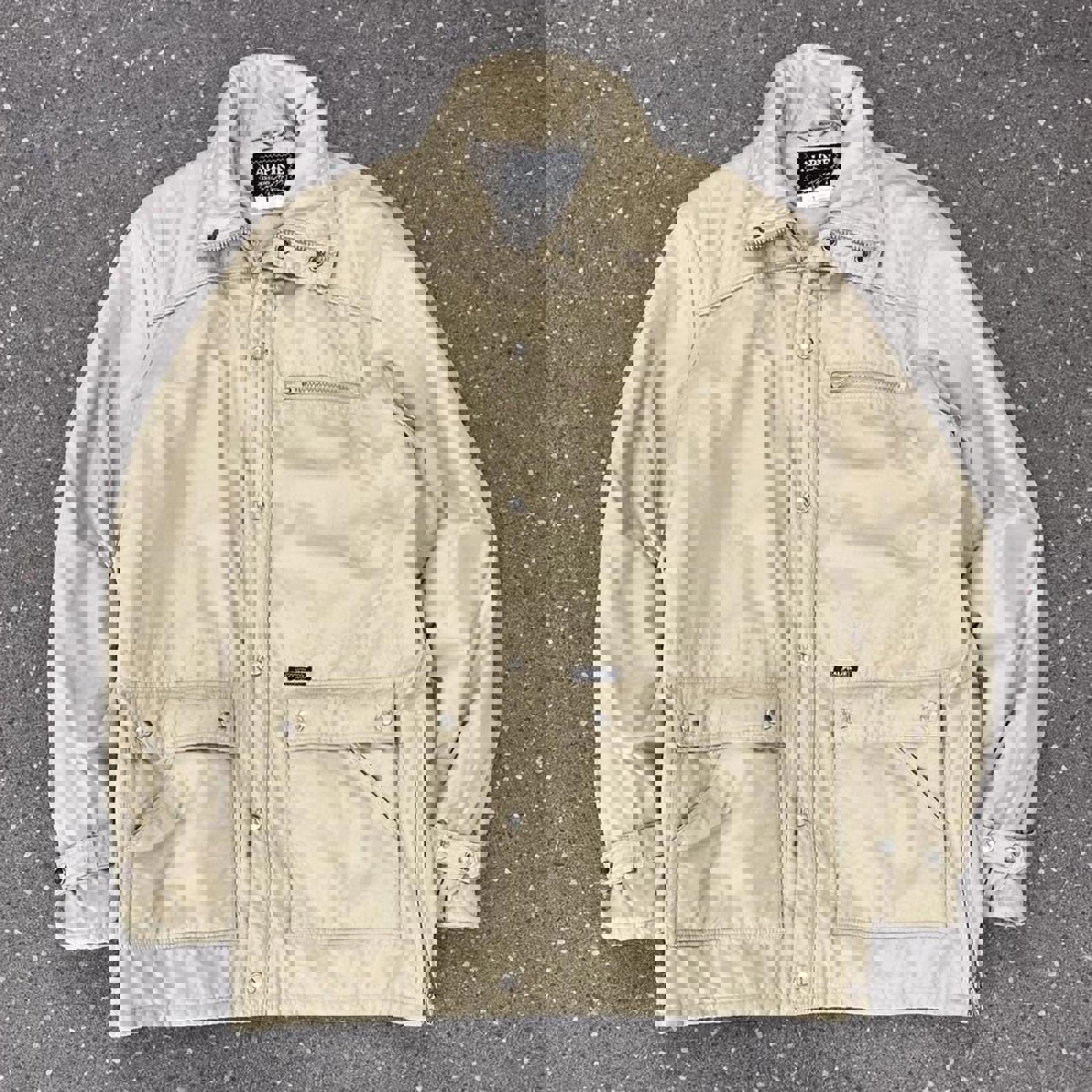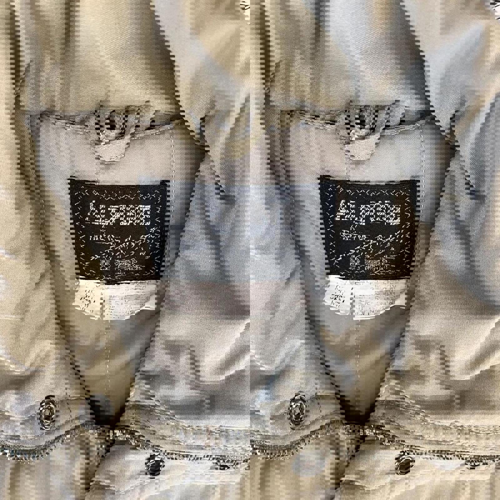 Beige vintage alpine ski jacket with a patch above the front belly pocket, zips on the side and thick interior cuffs