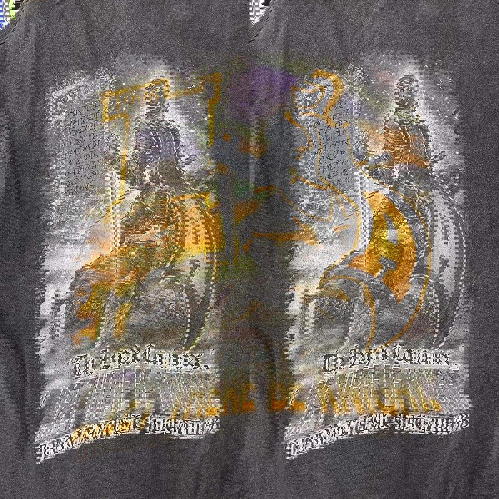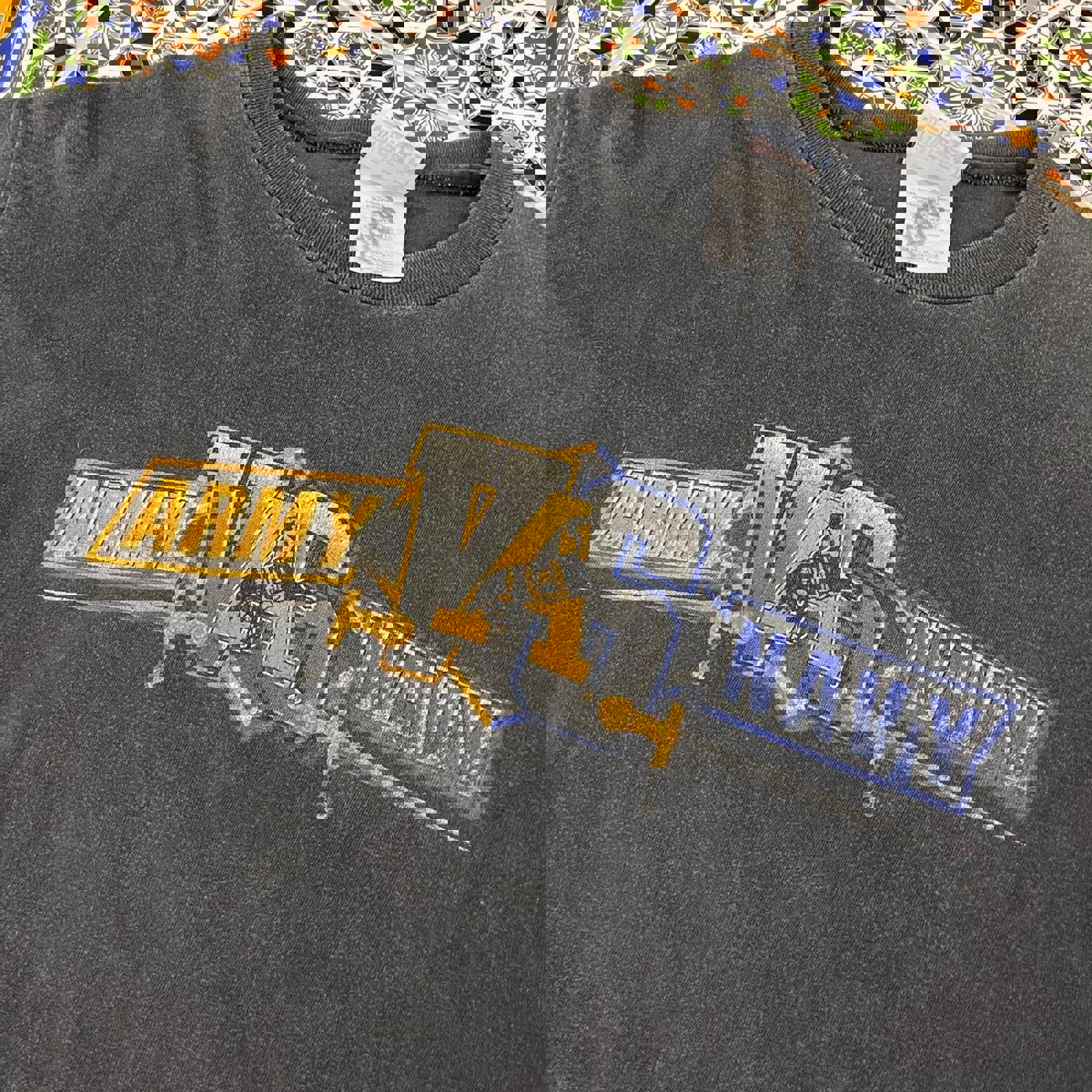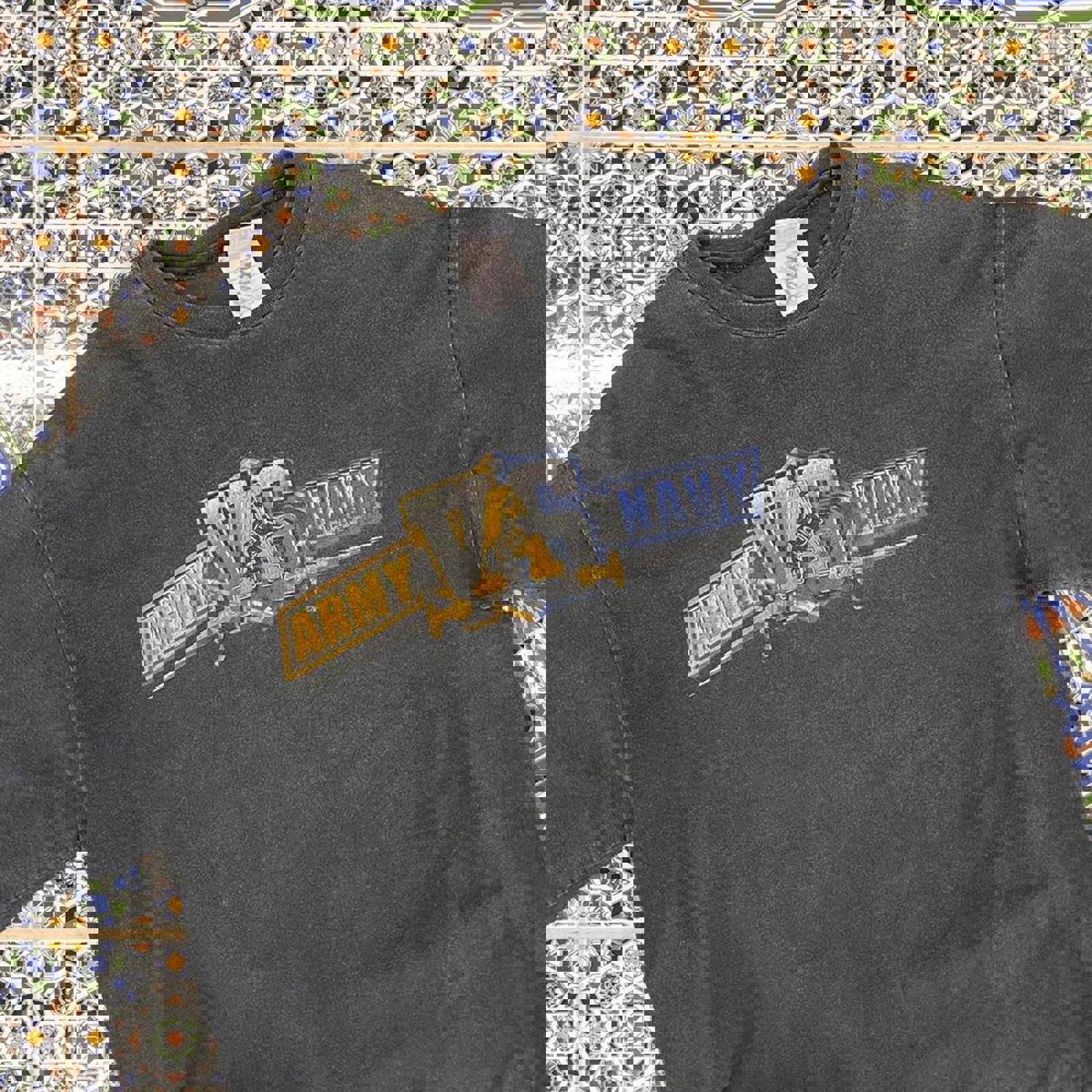 Vintage black Hanes long sleeve tshirt with a yellow and blue navy vs army graphic on the front and a large medieval football graphic on the back