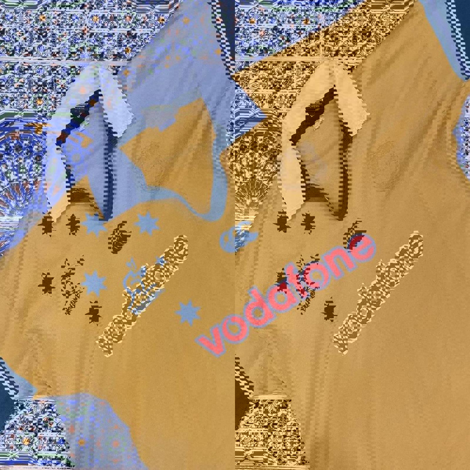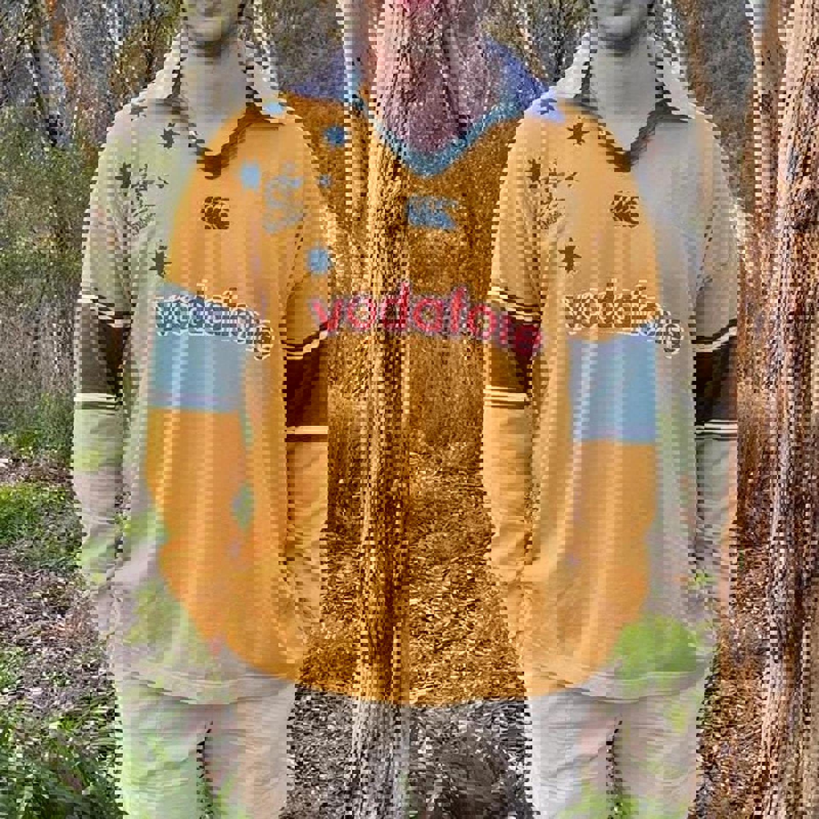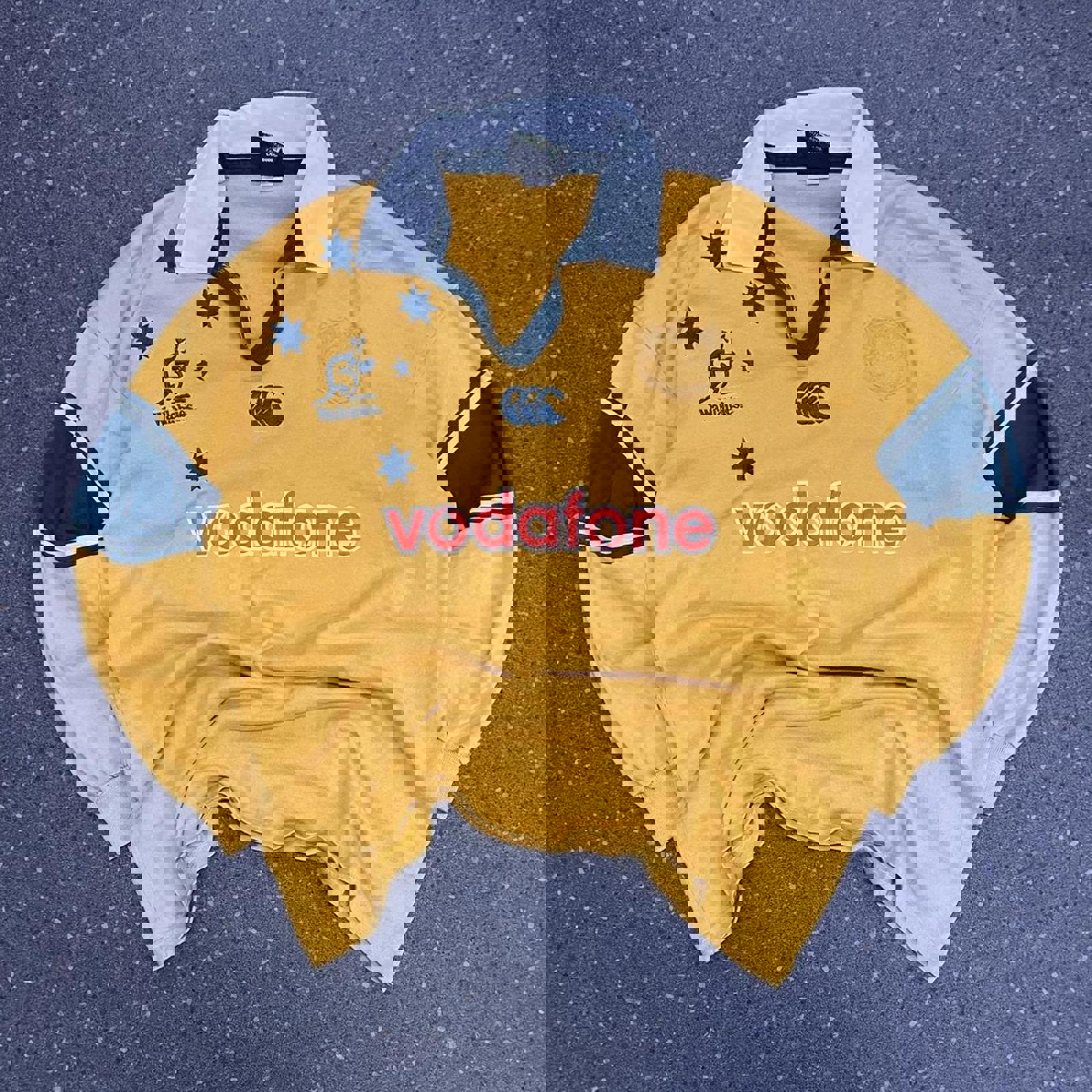 Yellow, white and green 1999-2000 Australian wallabies rugby jumper with all embroidered green logos and a printed red and white Vodafone on the front