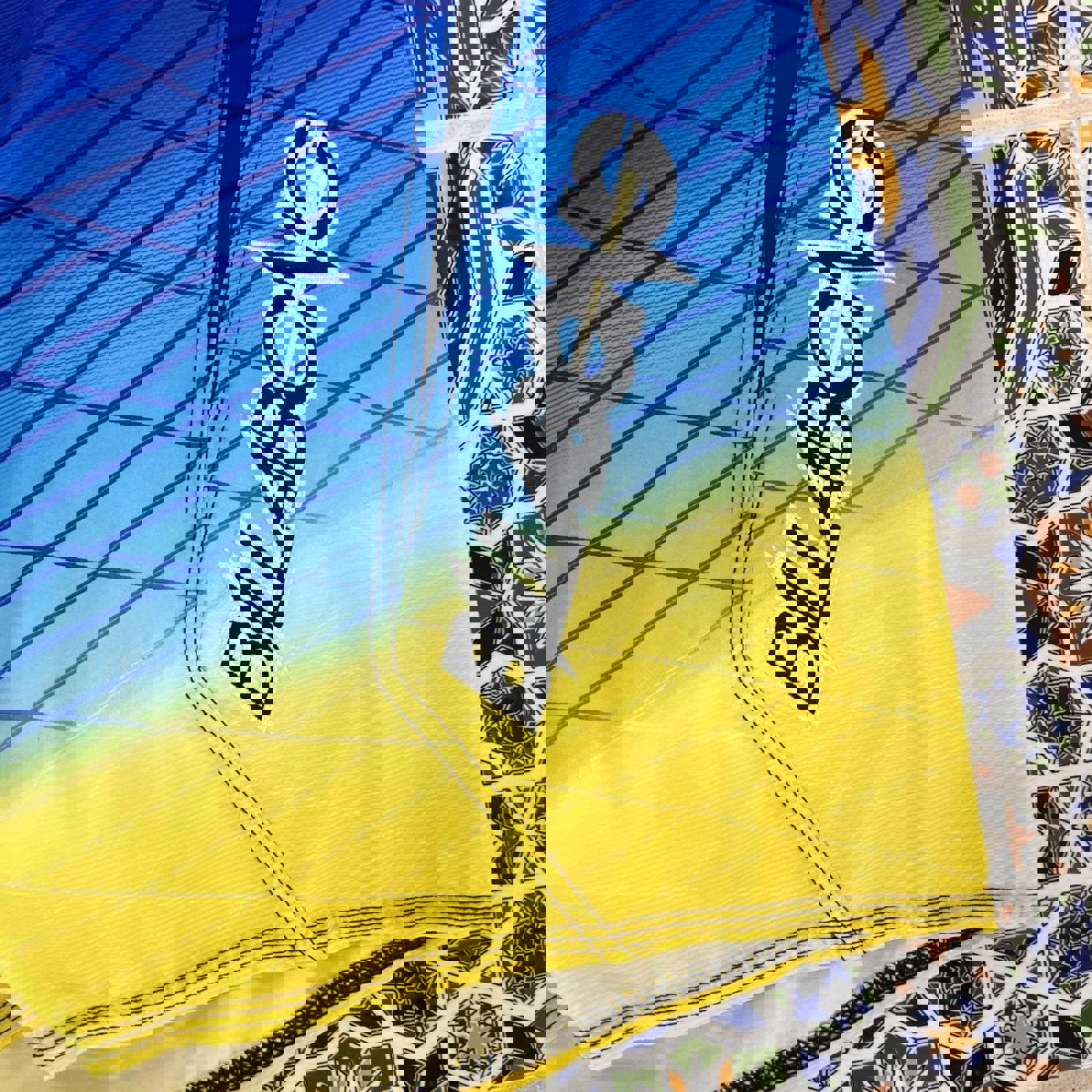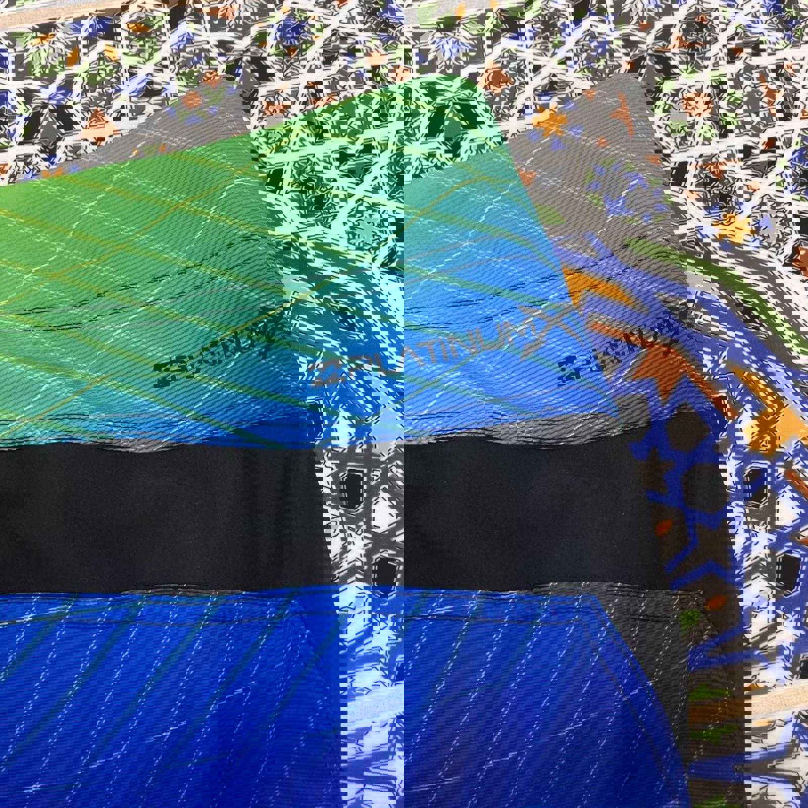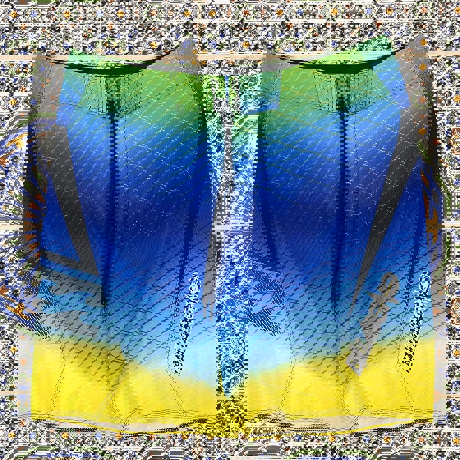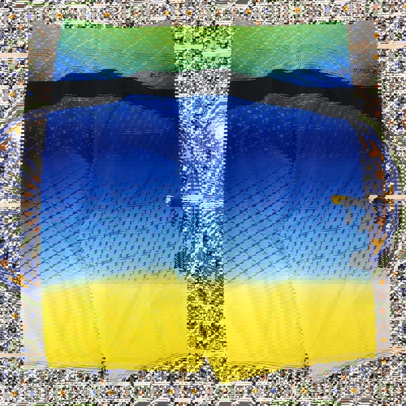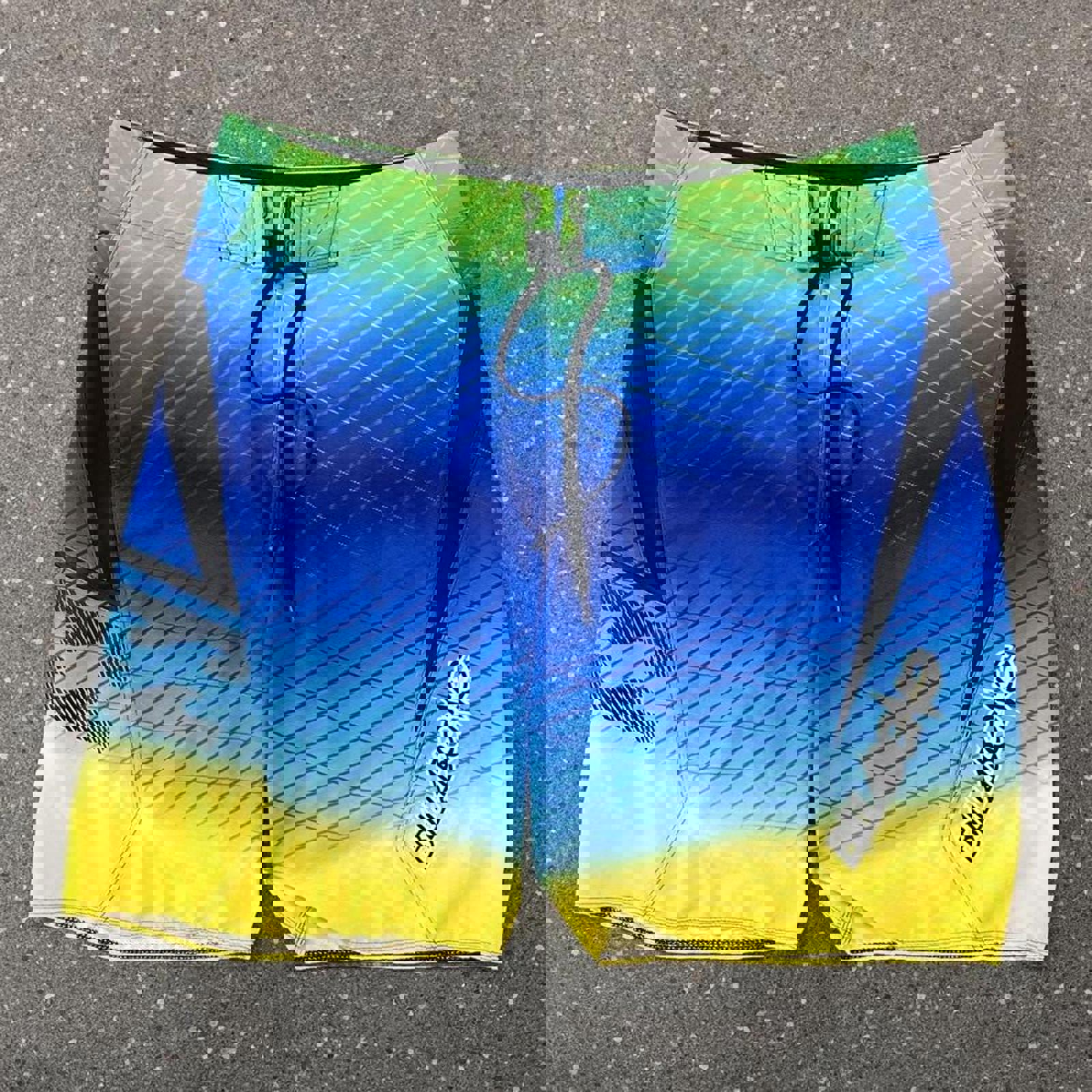 green, blue, black and yellow billabong swim trunks with an embroidered spellout on the side of the leg and a printed logo on the other side leg