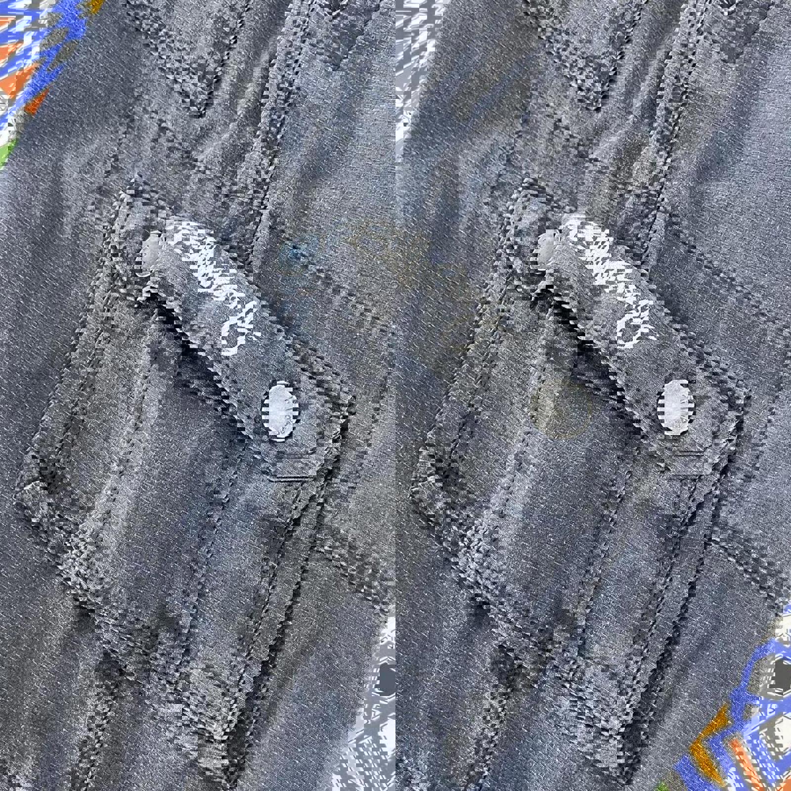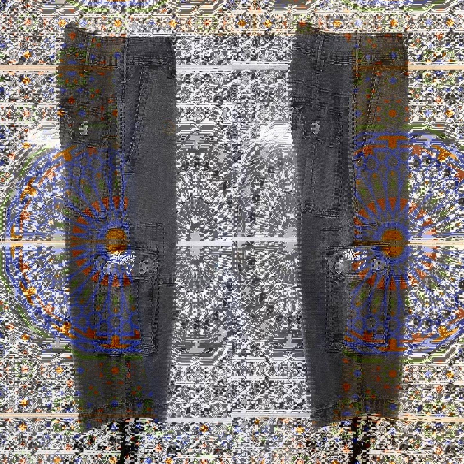 black faded billabong cargo shorts with detailed buttons and an embroidered white billabong embroidered spell out on the side pocket