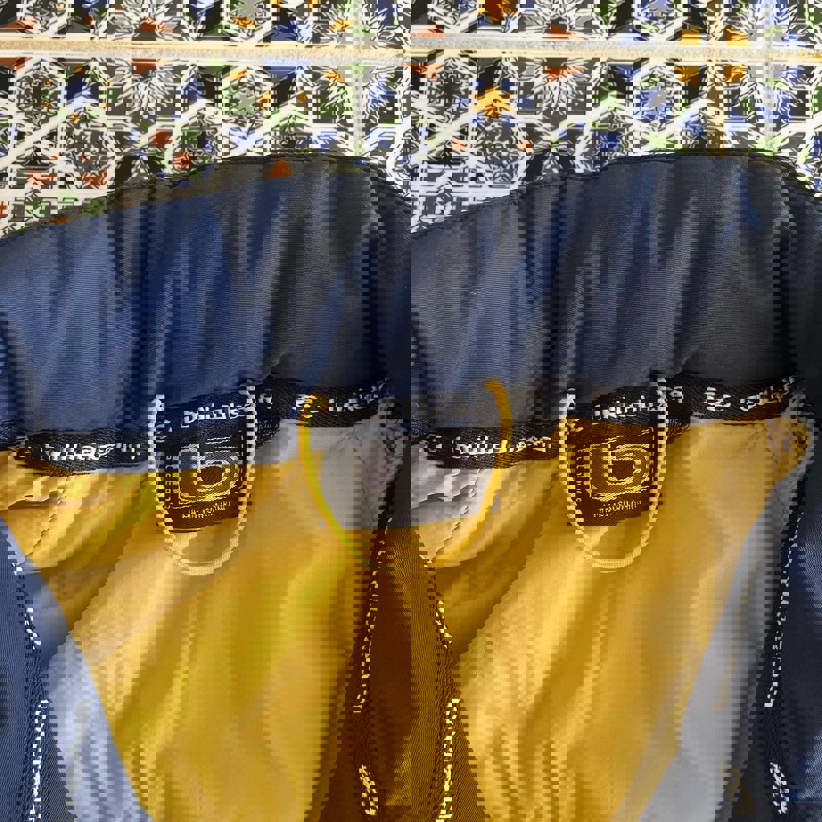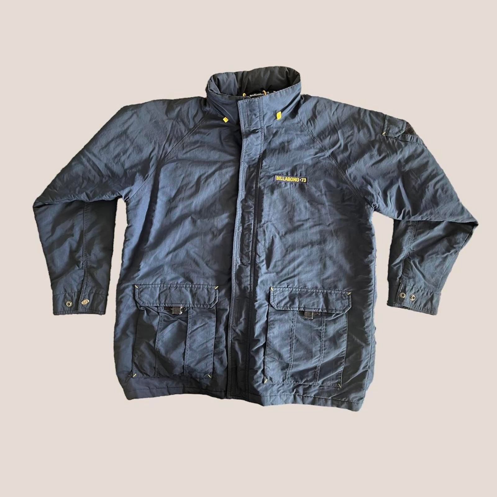 Navy billabong jacket with yellow embroidered spell out on the chest, a small pocket on the arm, detailed buttons, yellow accents and a removable hood
