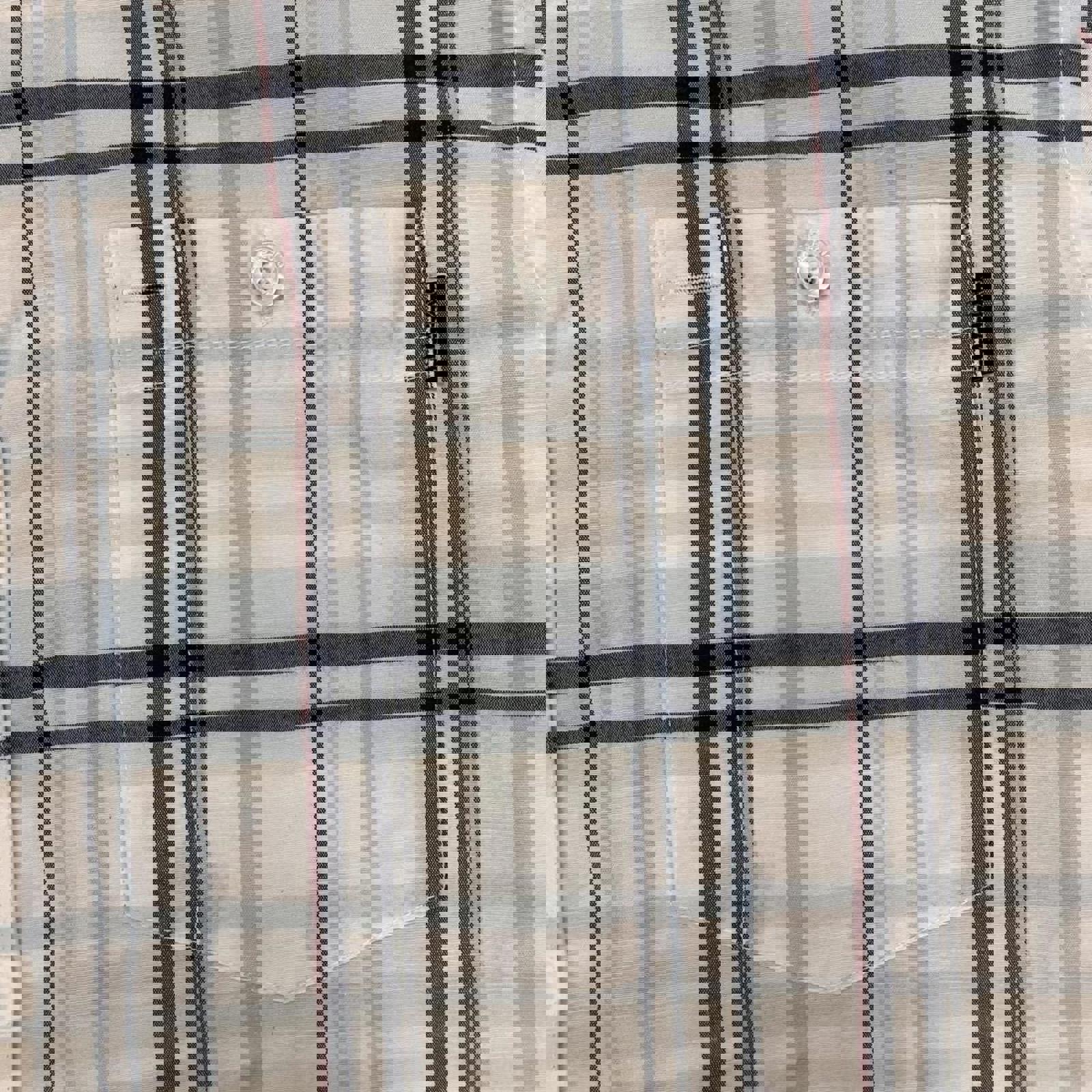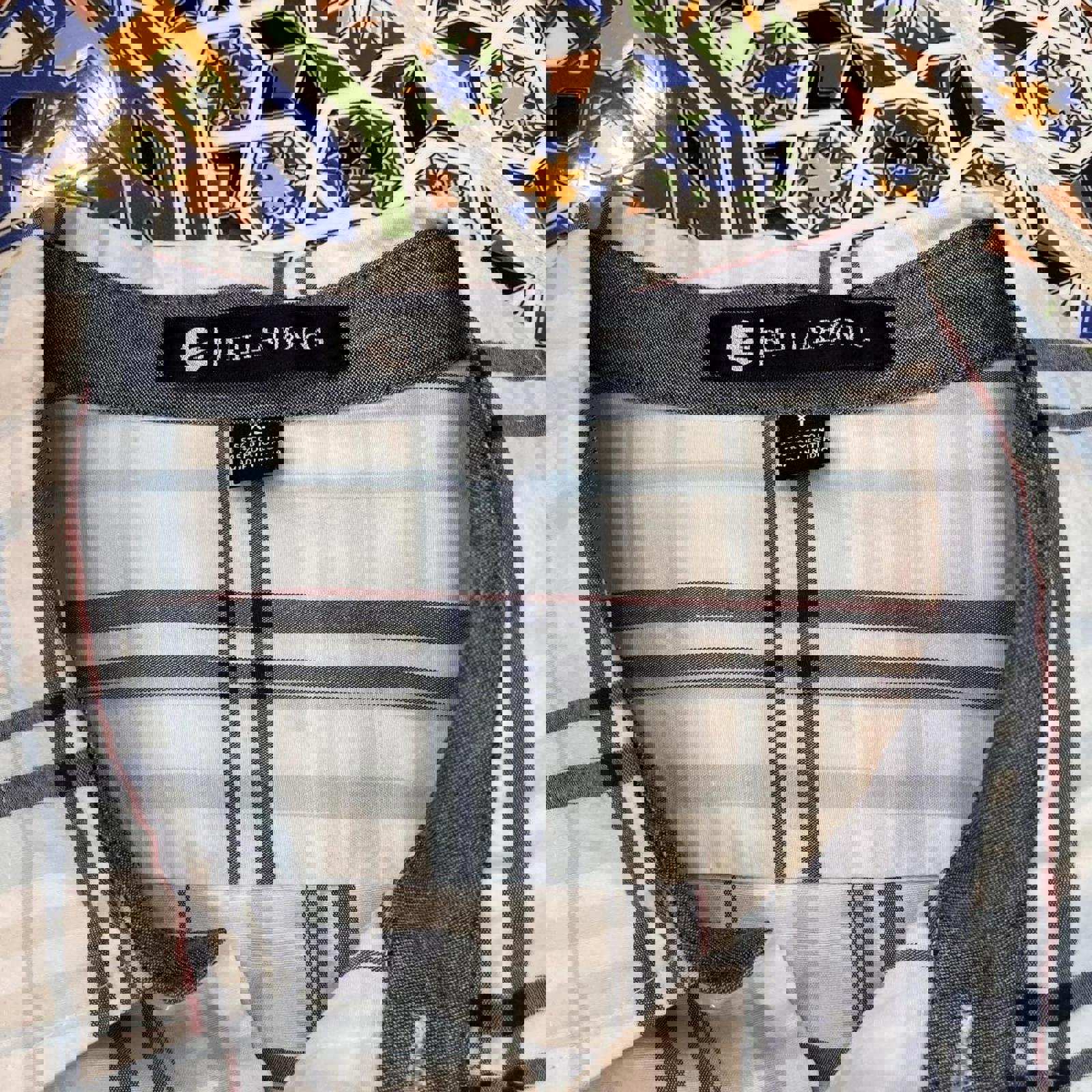 grey, baby blue and white new school billabong short sleeved button up shirt with a singular chest pocket with a tab