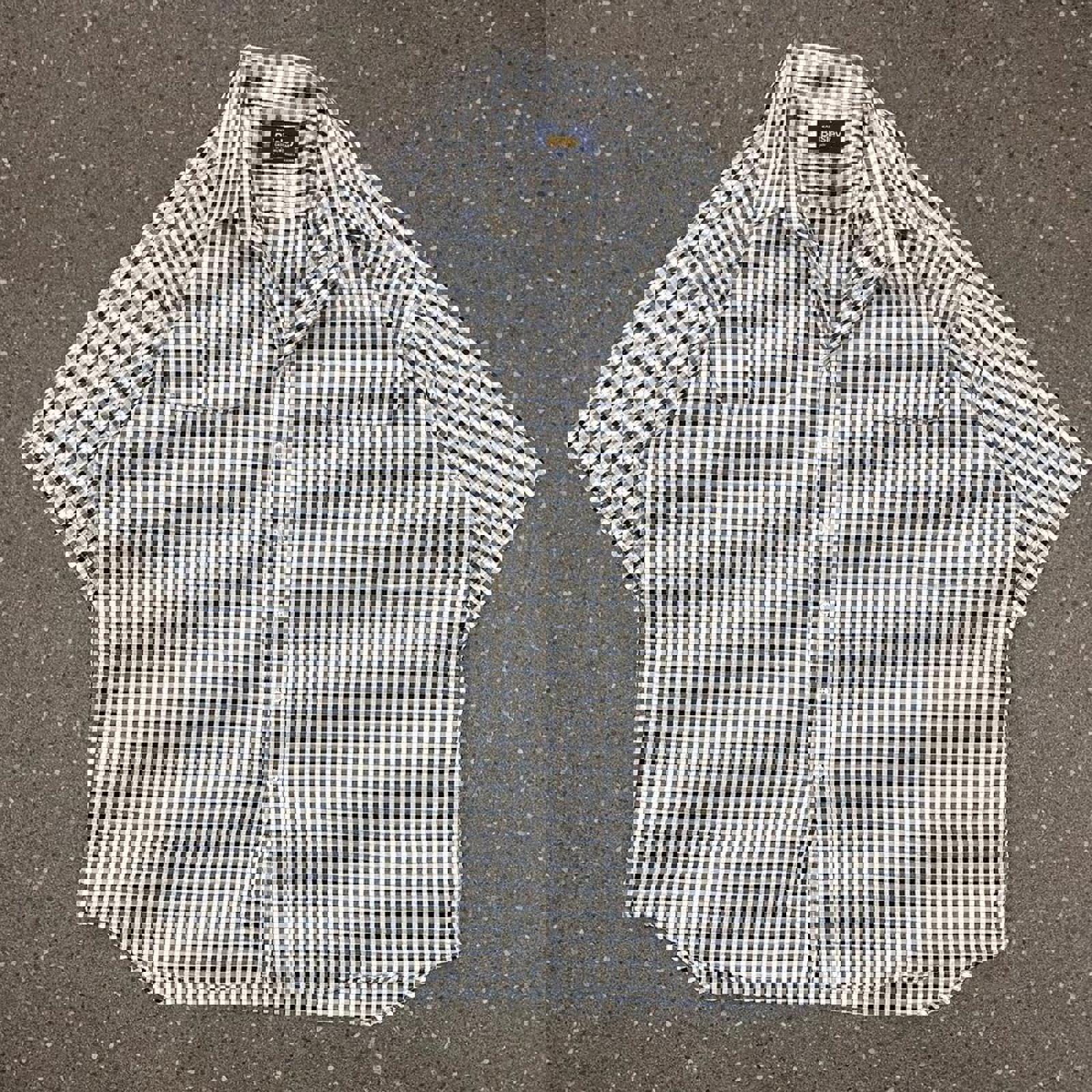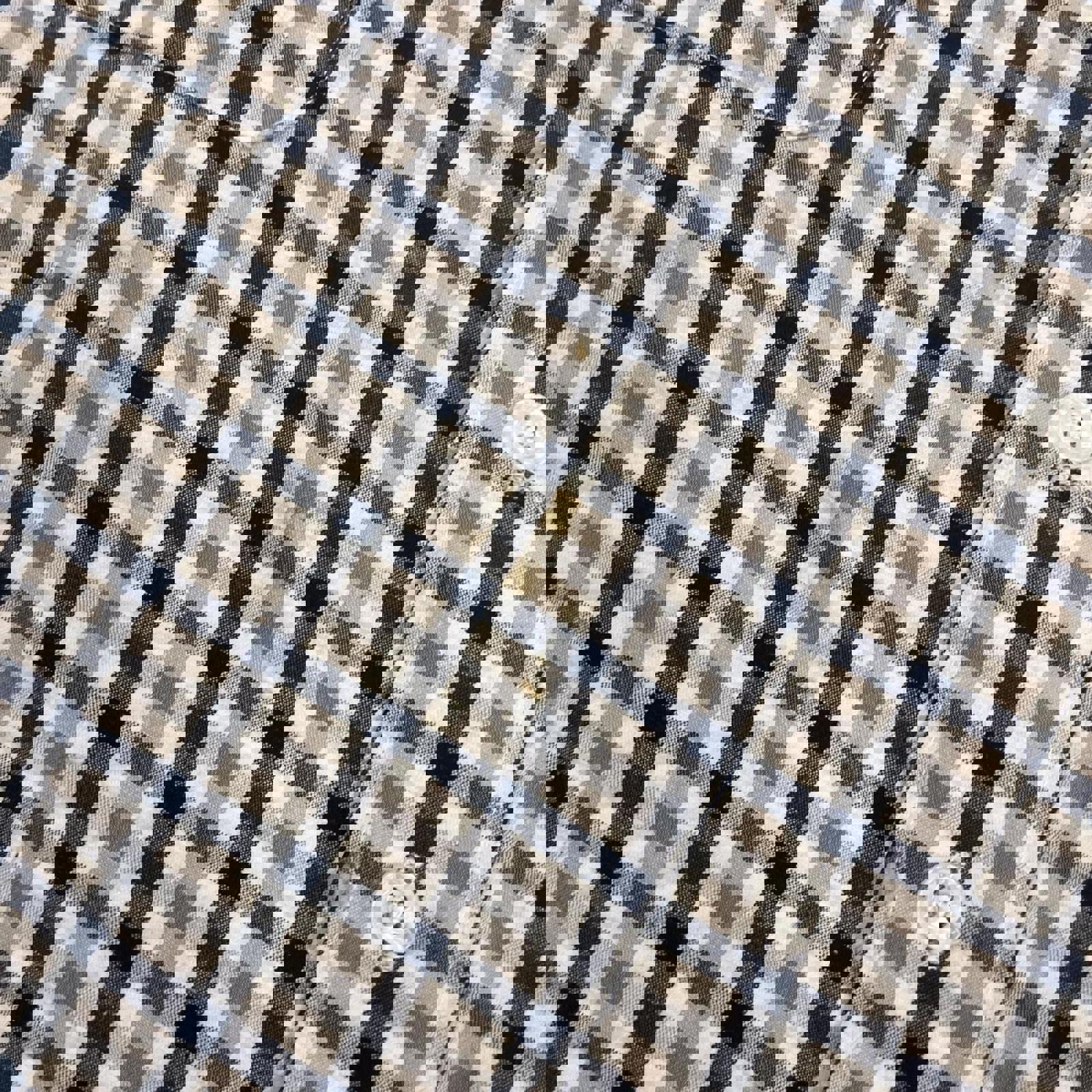 Navy, baby blue, grey and white checkered bisley short sleeve button up shirt with double chest pockets