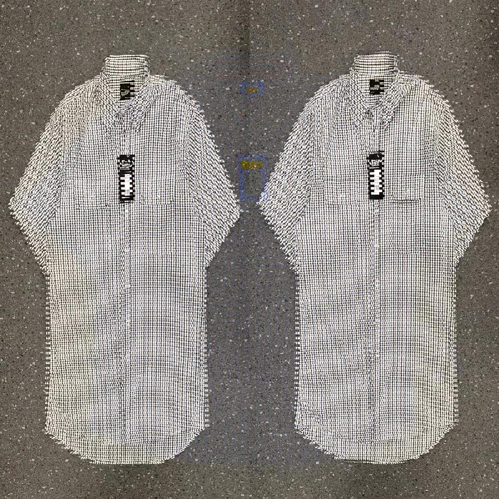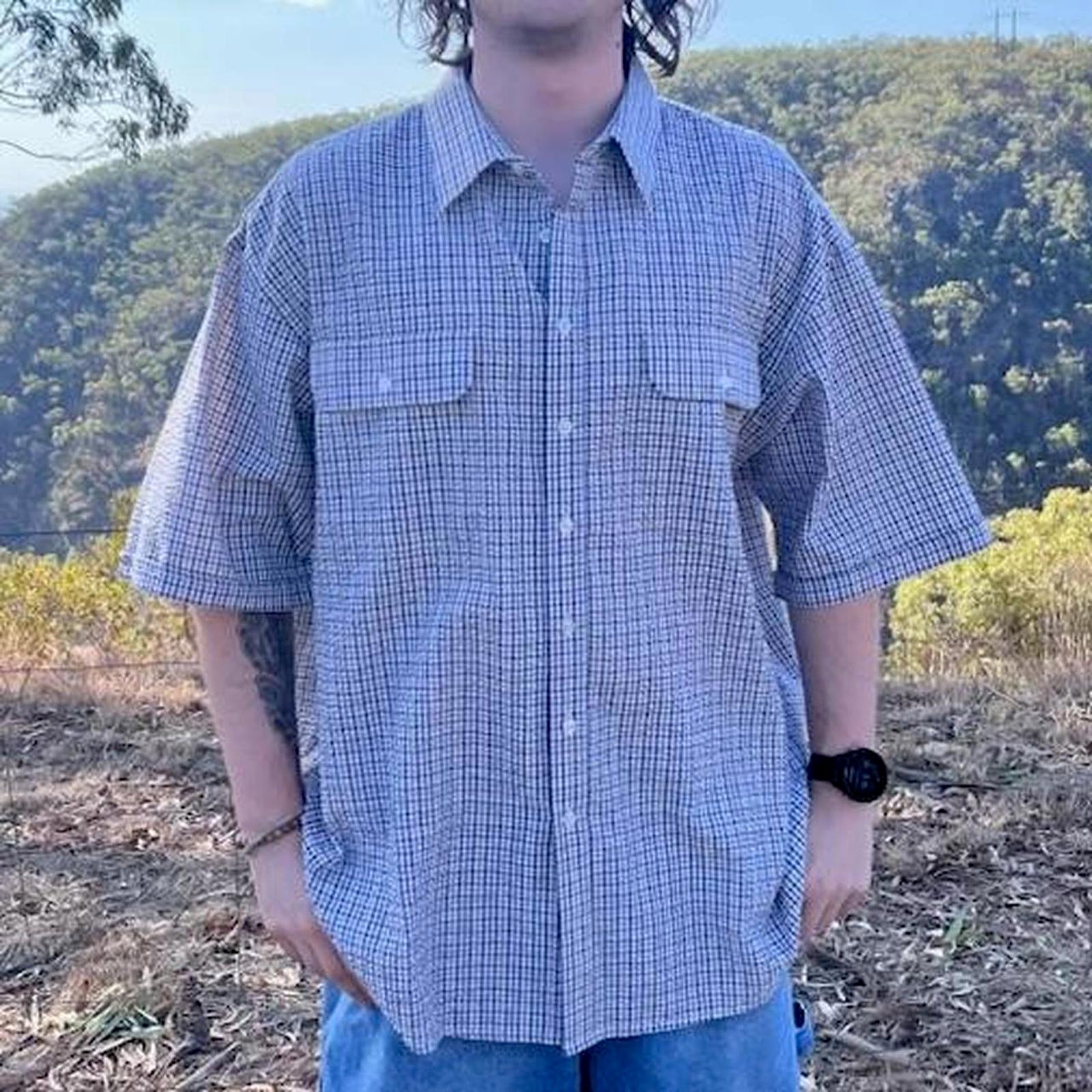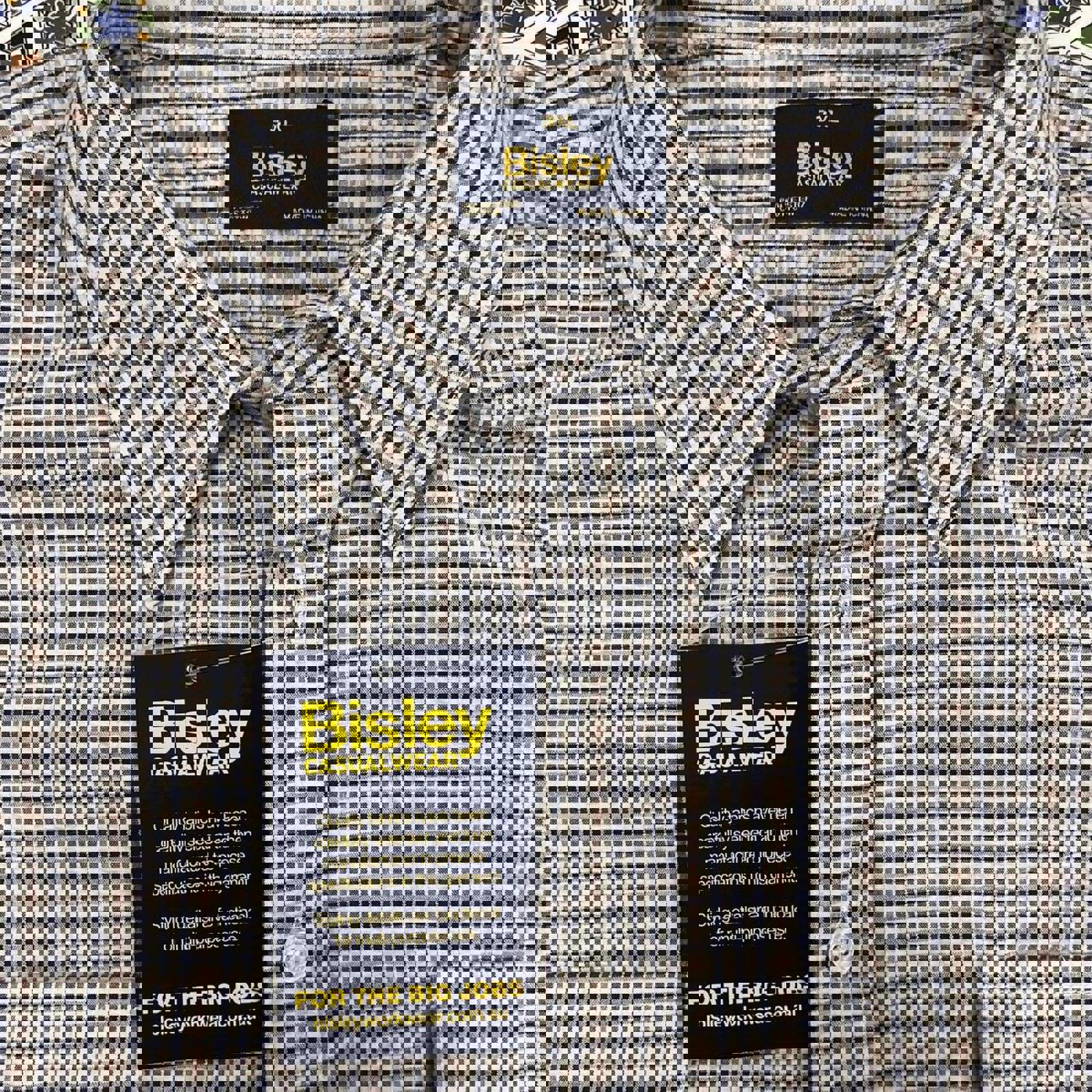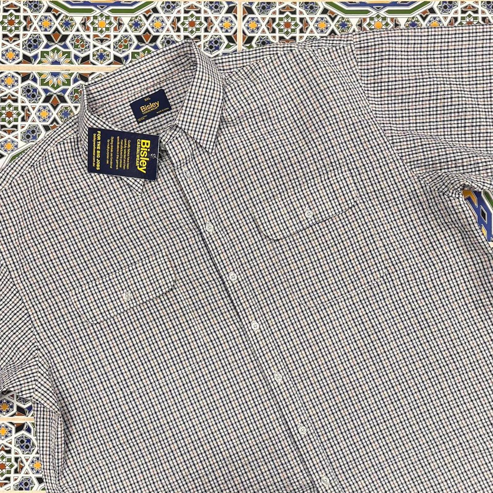 brand new with tags tan, white and navy checkered bisley short sleeved button up shirt with double pockets