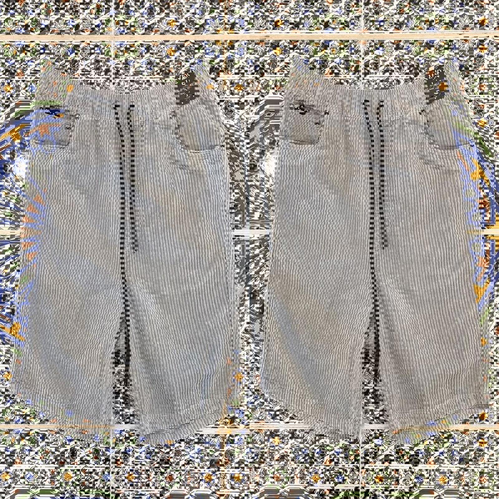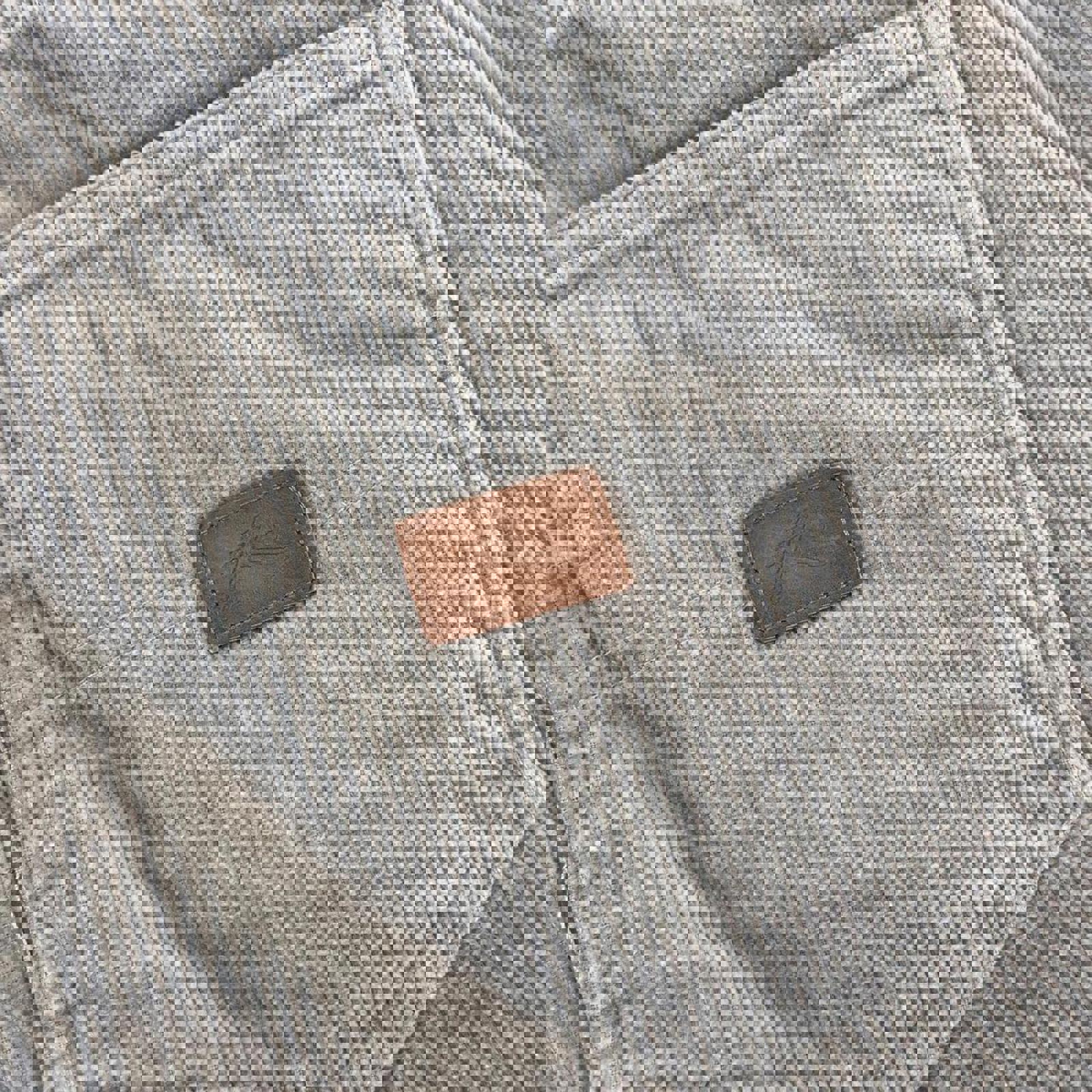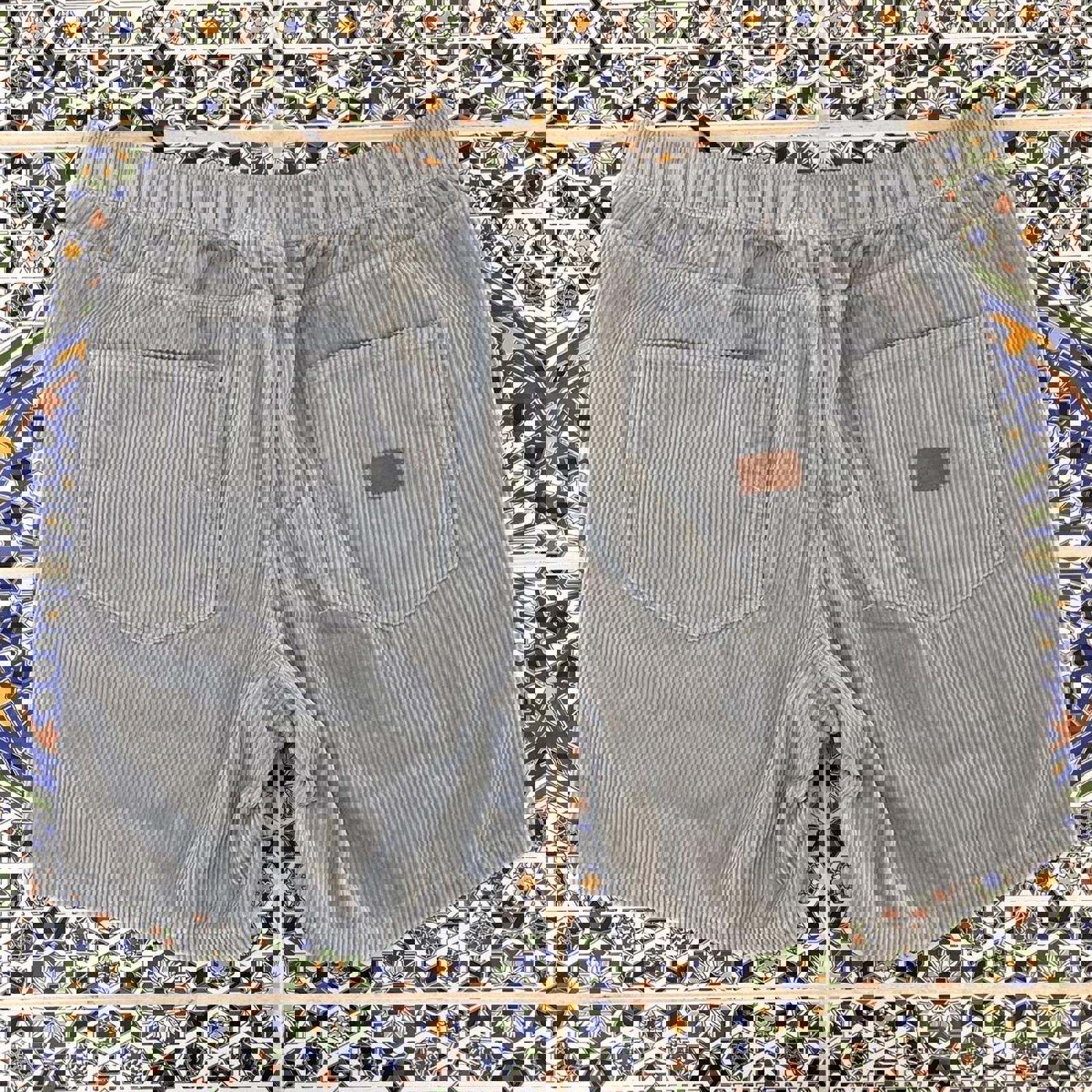 grey corduroy rusty shorts with a black patch on the coin pocket and a embossed brown patch on the bum pocket