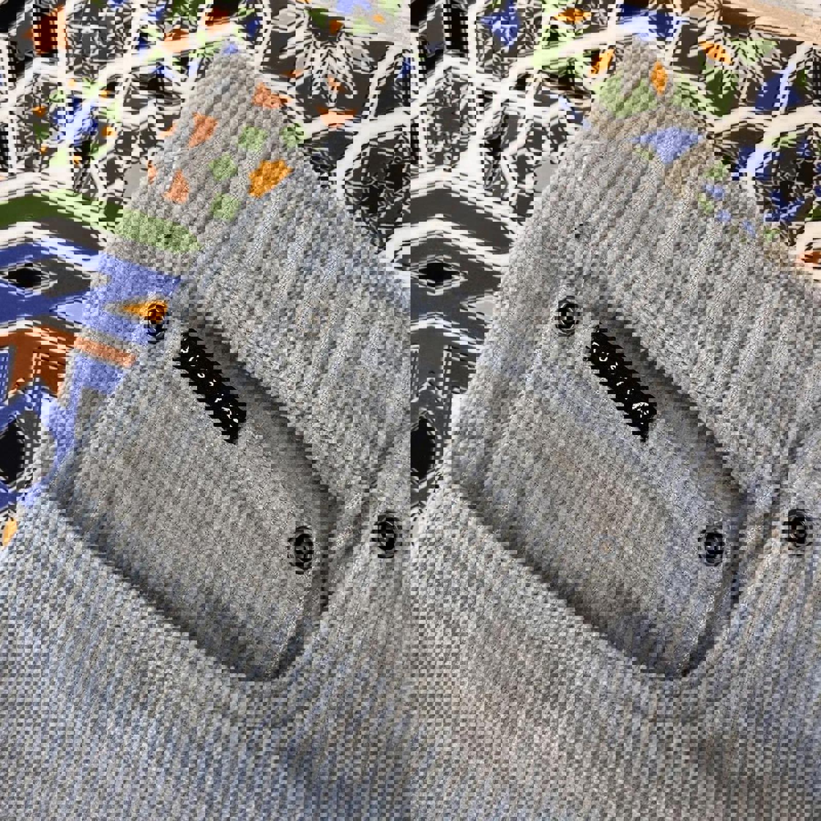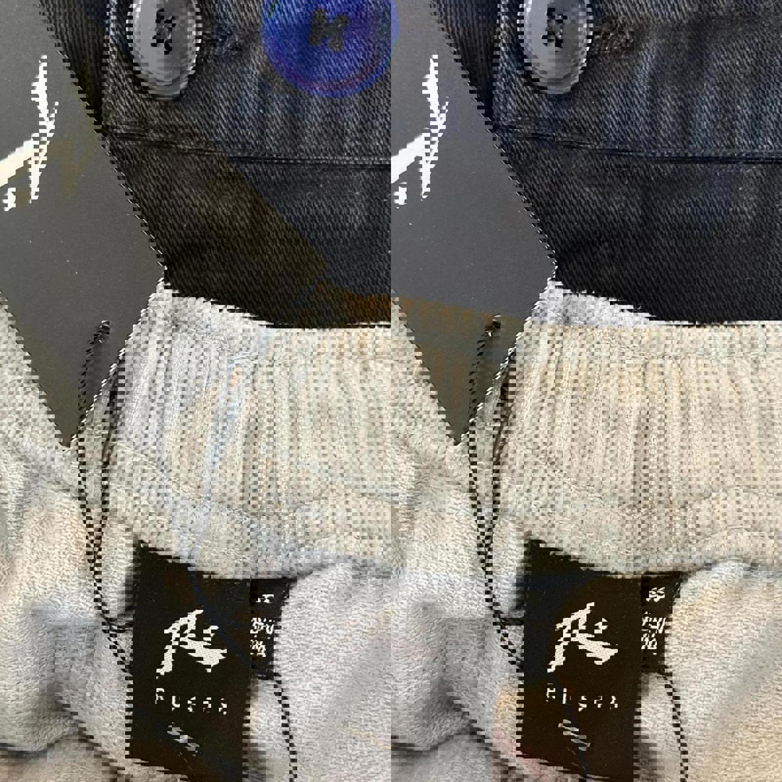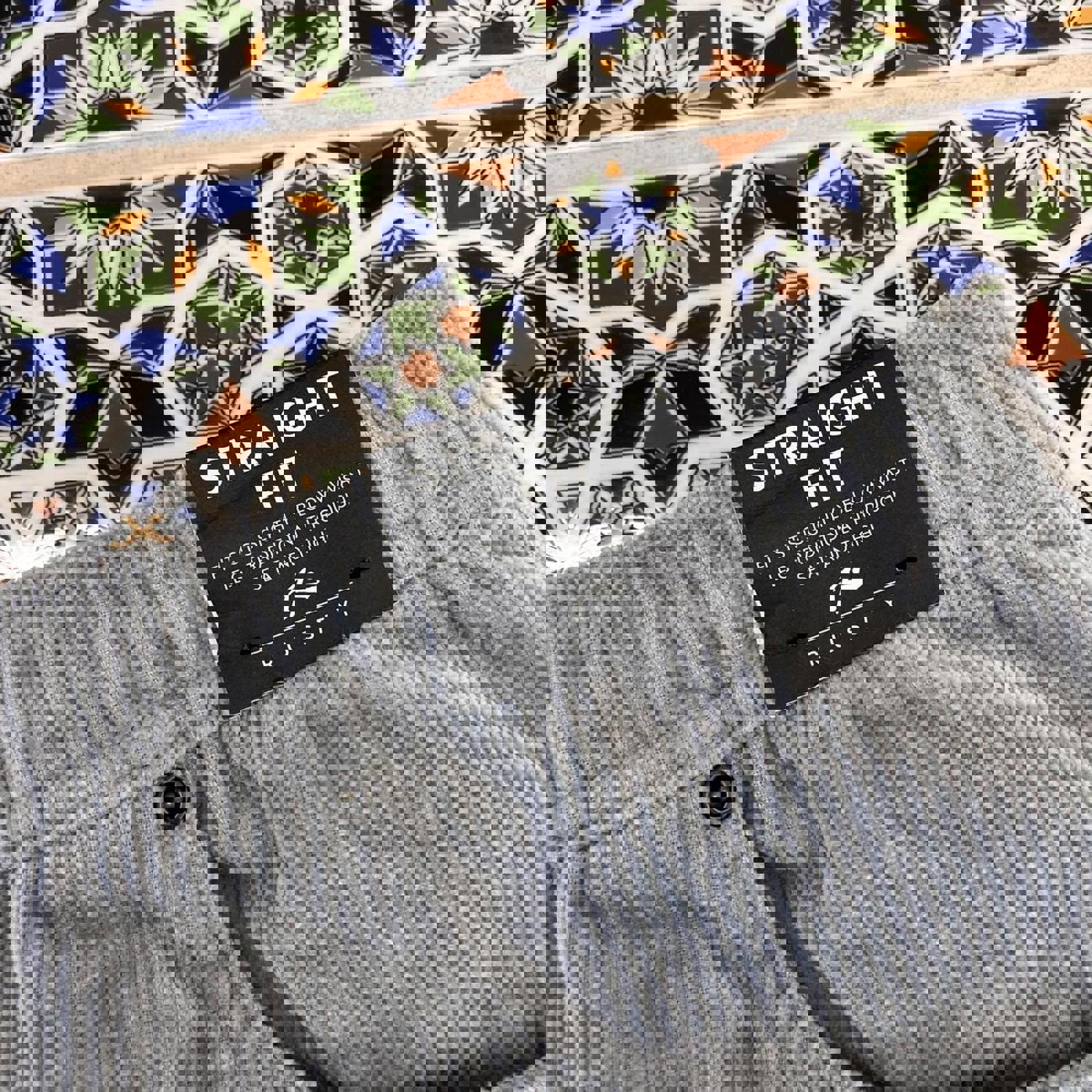 grey corduroy rusty shorts with a black patch on the coin pocket and a embossed brown patch on the bum pocket