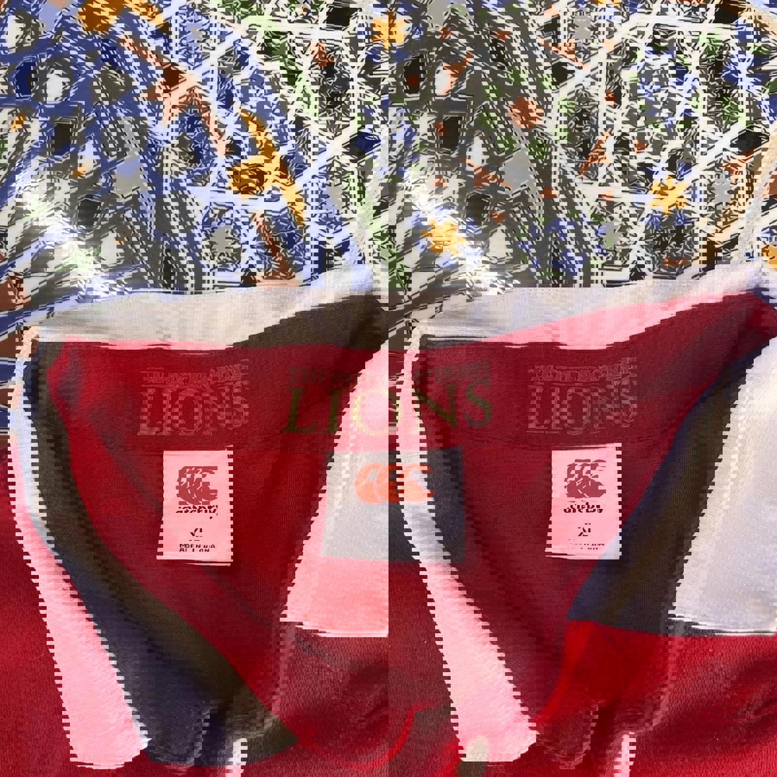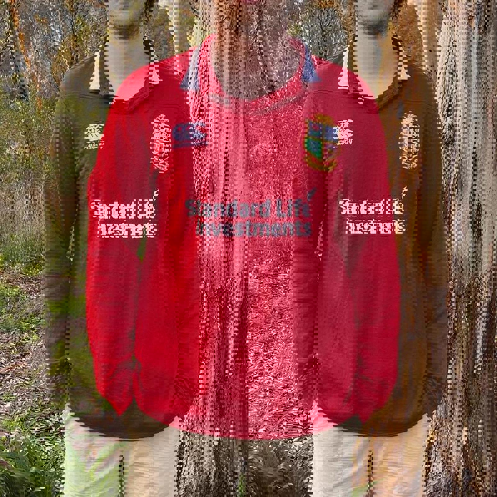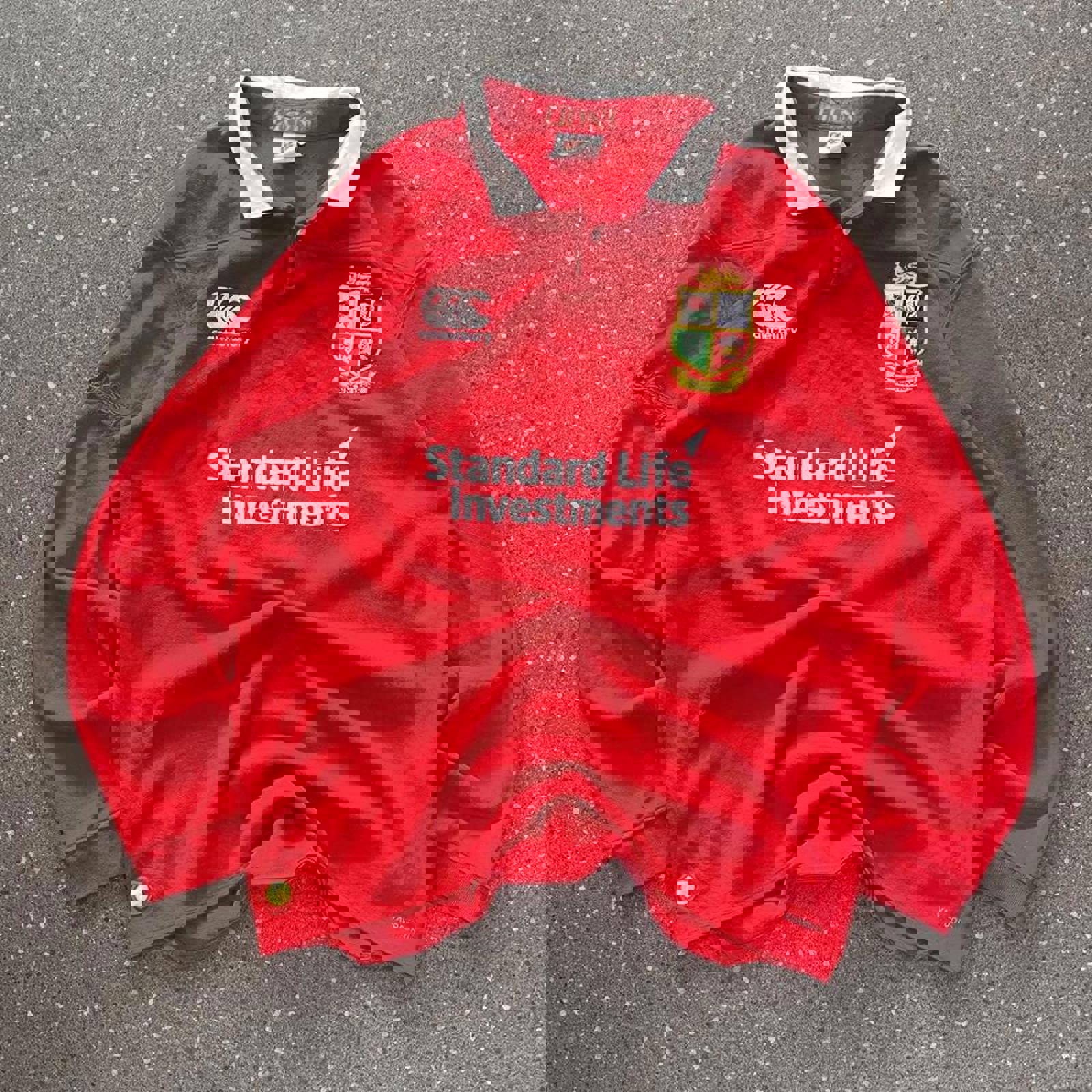 Red and white British and Irish Canterbury rugby jumper with embroidered club and Canterbury logos, embroidered lion on the sleeve and collar, a screen printed investments sponsor and a rubber officially licensed tab on the hip