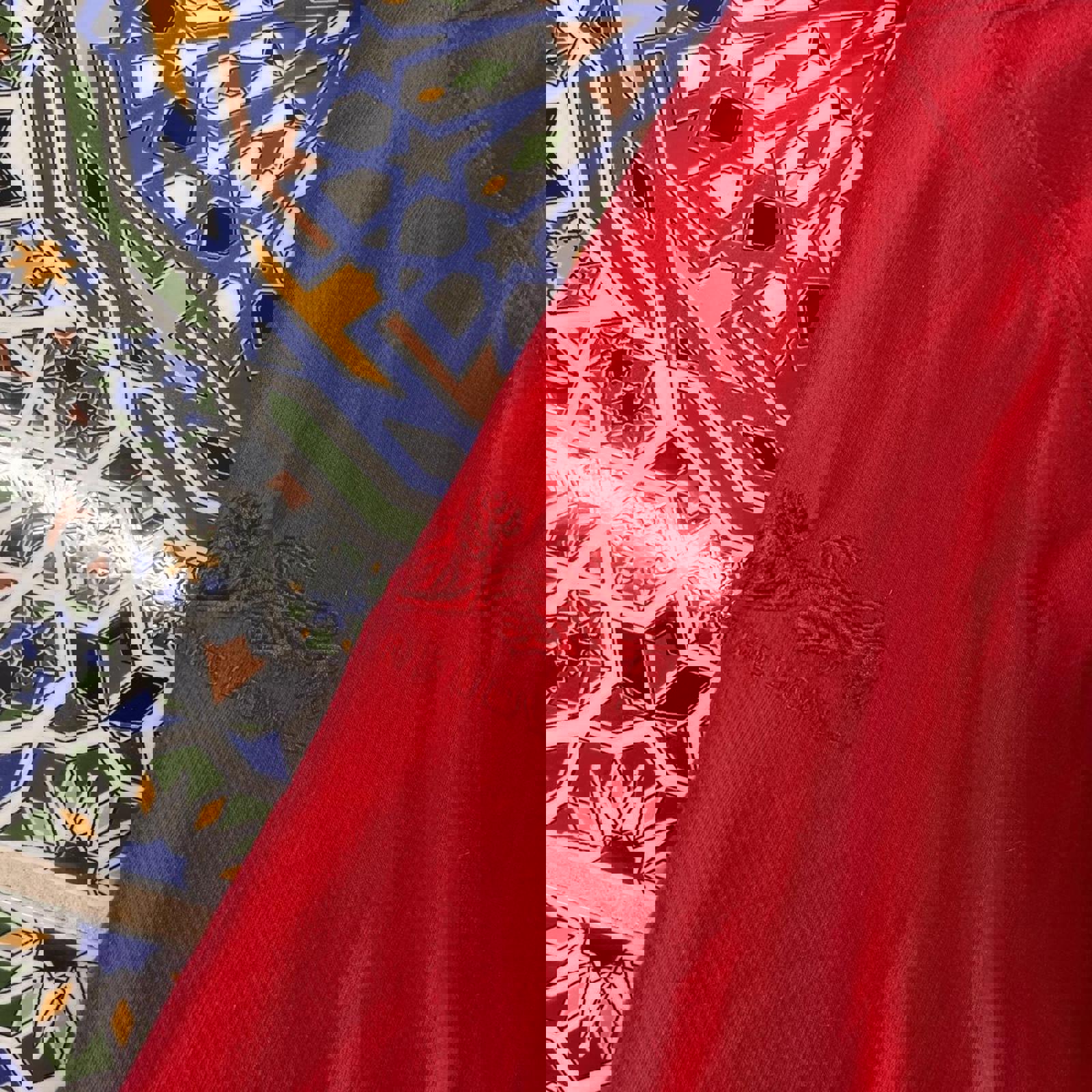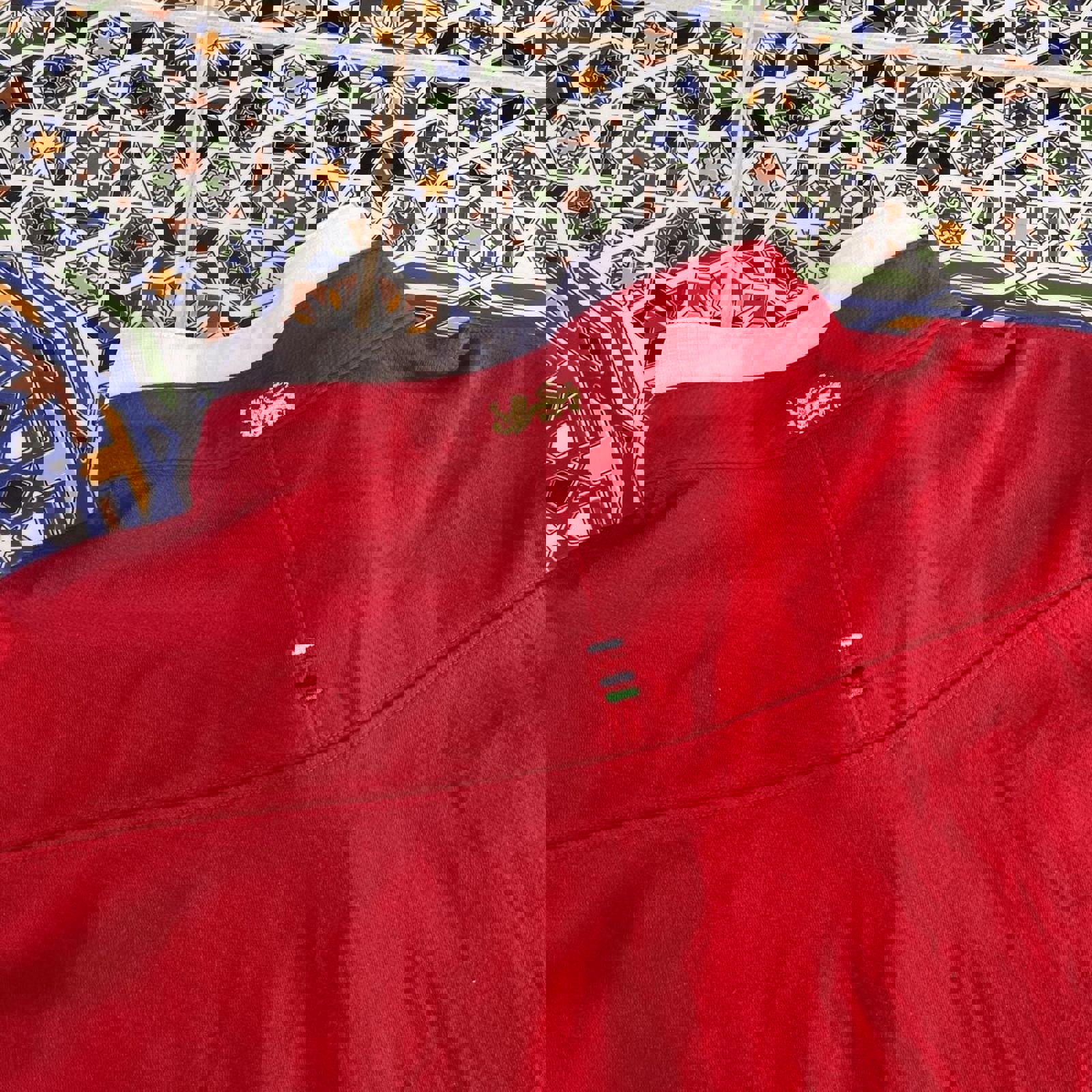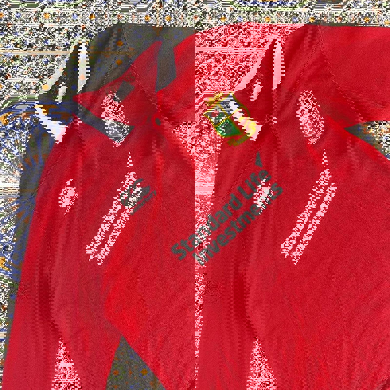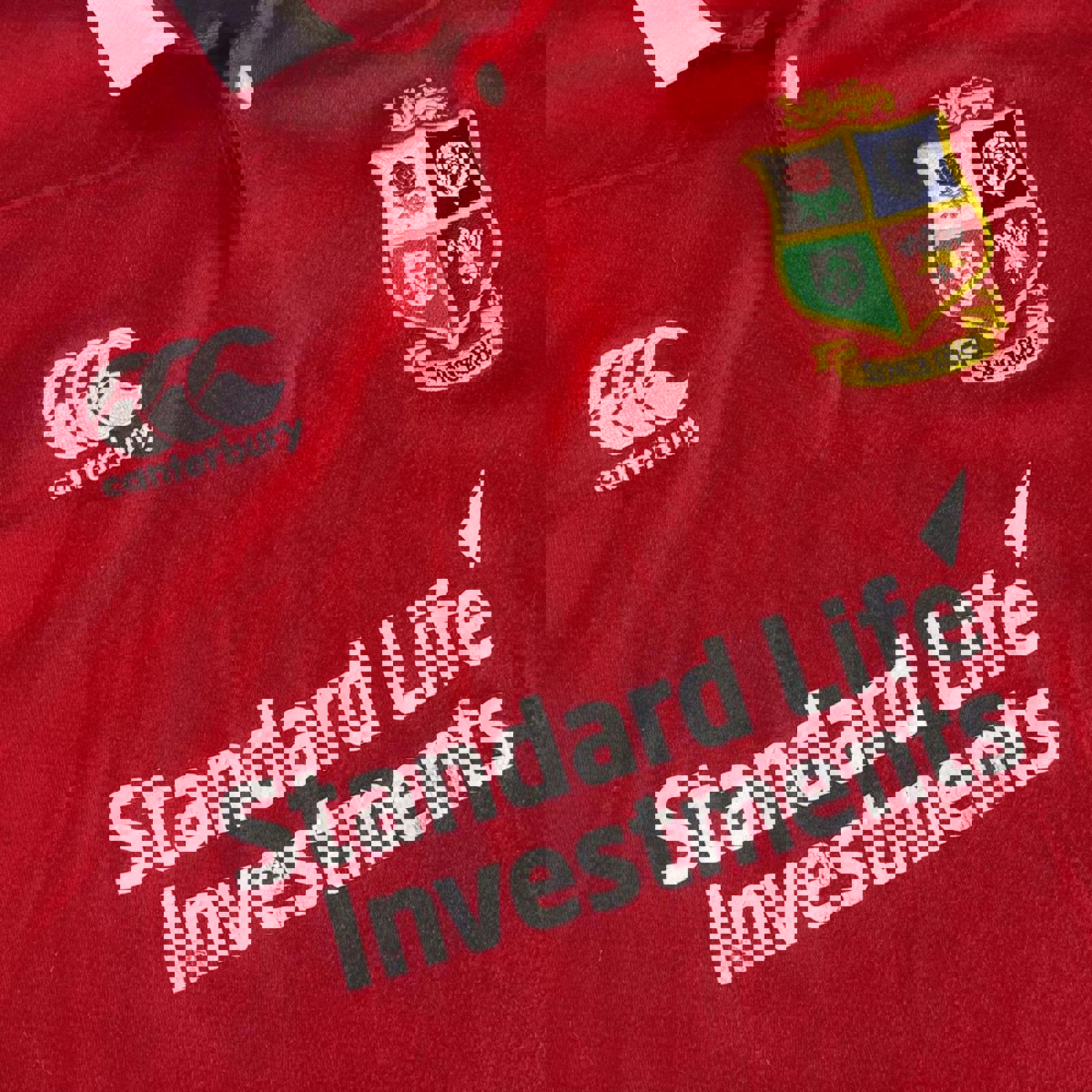 Red and white British and Irish Canterbury rugby jumper with embroidered club and Canterbury logos, embroidered lion on the sleeve and collar, a screen printed investments sponsor and a rubber officially licensed tab on the hip