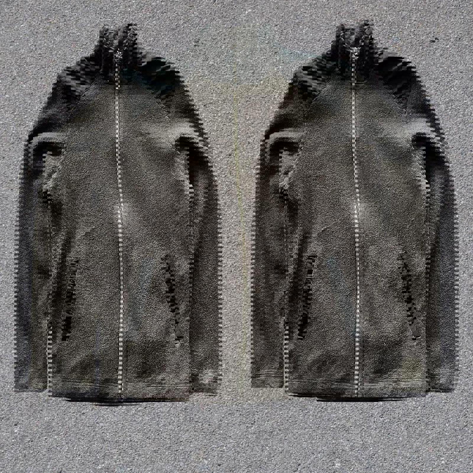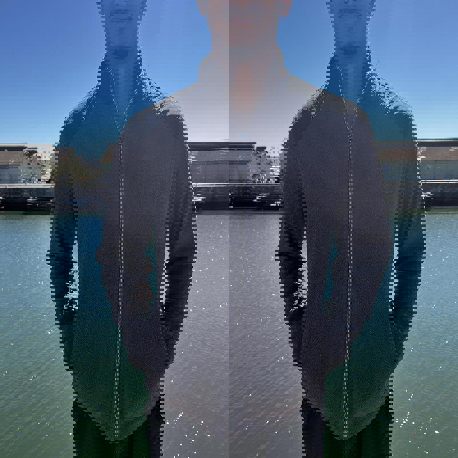 grey Calvin Klein tech fleece sweater jacket with nylon on the elbows, shoulders and exterior of the collar and a small embroidered logo on the chest
