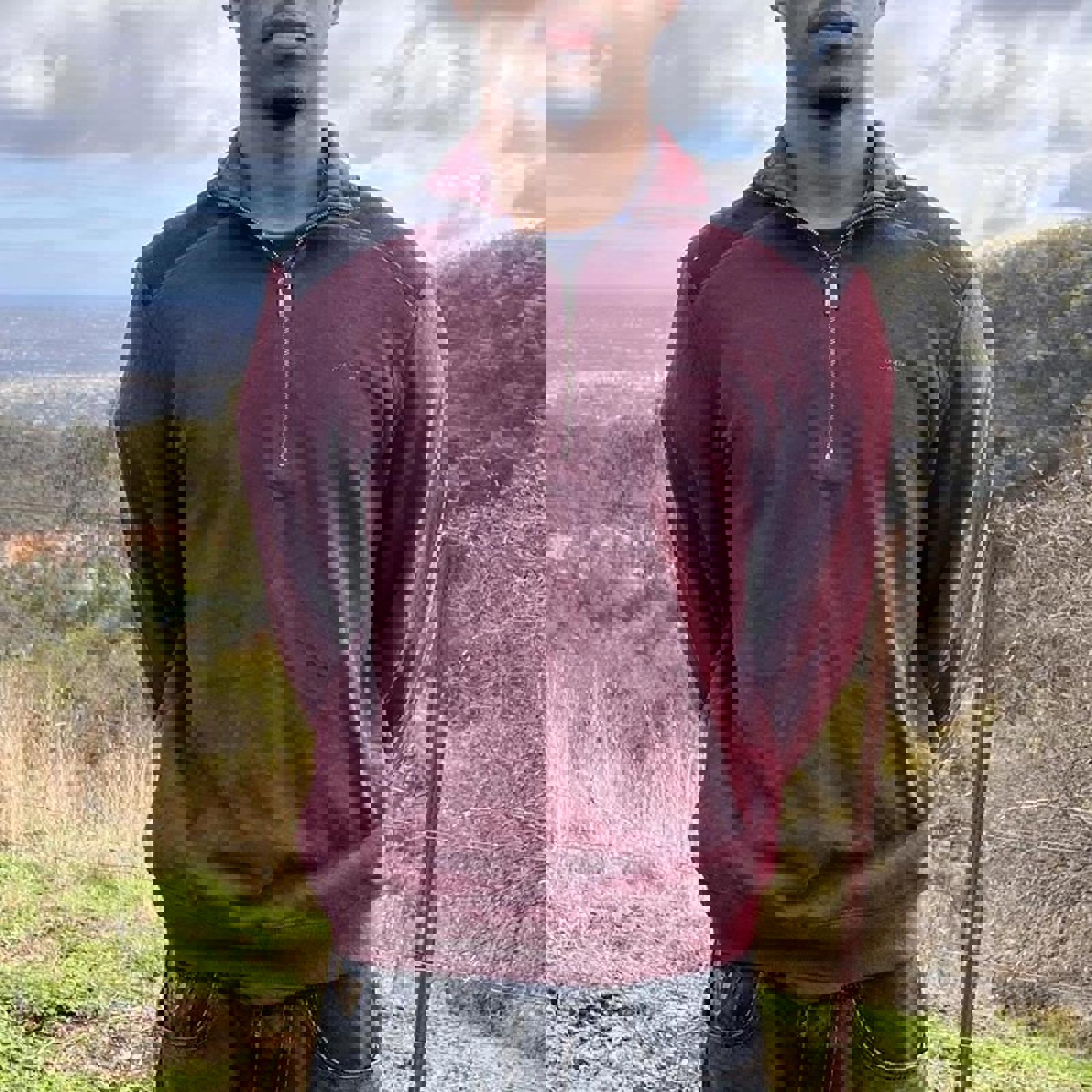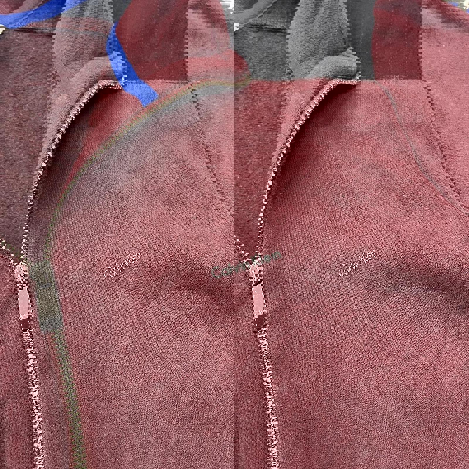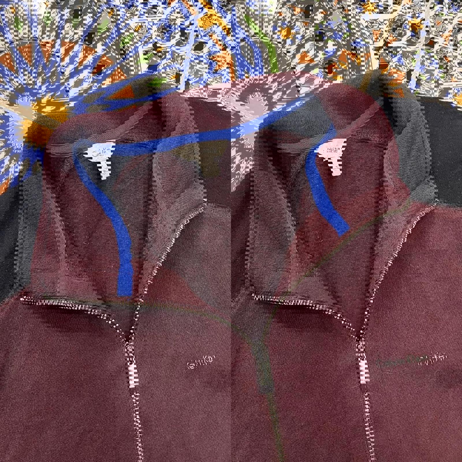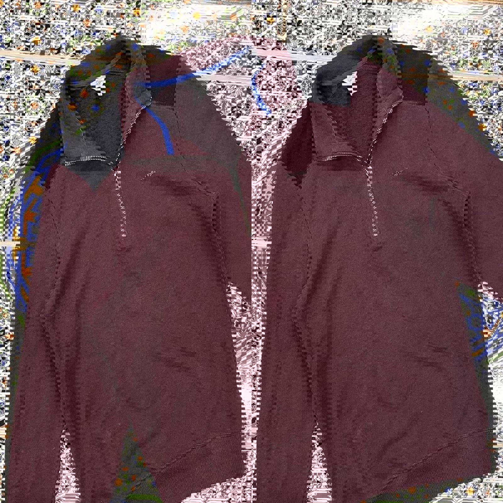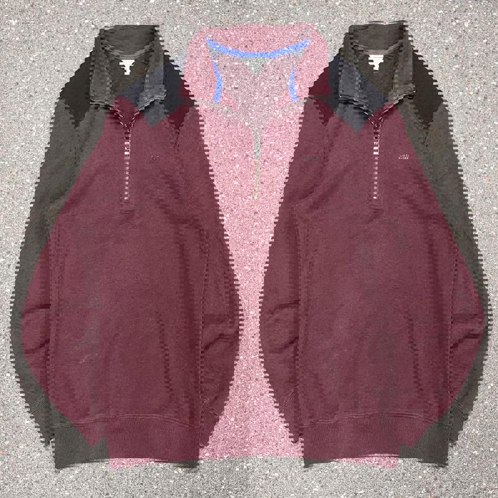 maroon, black and blue calvin klein 1/4 zip jumper with a printed small spell out on the chest
