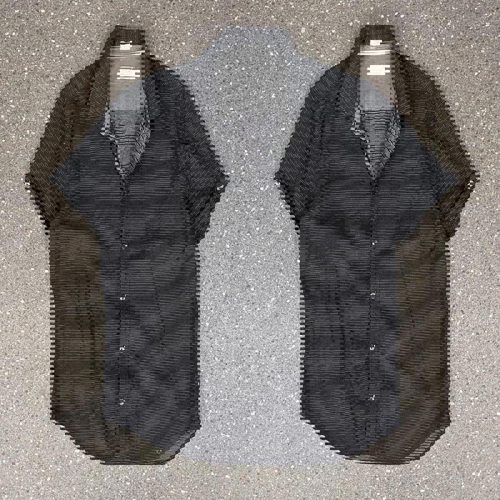 black and grey striped calvin klein short sleeved button up shirt with folded cuffs held with buttons and a tab on the side