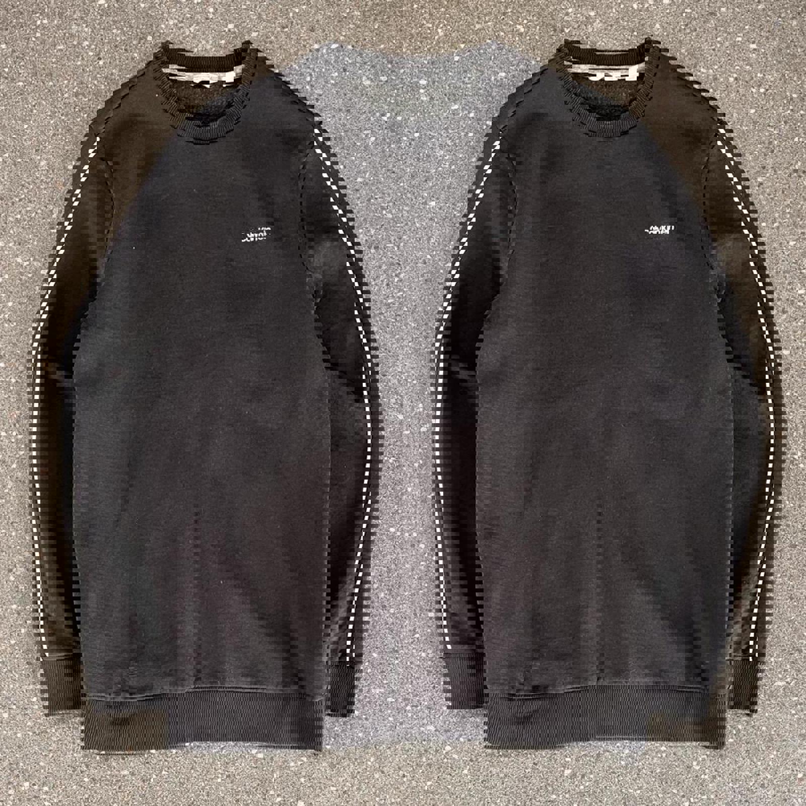 black Calvin Klein jumper with an embroidered small spell out on the chest in grey and grey piping down the sleeve