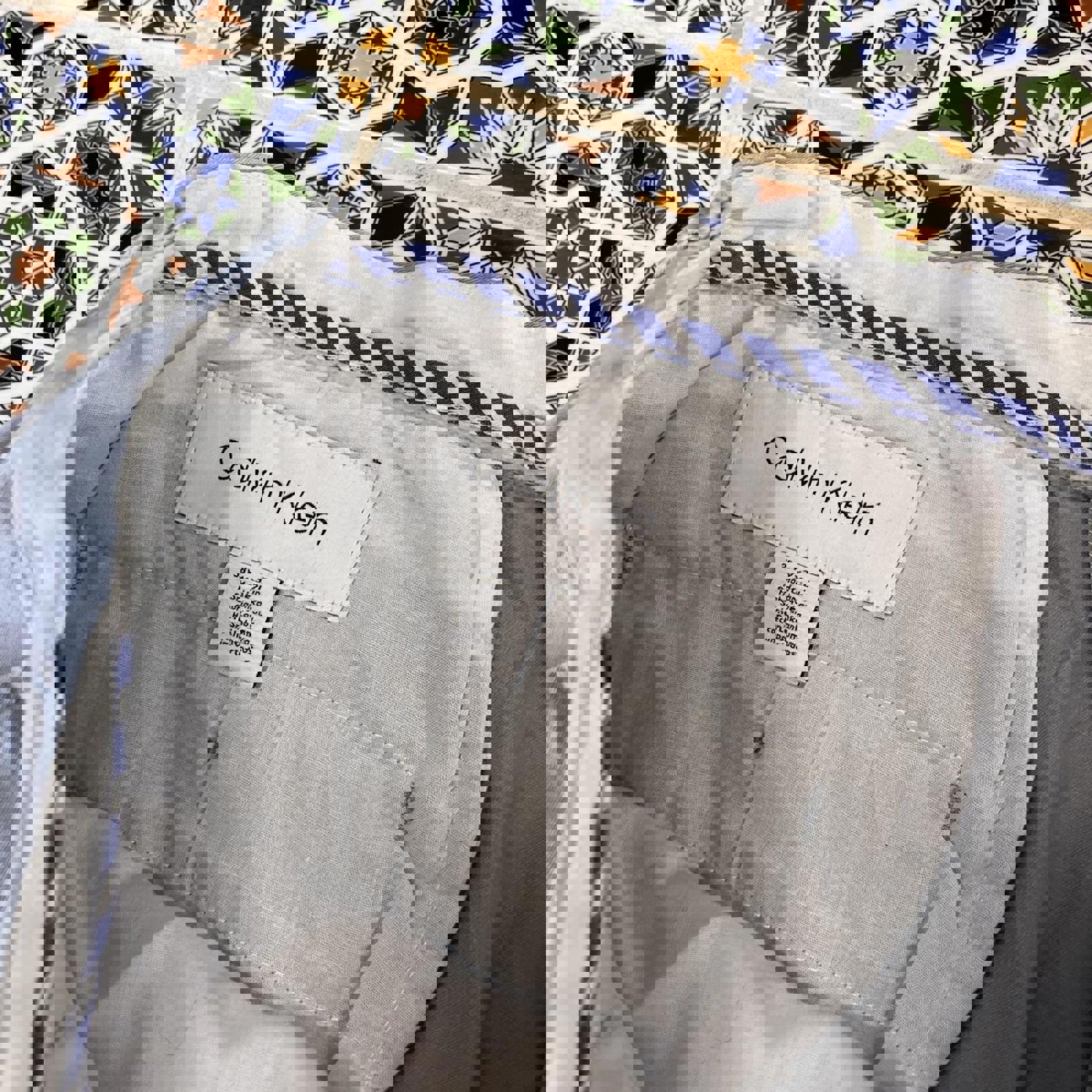 Grey chino Calvin Klein pants with an embroidered CK on the bum