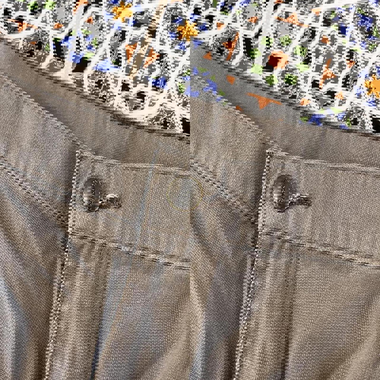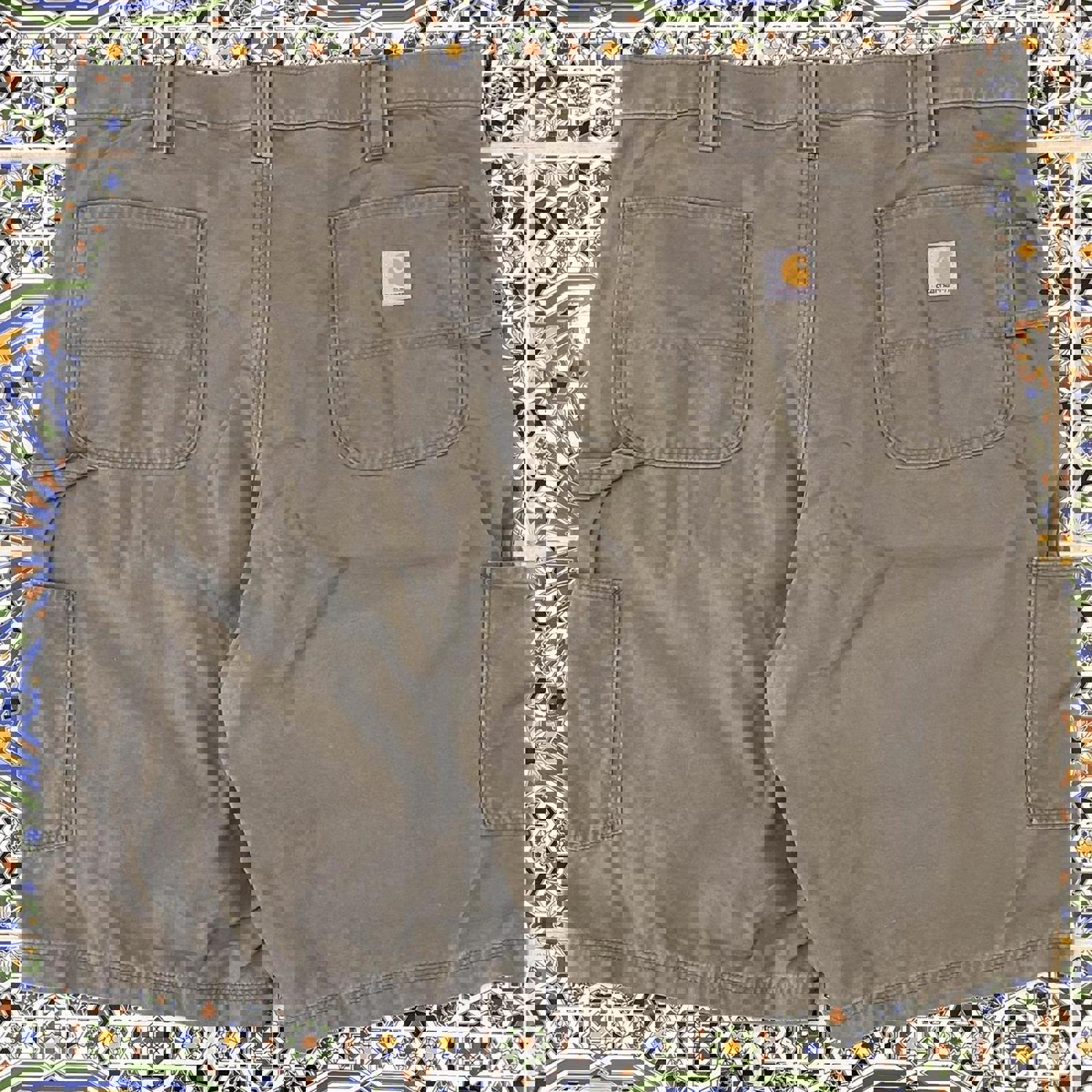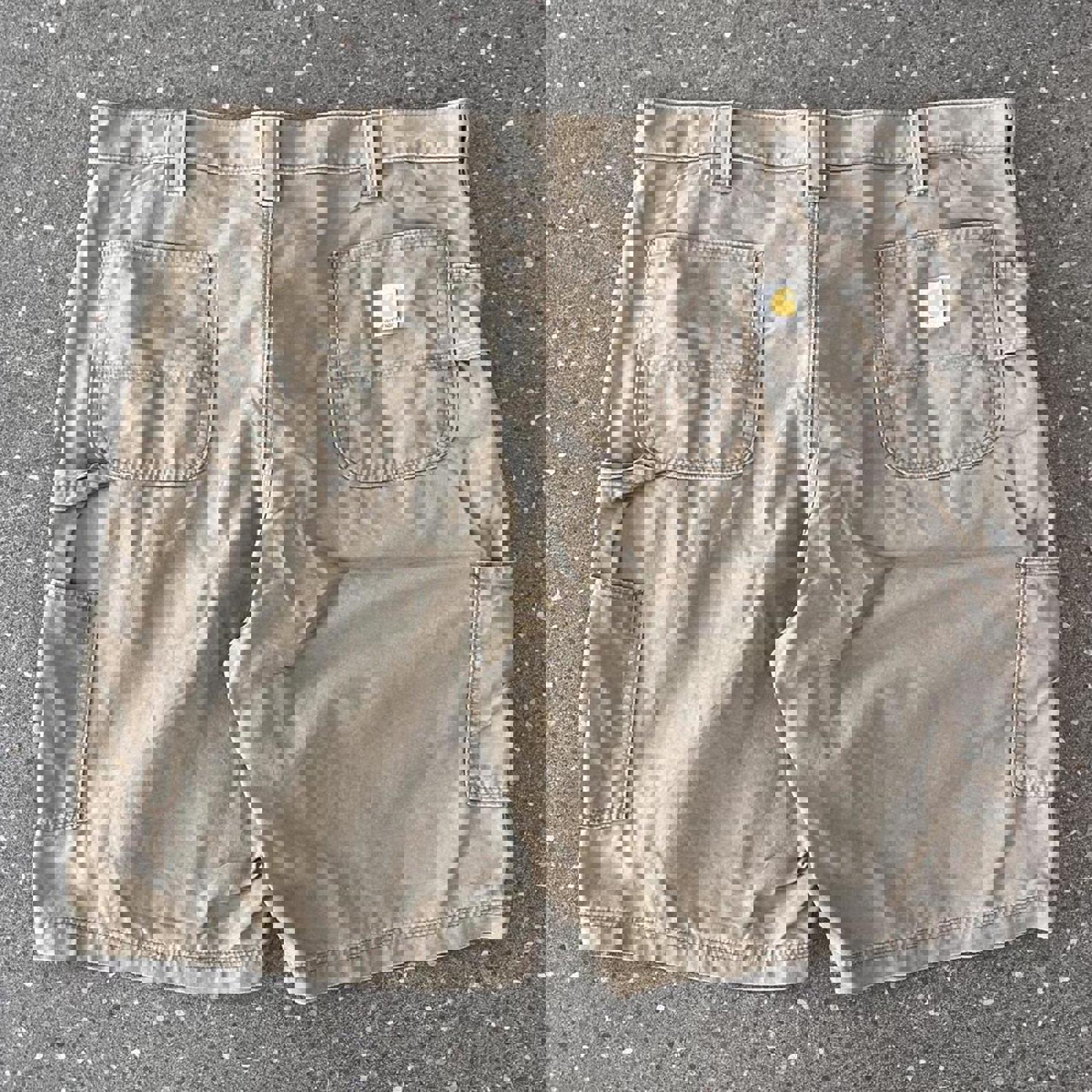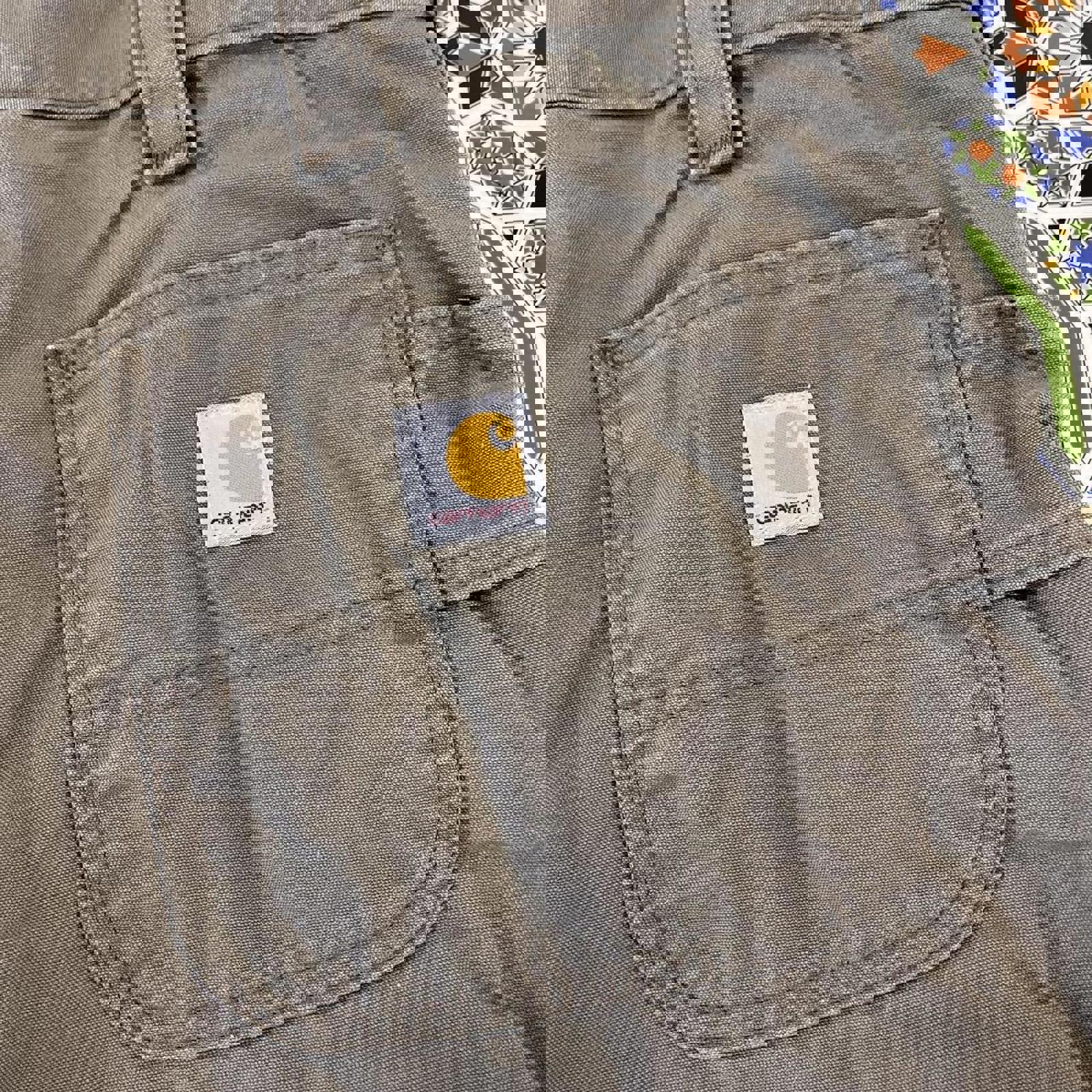 brown olive tan carhartt shorts with a patch on the back pocket and detailed pockets