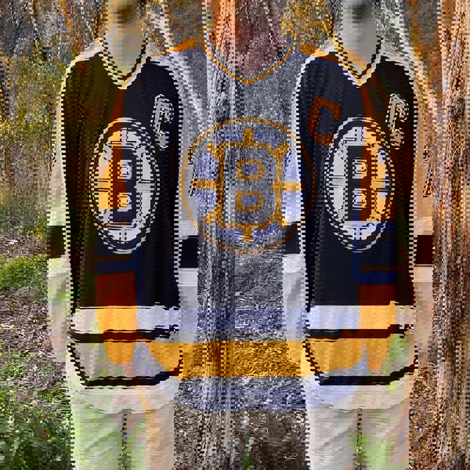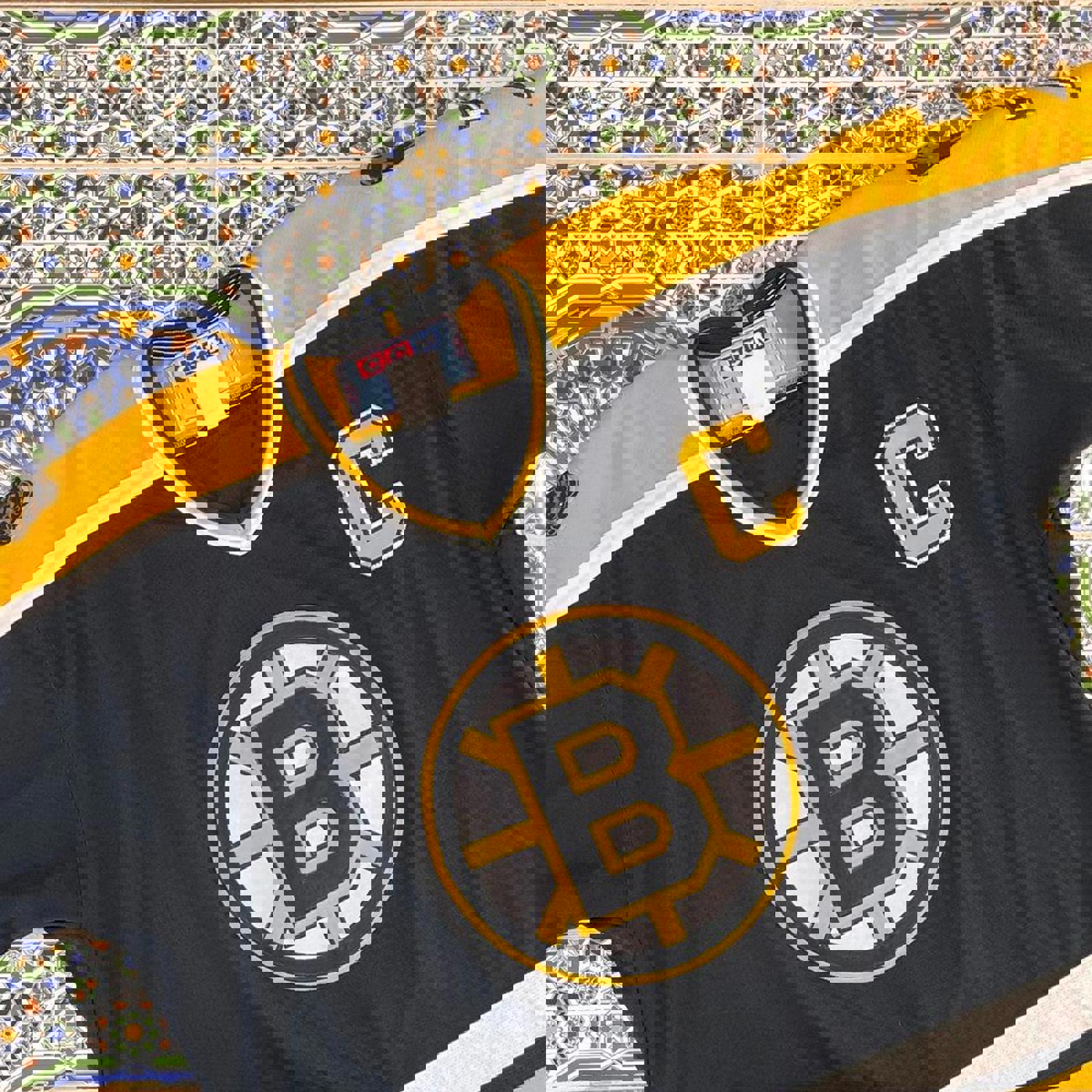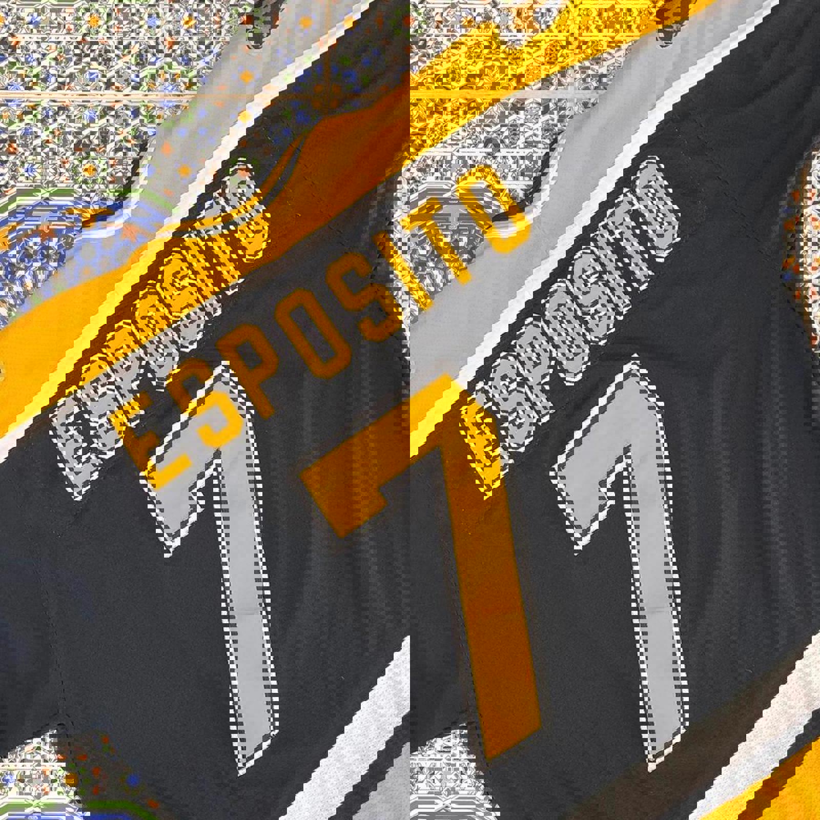 vintage black, white and yellow phil esposito boston bruins hockey jersey with all embroidered patches like bears on the shoulders, a large bruins logo on the front and CCM logos on the bum. tagged size XL