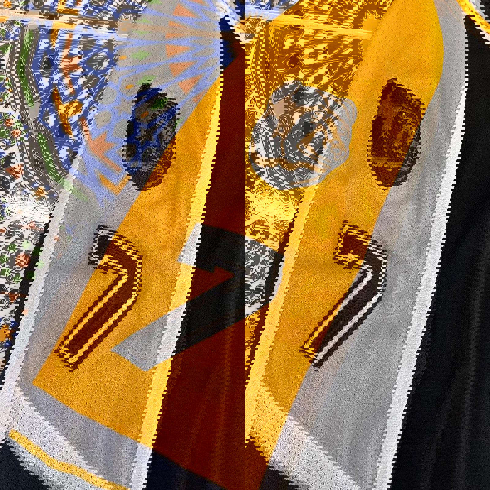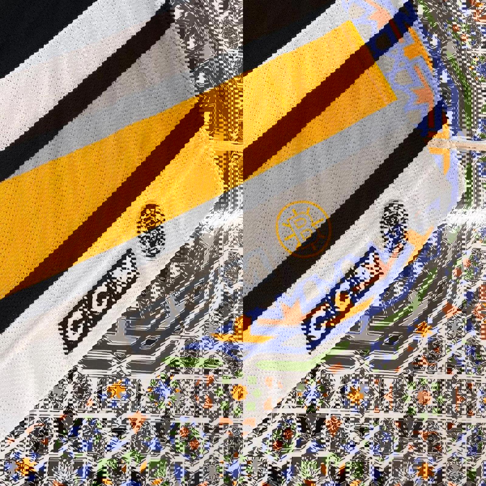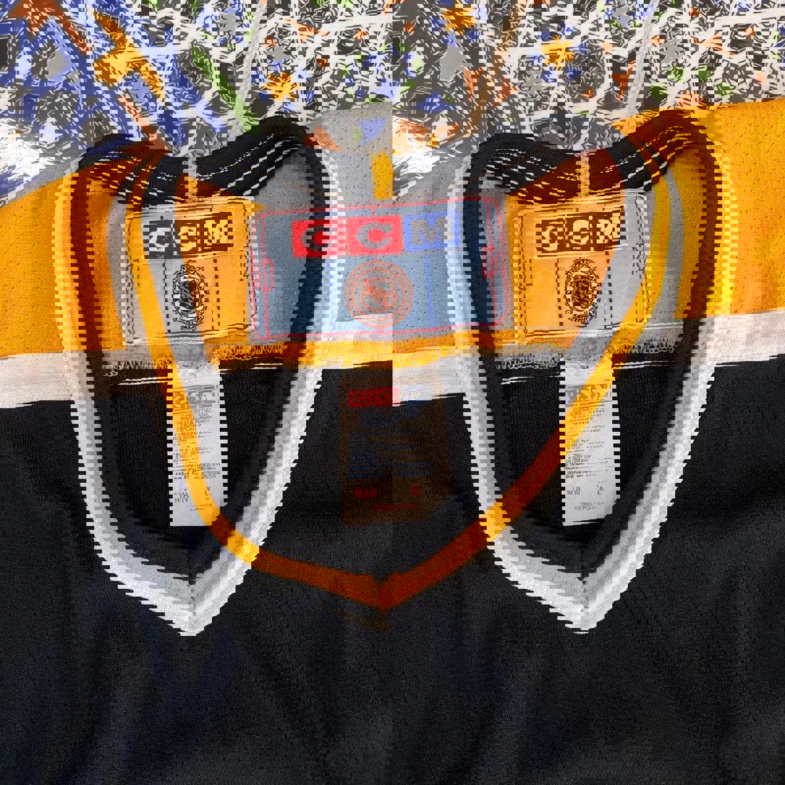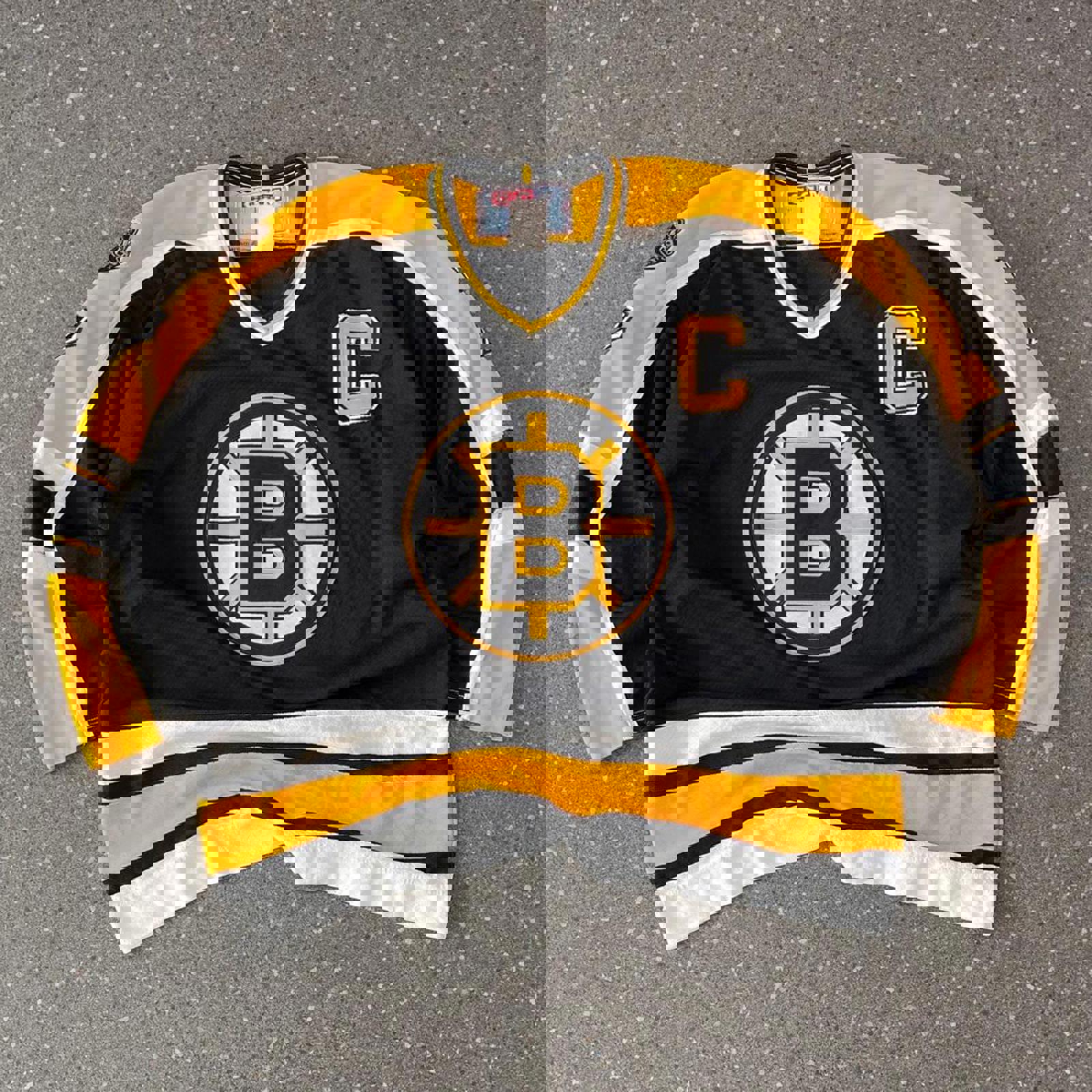 vintage black, white and yellow phil esposito boston bruins hockey jersey with all embroidered patches like bears on the shoulders, a large bruins logo on the front and CCM logos on the bum. tagged size XL