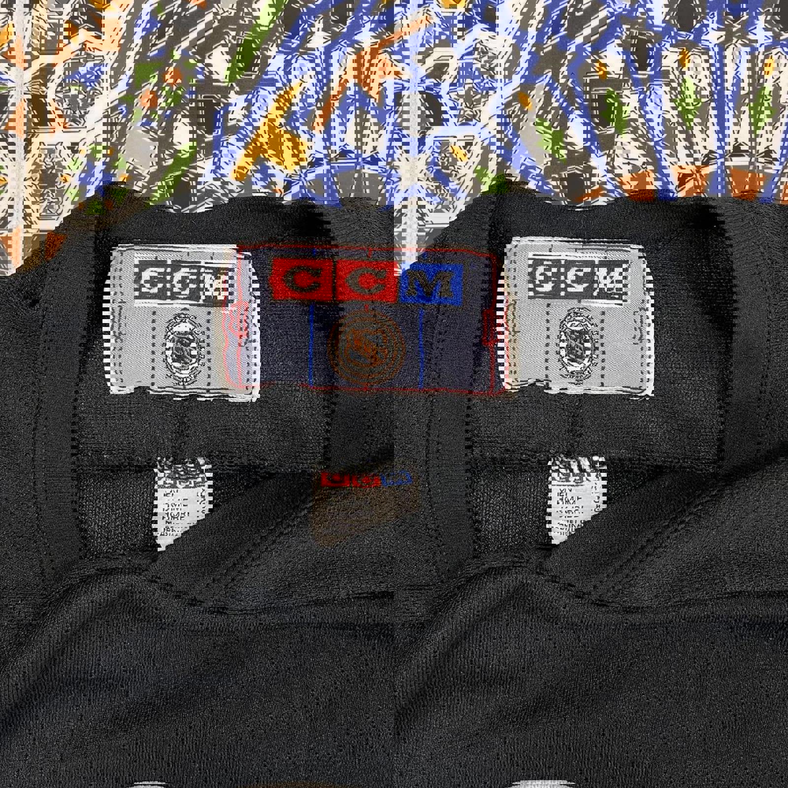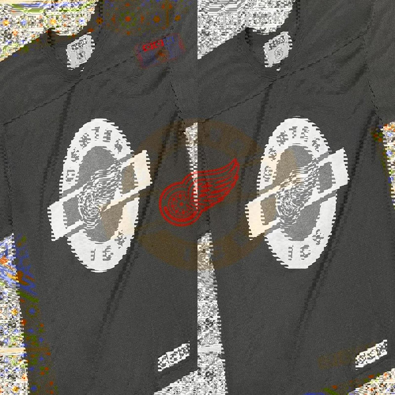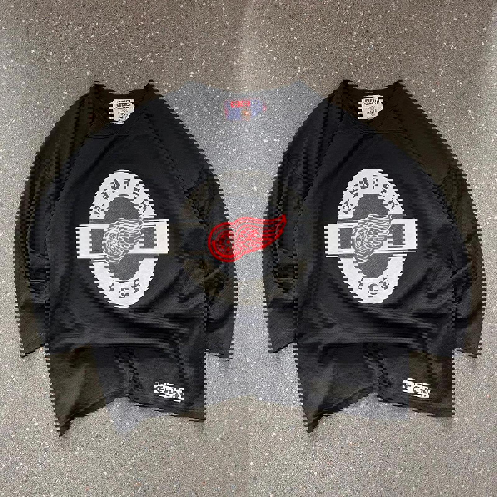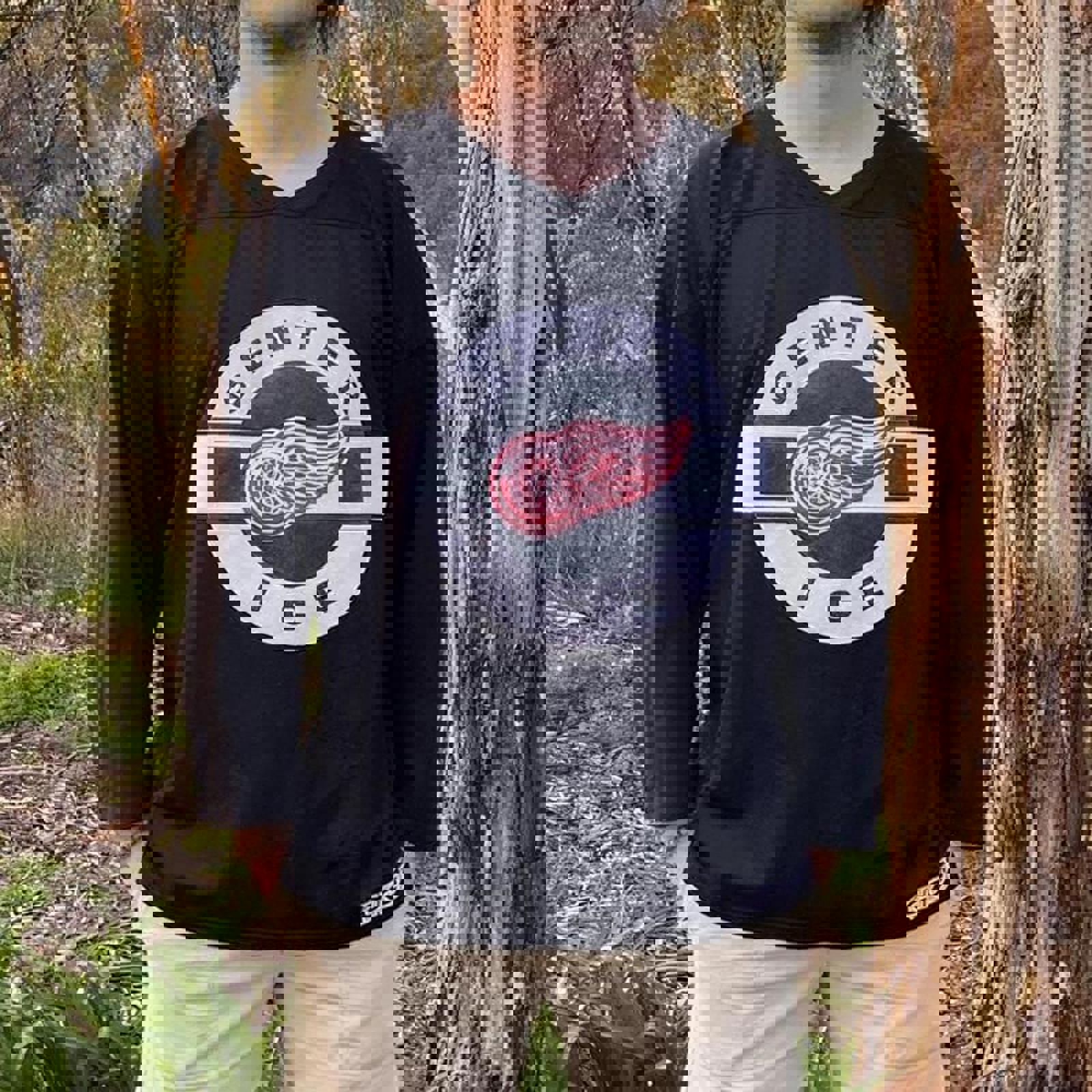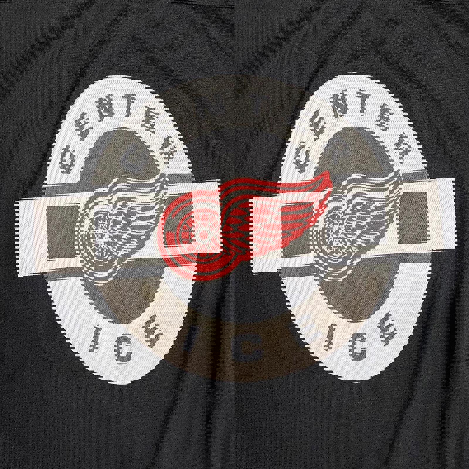 vintage black, white and red CCM detroit red wings hockey jersey with a large patch on the front