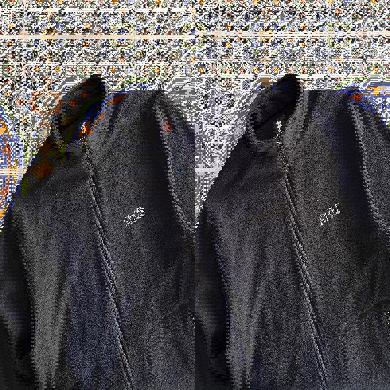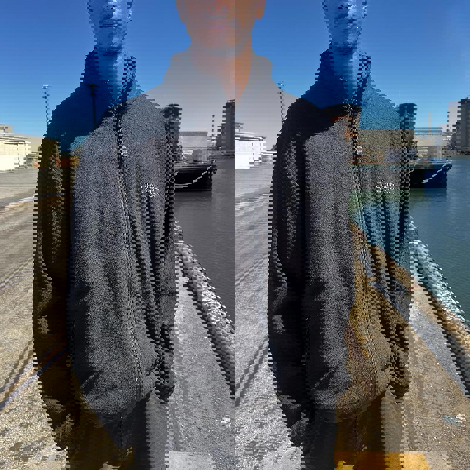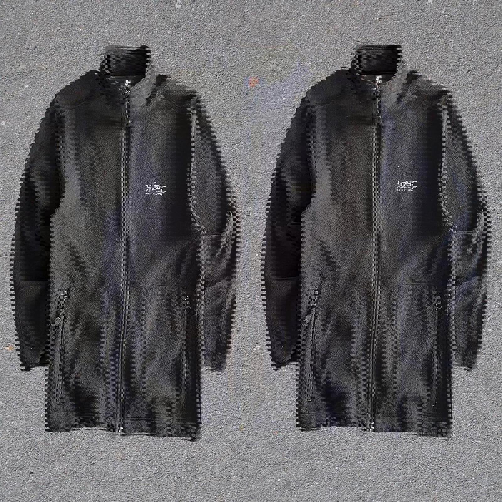 vintage black fleece Chaps sweater jacket with detailed zips with a logos, zip-able pockets on the side and a grey embroidered spell out logo on the chest