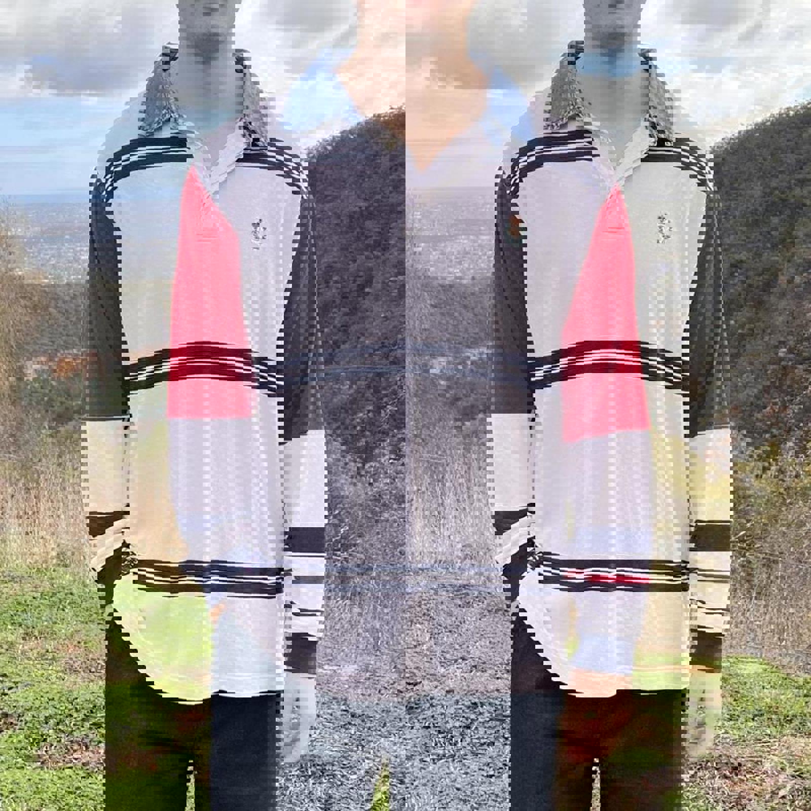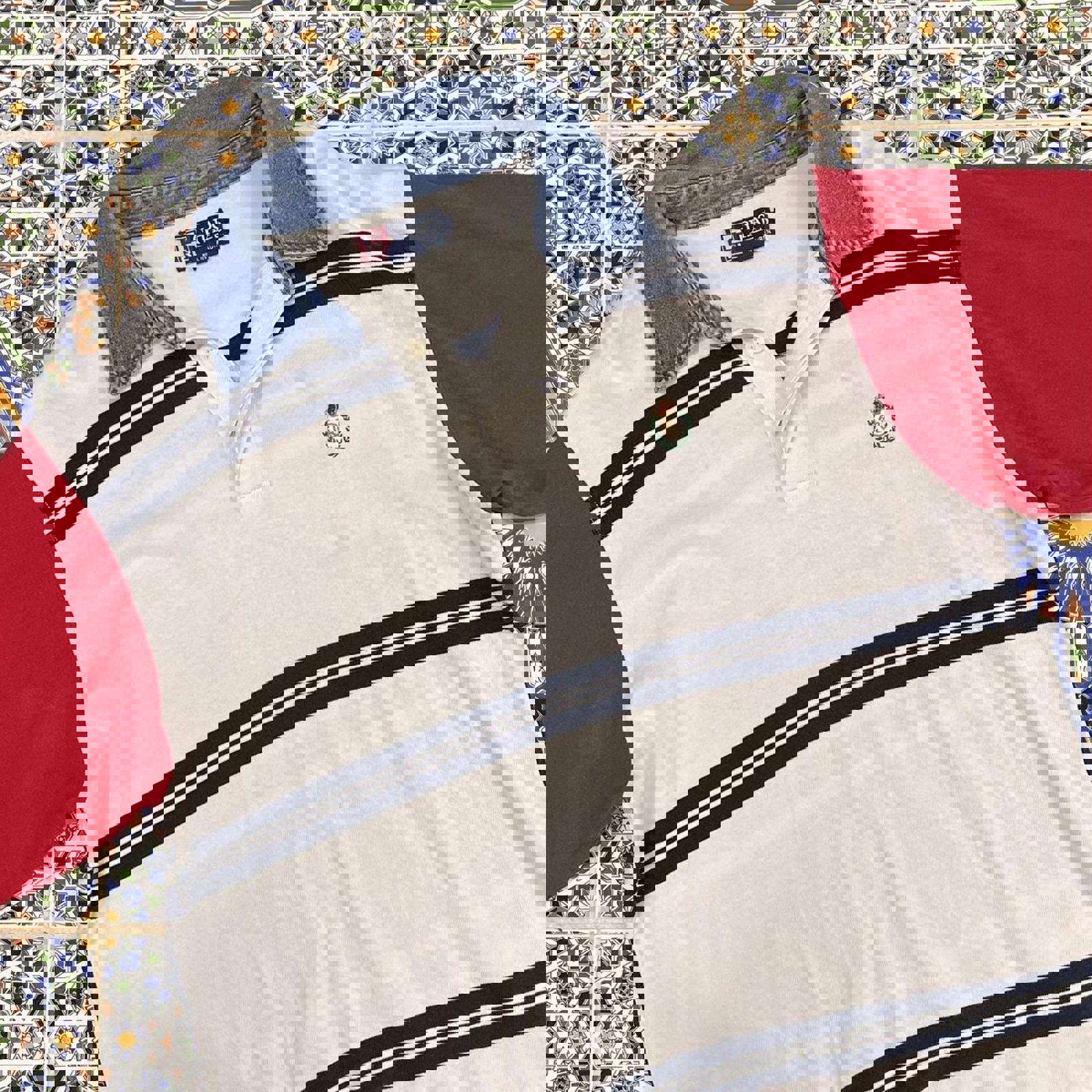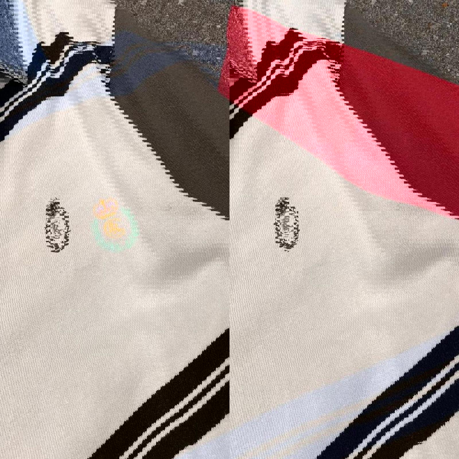 White, navy and red stripped chaps Ralph Lauren vintage long sleeved polo with a denim collar, patch on the hip and vintage embroidered chaps crest on the chest