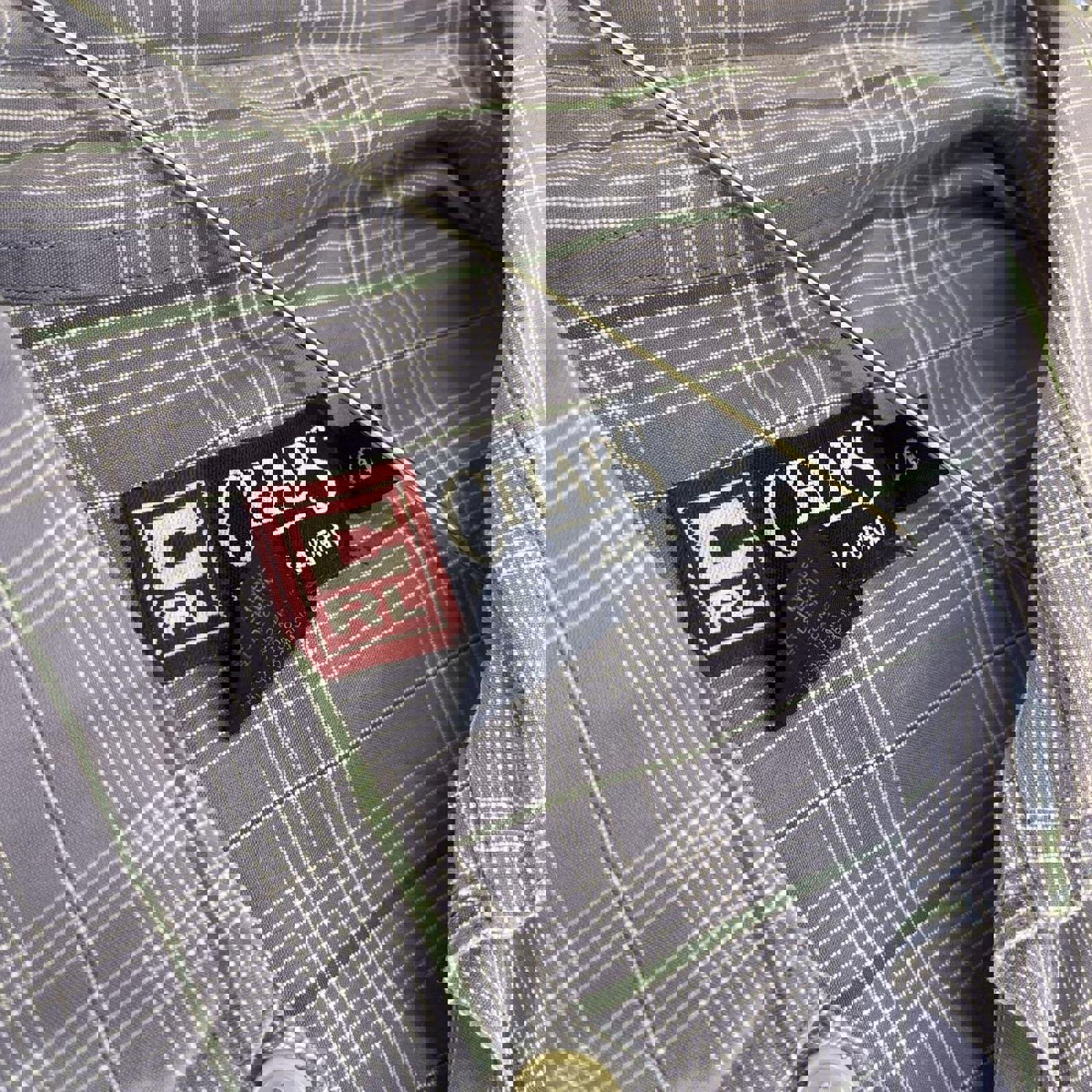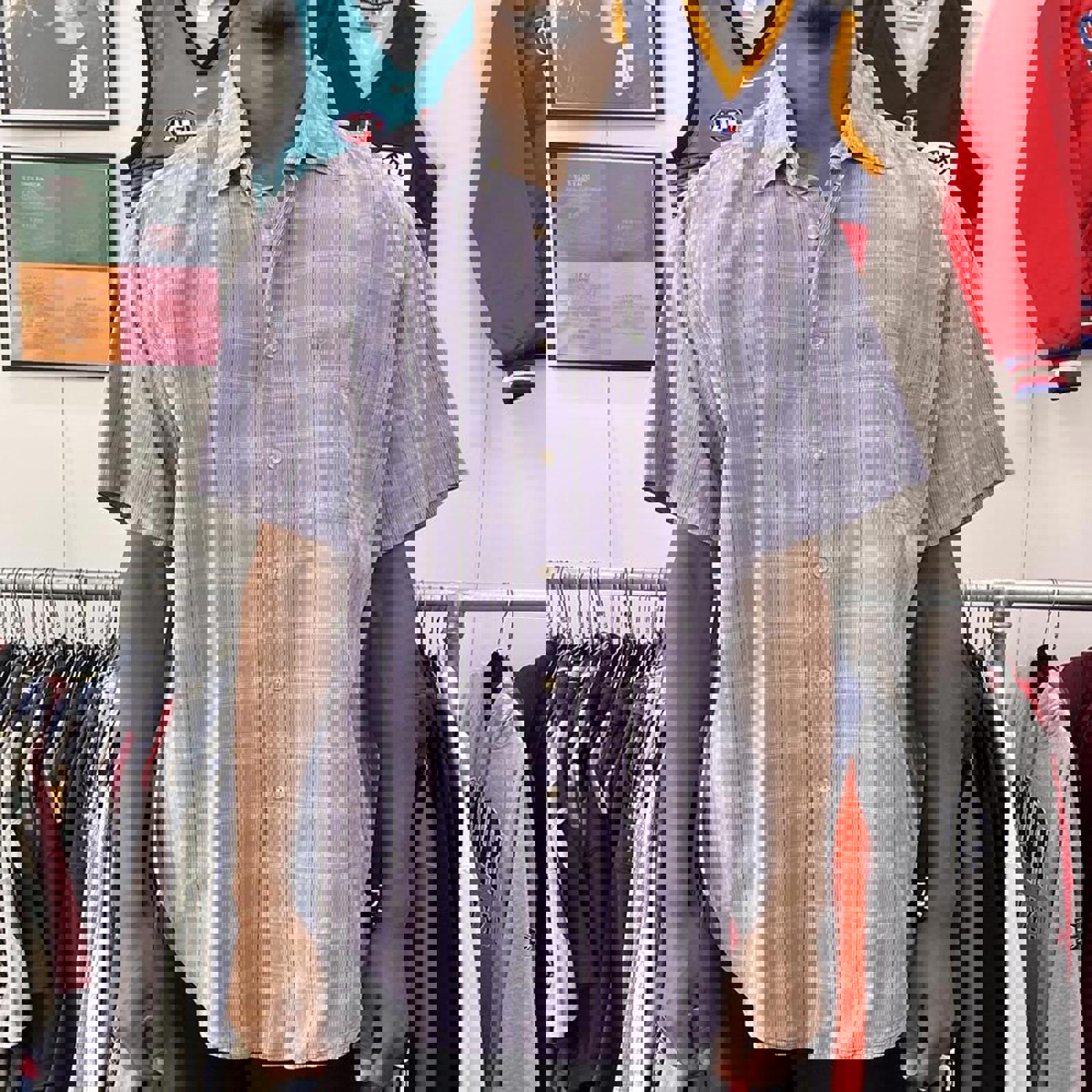 lavender, green and white checkered chaps Ralph Lauren short sleeved button up shirt with a patch on the chest pocket