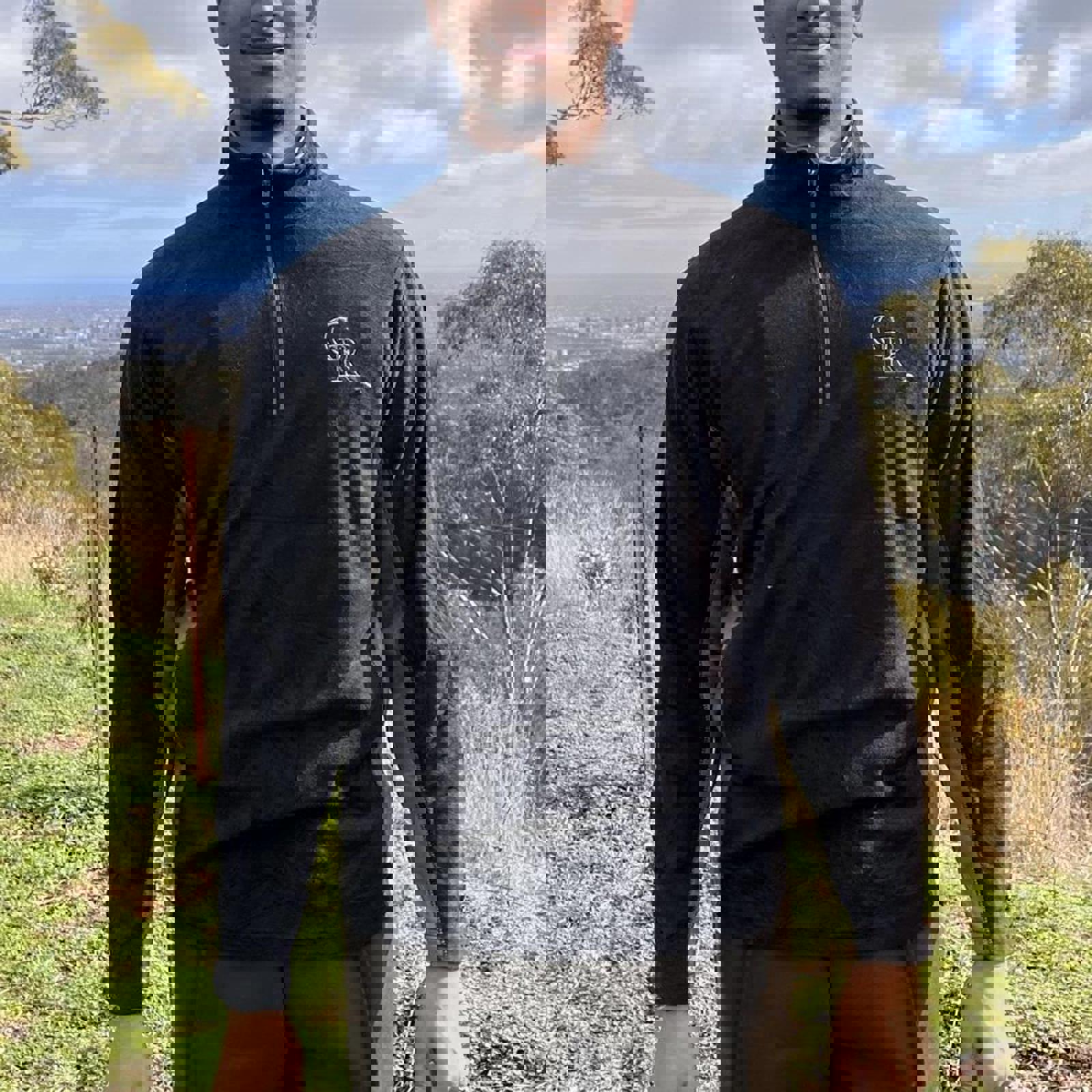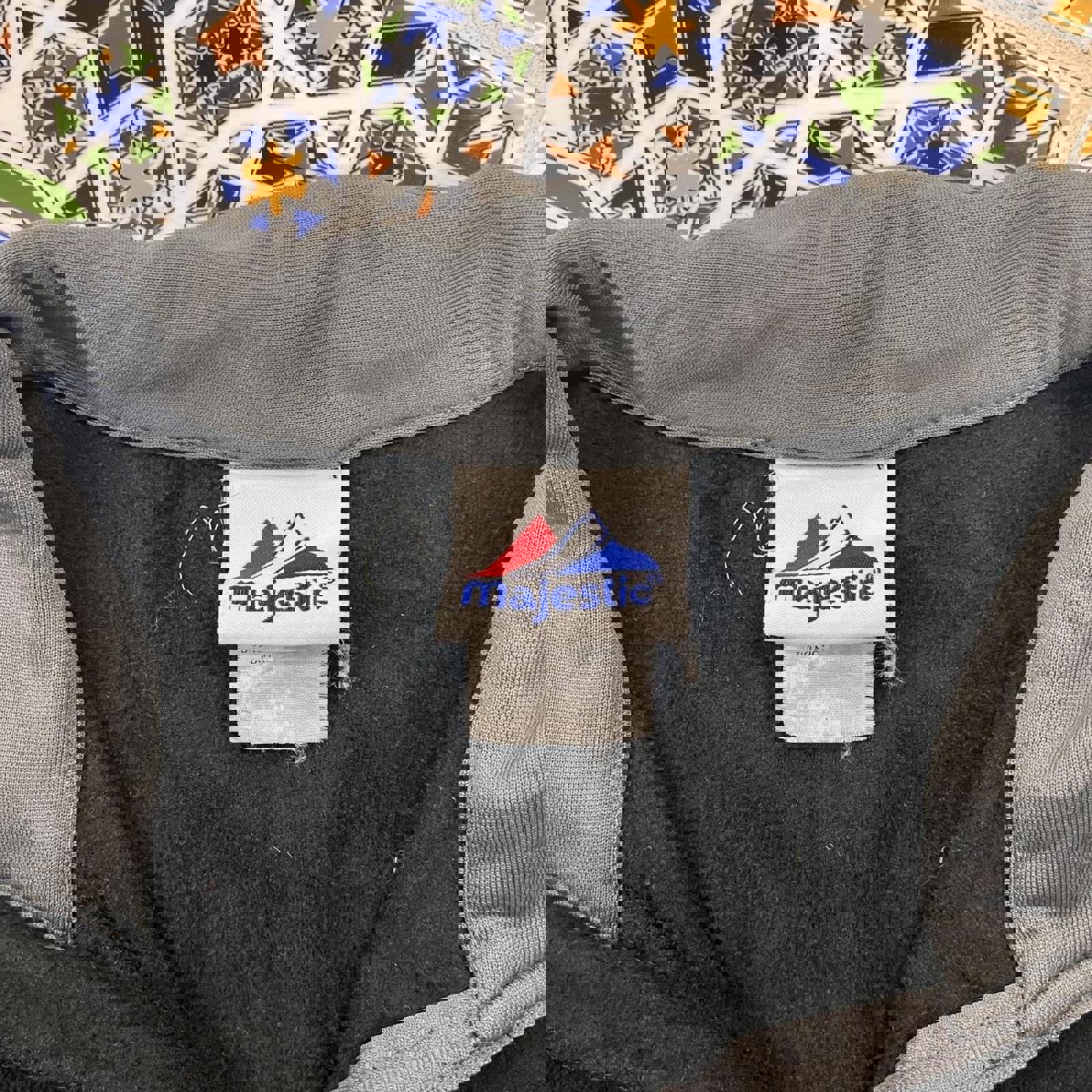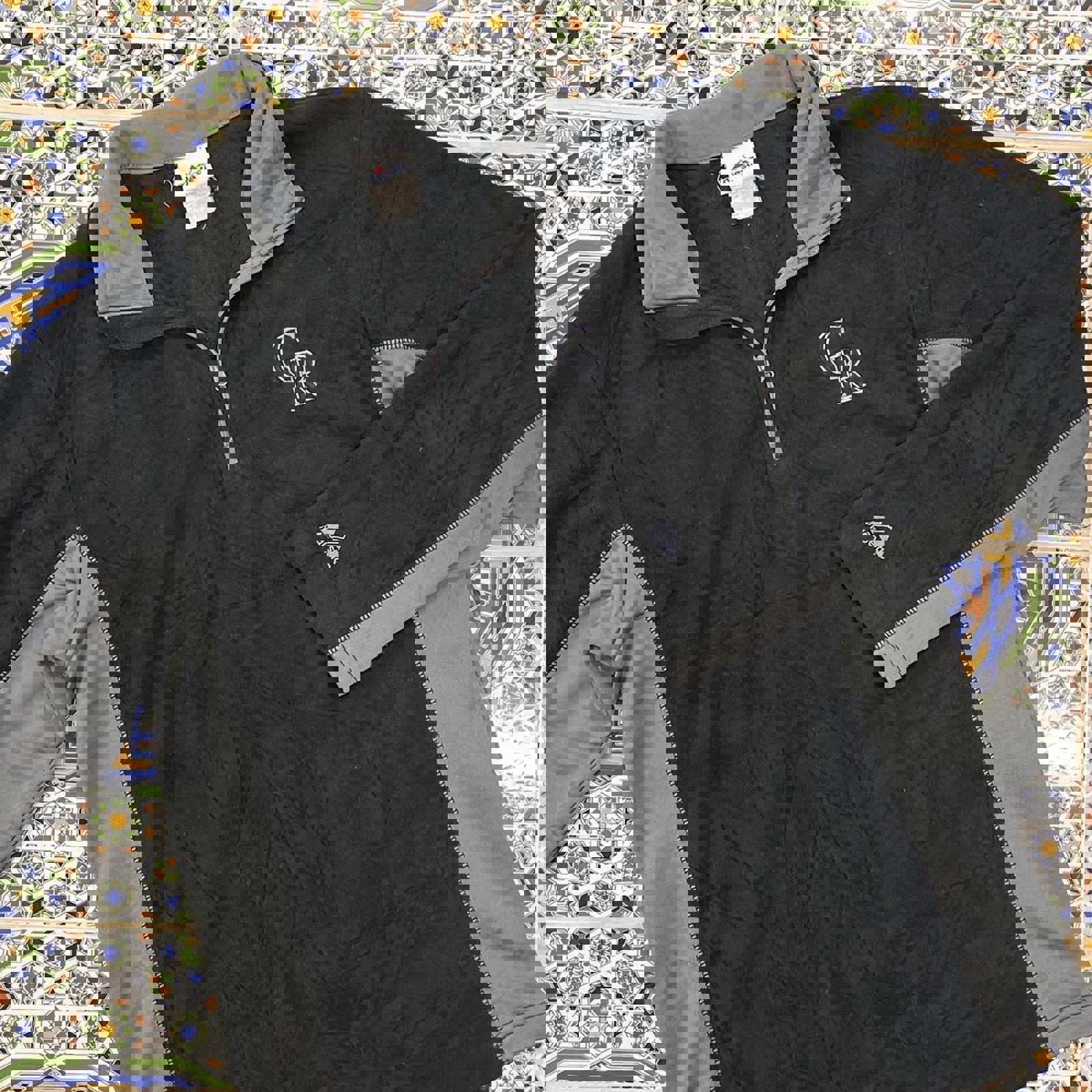 black and grey majestic fleece 1/4 zip jumper with a grey embroidered CR colorado rockies MLB logo on the chest and a grey embroidered majestic logo on the wrist