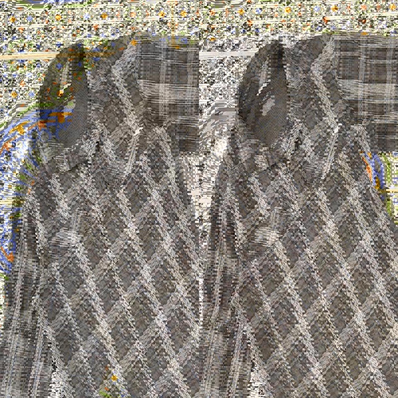 black, grey and navy checkered omi-shade columbia button up shirt with a columbia tab on the chest pocket