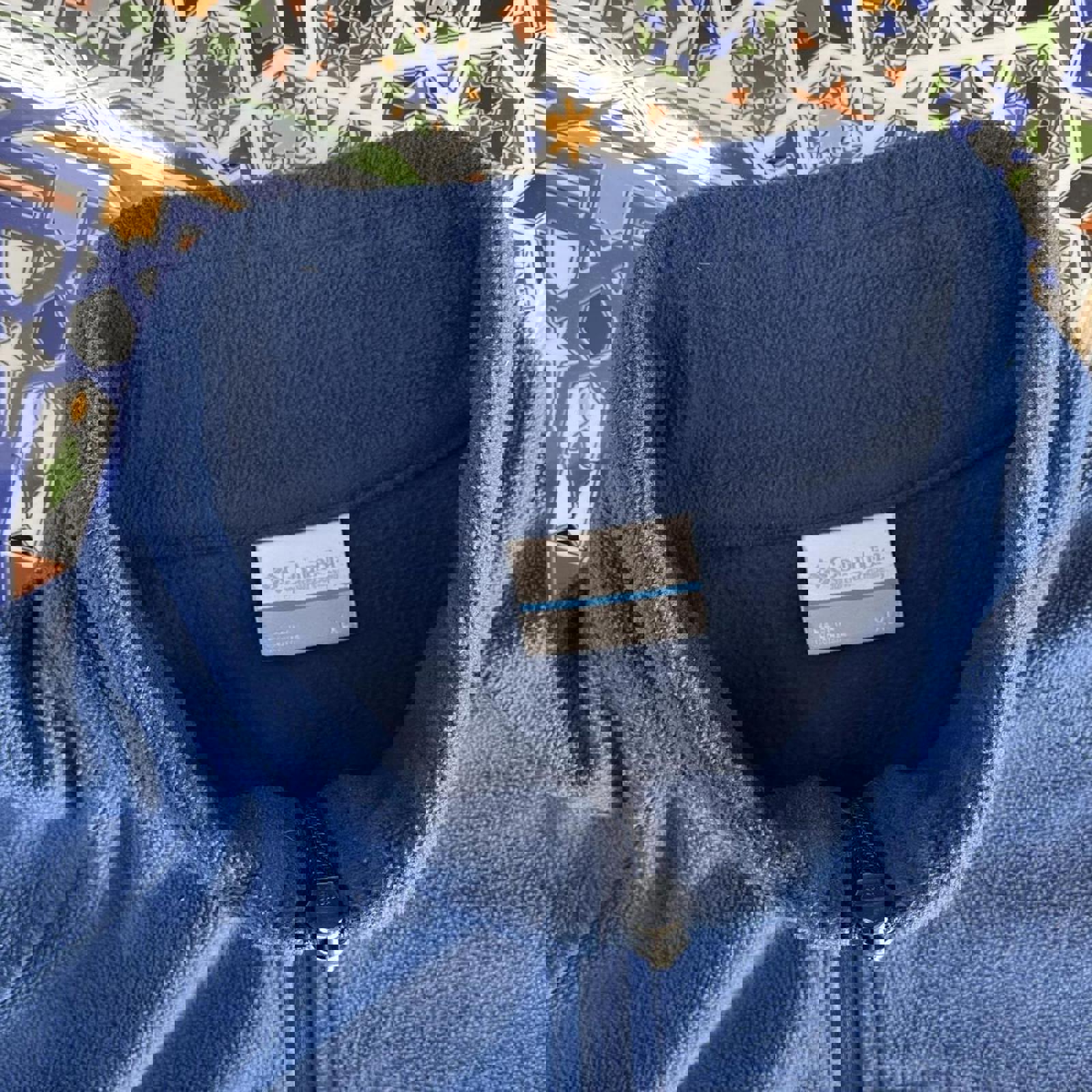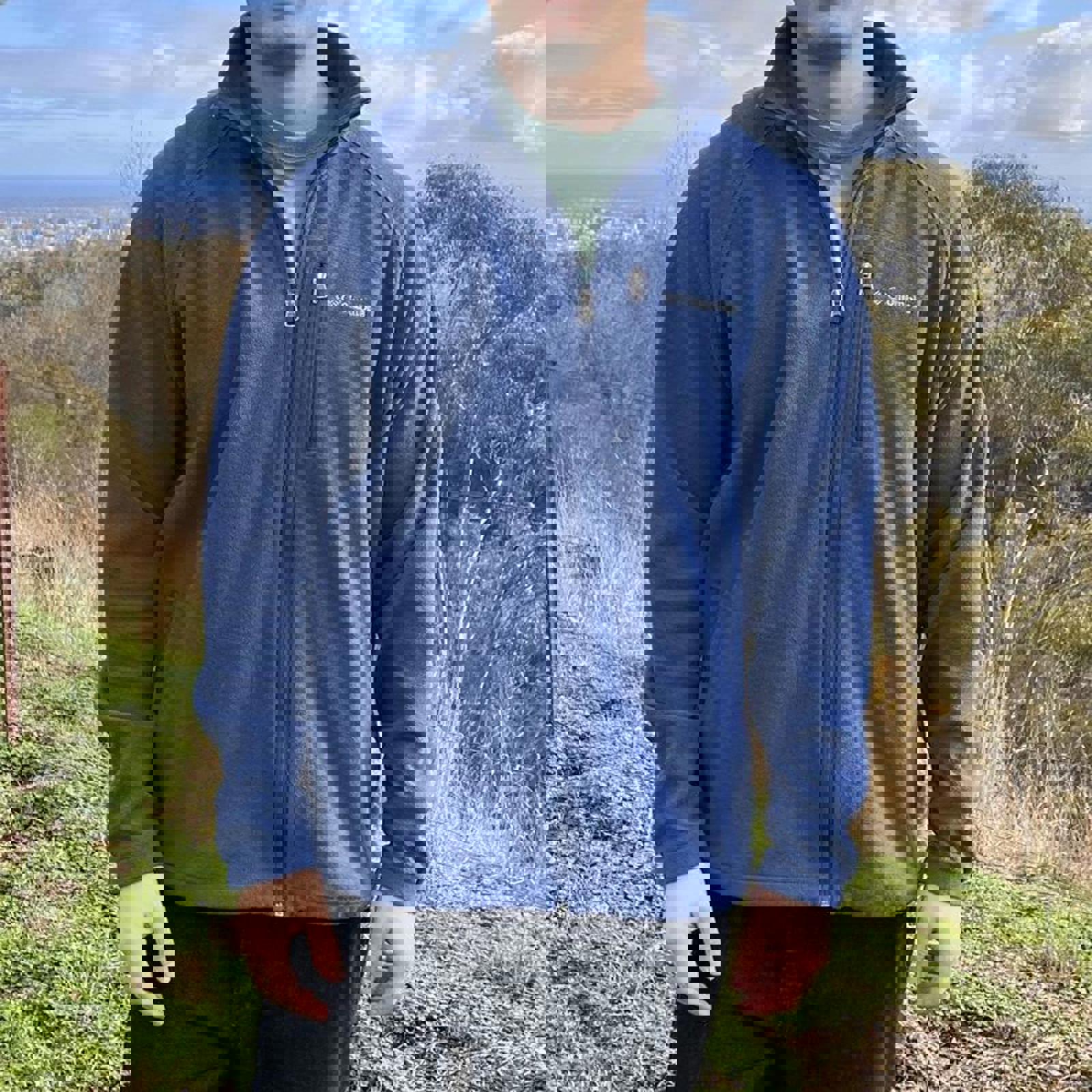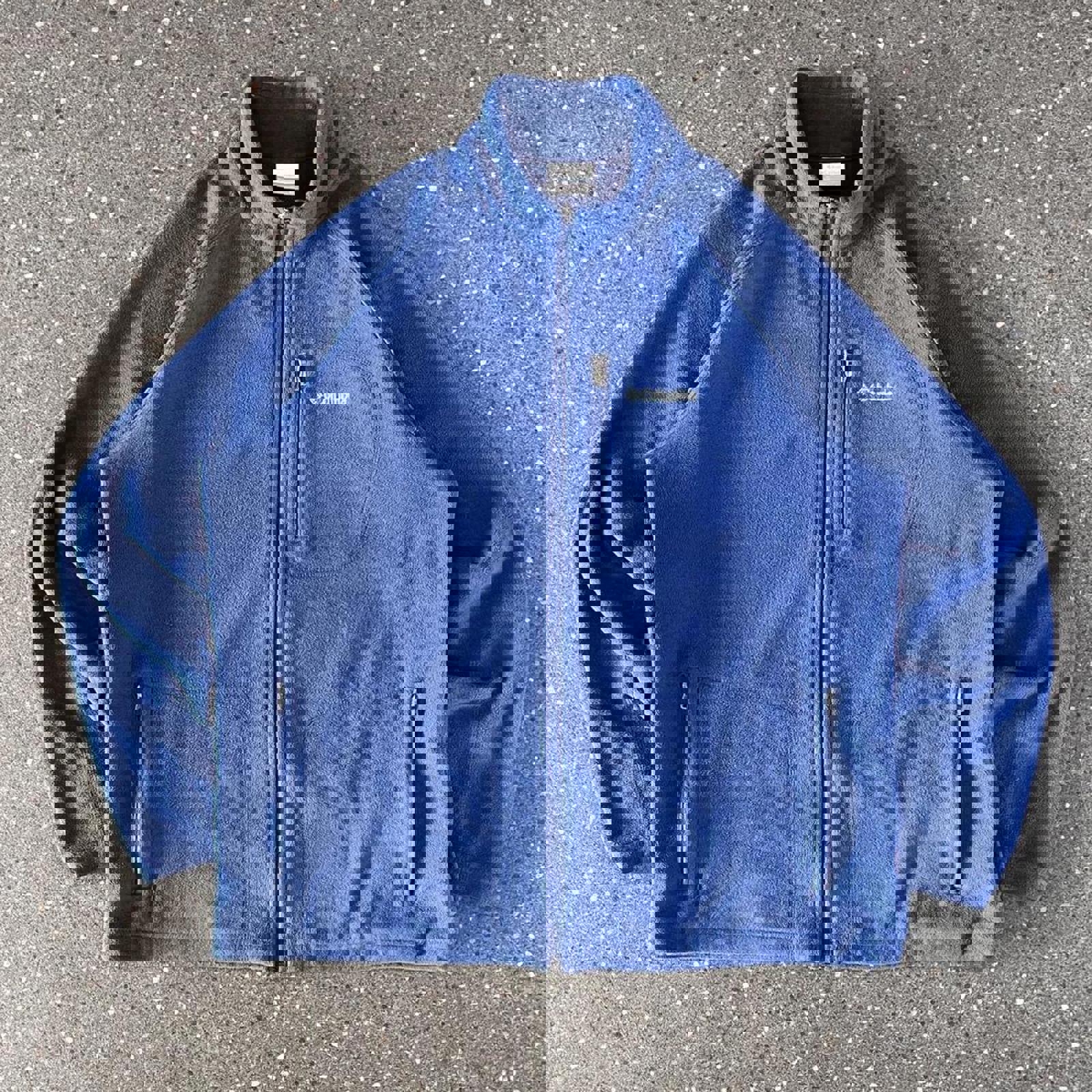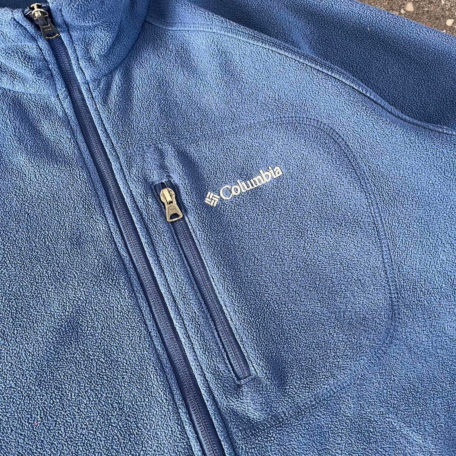 Blue fleece Columbia jacket with a zippered chest pocket and embroidered white Columbia spell out on the chest