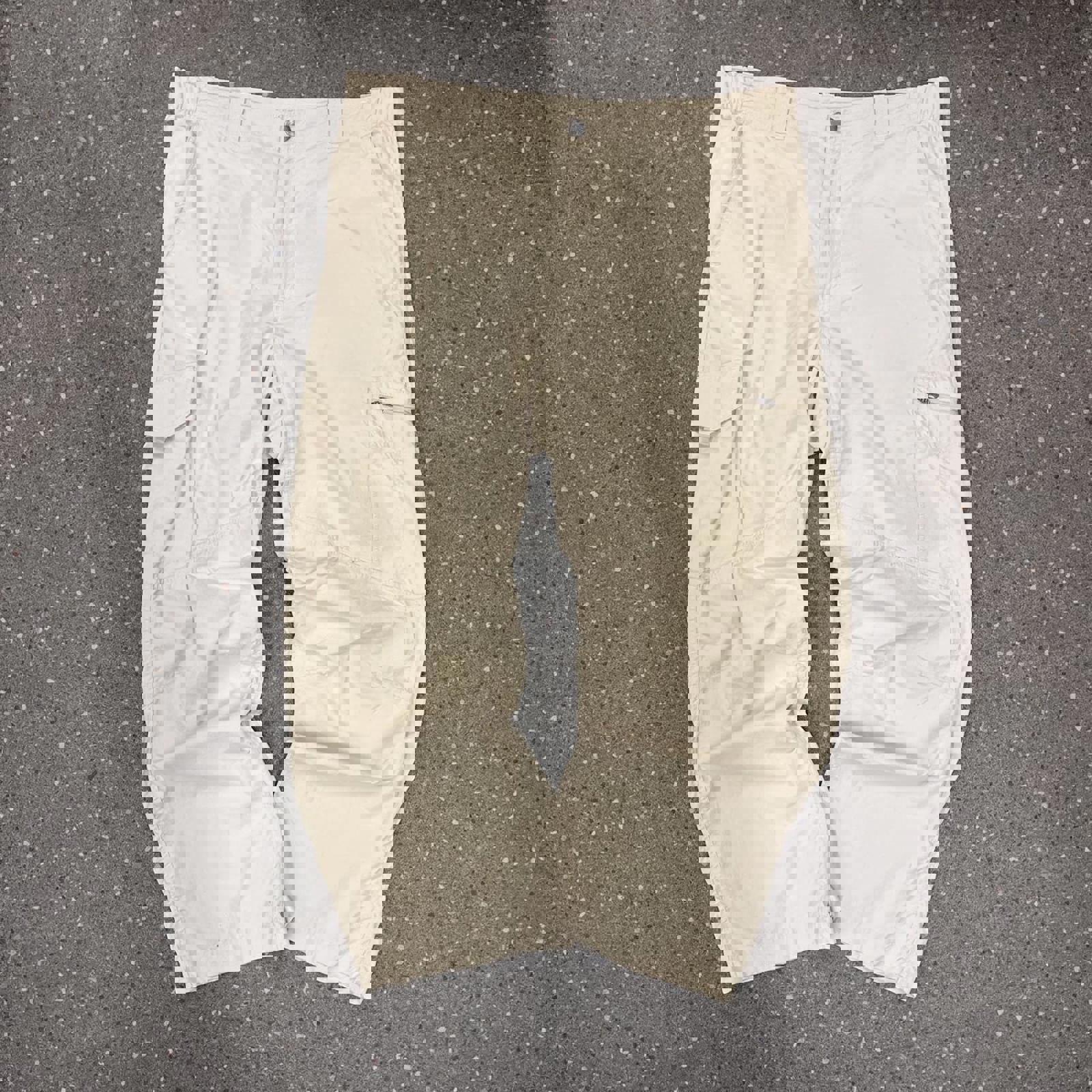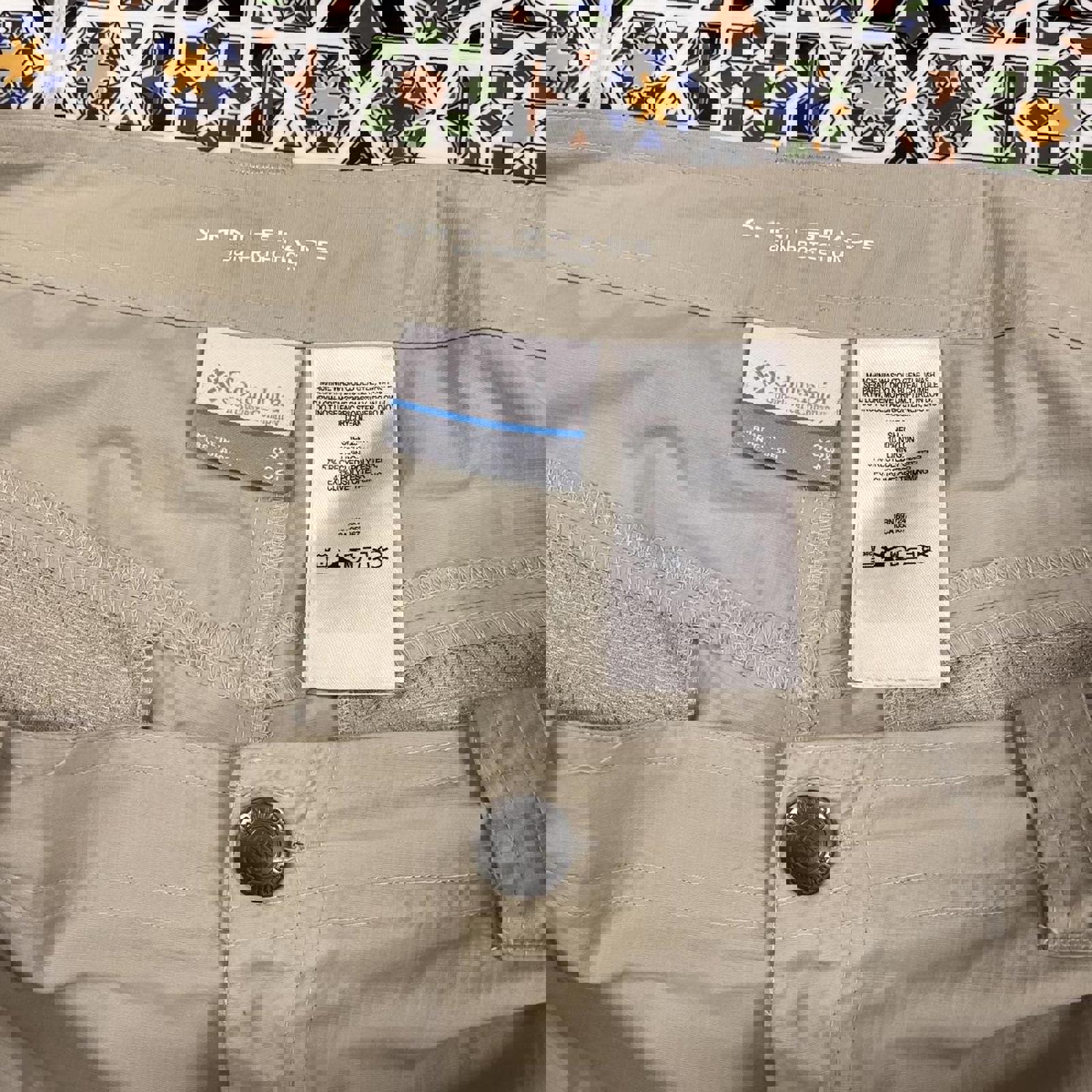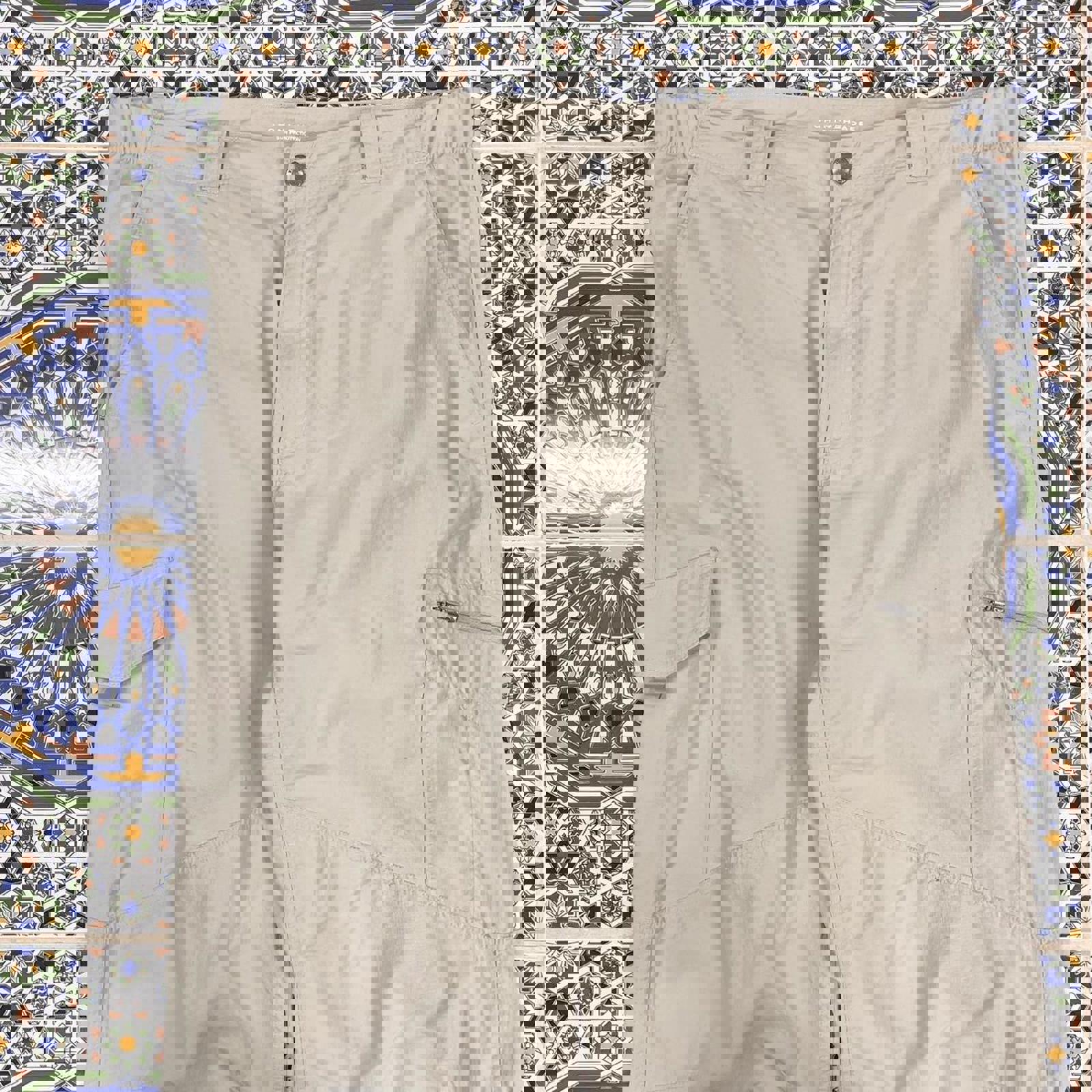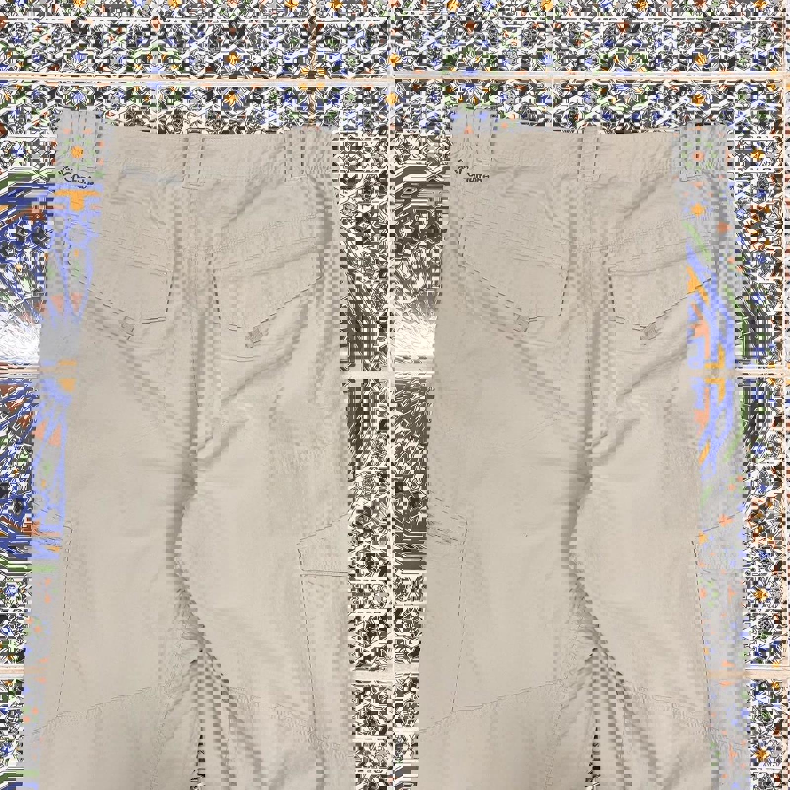 Beige Columbia adventure wear pants with cargo style pockets and a grey embroidered Columbia on the back hip